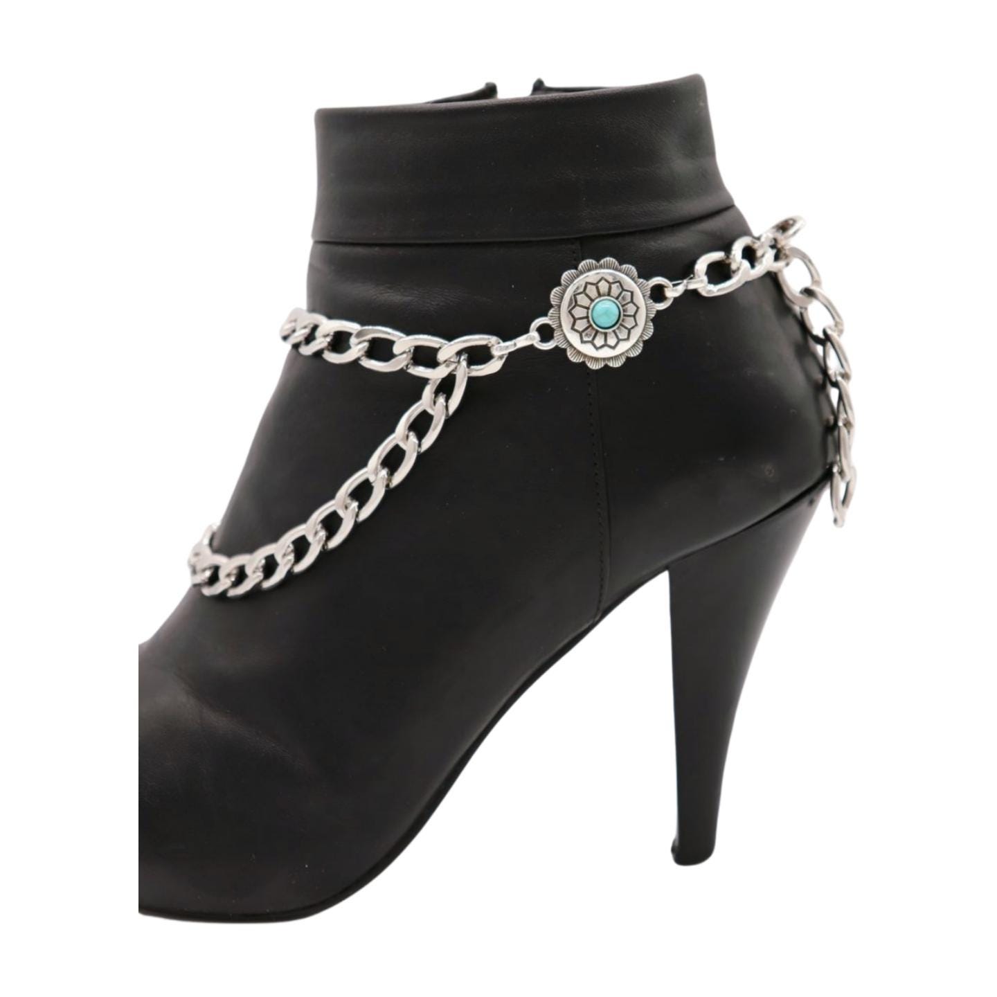 Turquoise Flower Boot Chains: Silver Western Cowgirl Boot Jewelry (Pair)