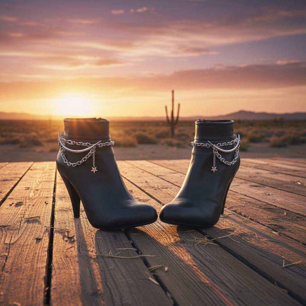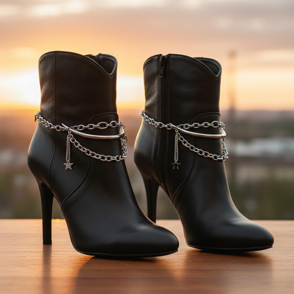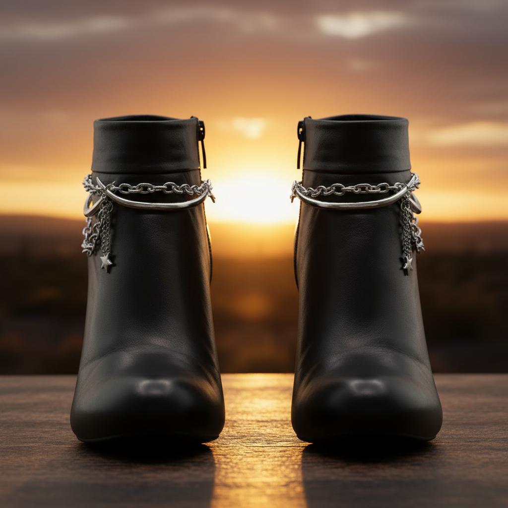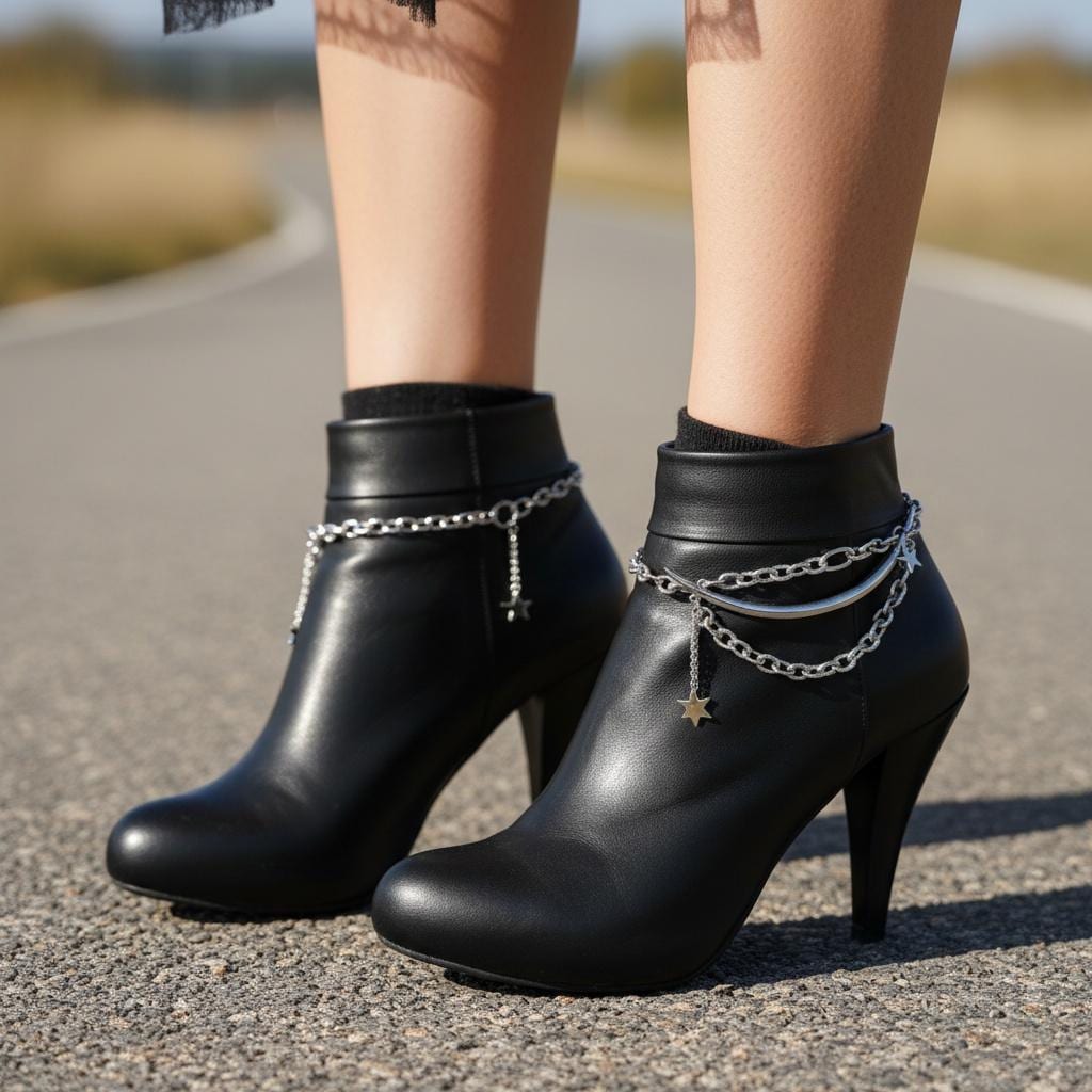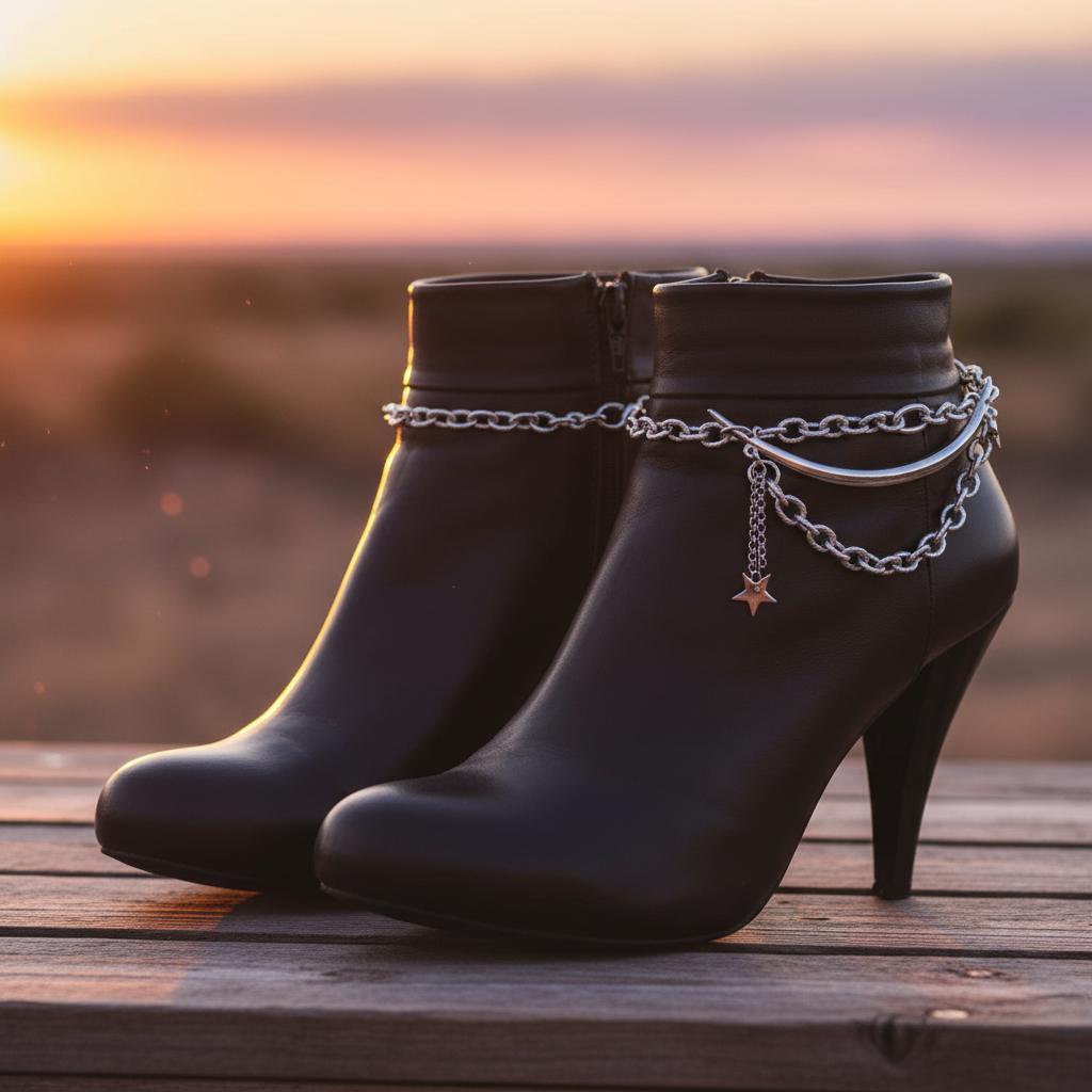 Silver Boot Chain Anklet Set: Star & Moon, Western Biker Jewelry (Pair)