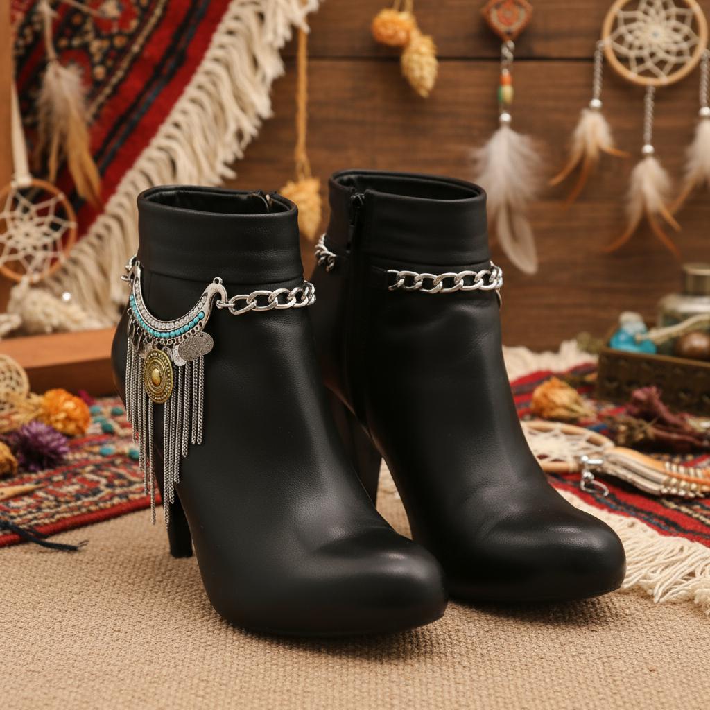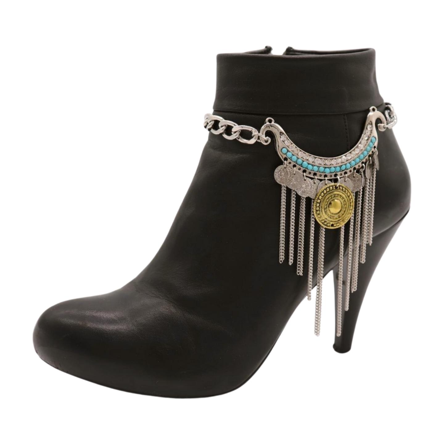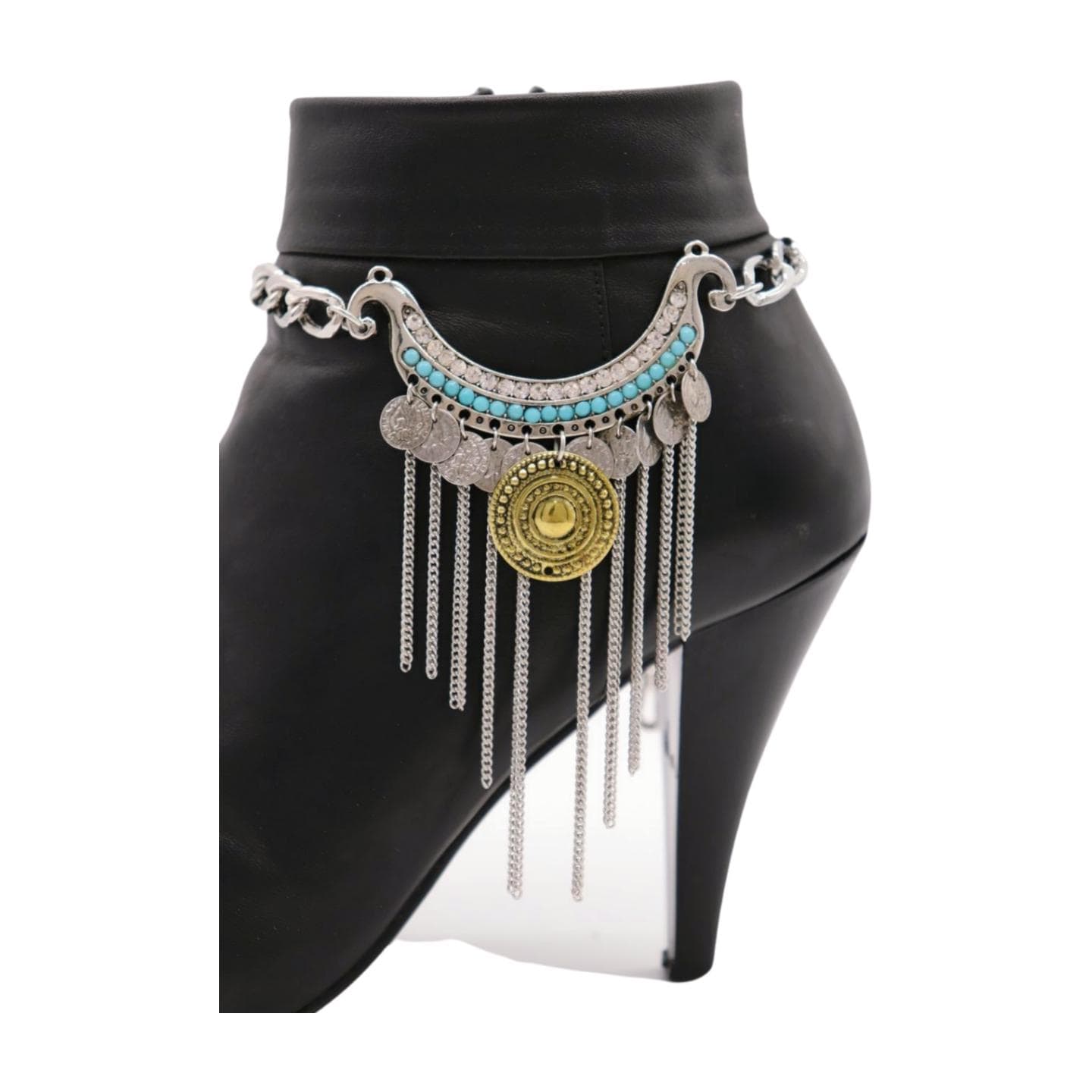 Women 2PCS Silver Metal Boot Chain Bracelet Shoe Anklet Turquoise Ethnic Charm Set Fashion Jewelry - A PAIR BC23