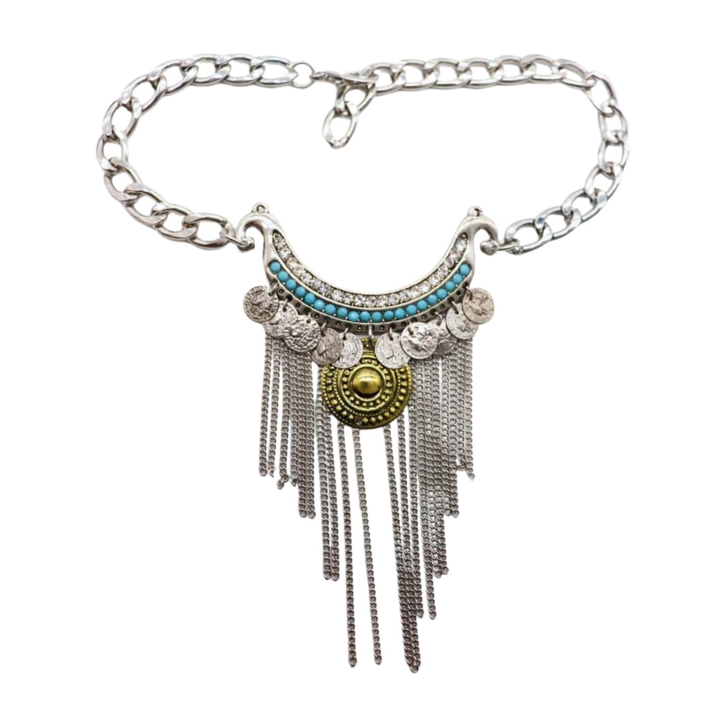 Color: Silver metal chain links and charms + silver rhinestones + turquoise blue beads +antique gold coin charm (turquoise ethnic fringes)