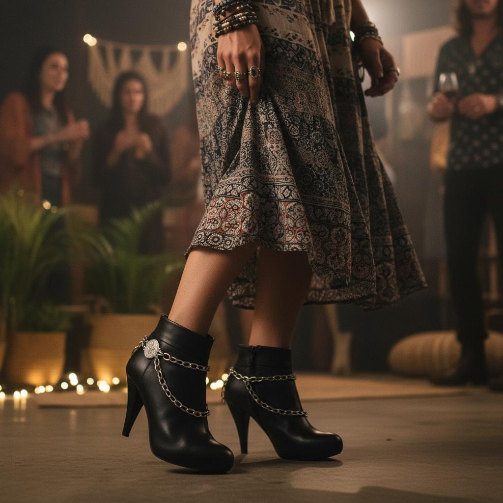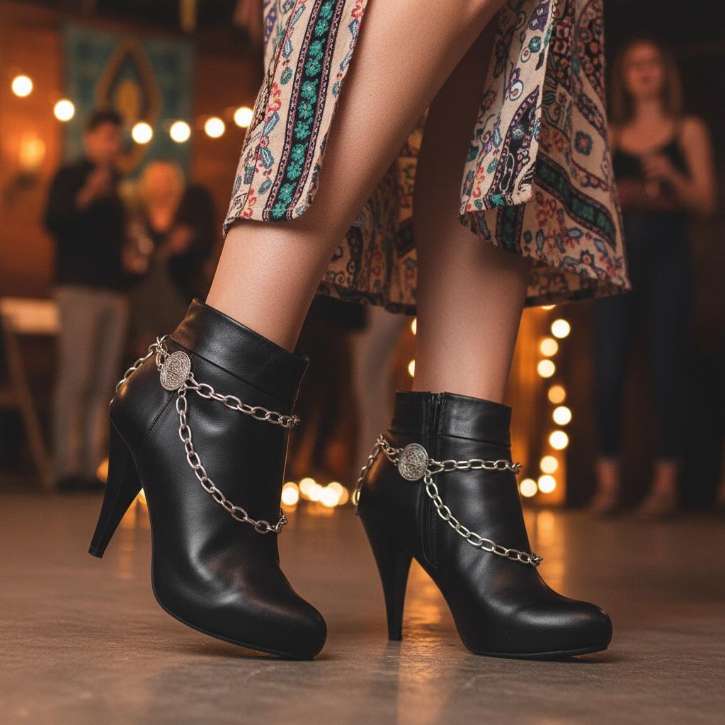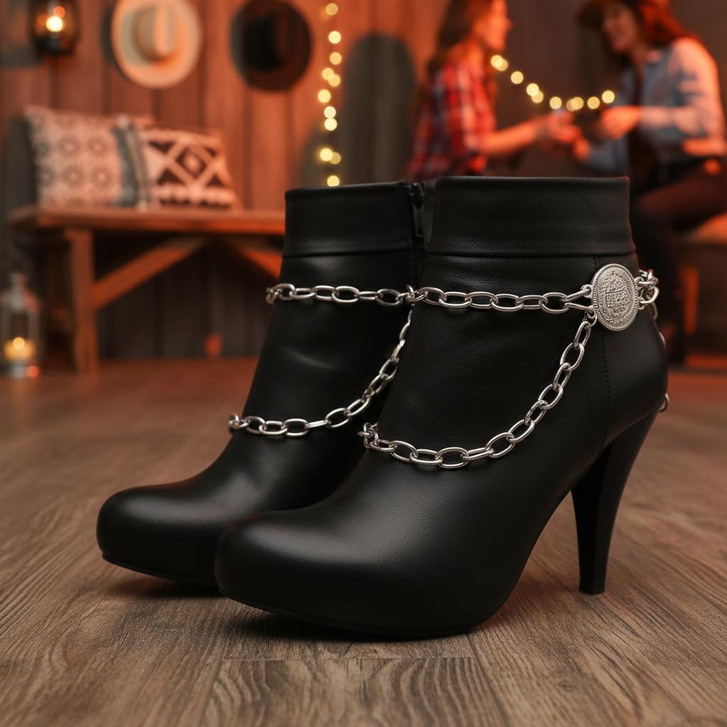 Double-Sided Coin Detail: Etched coin medallions and layered silver-tone chains add refined Western-boho sparkle to ankle booties and cowboy boots.