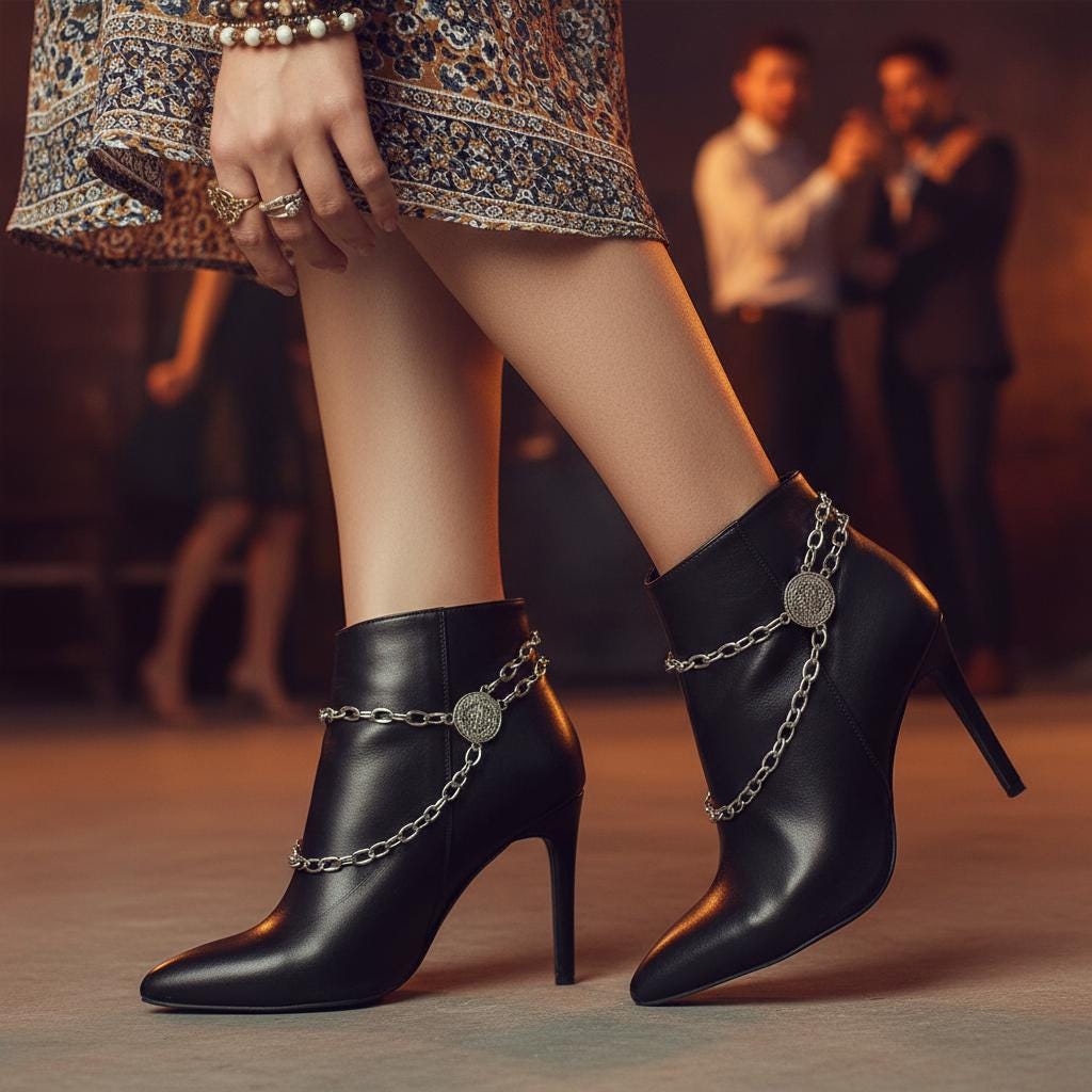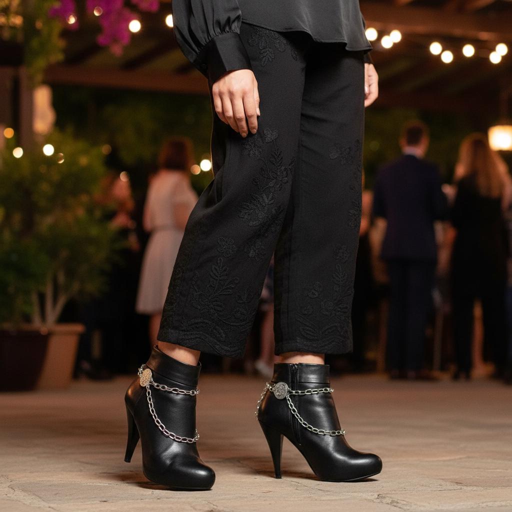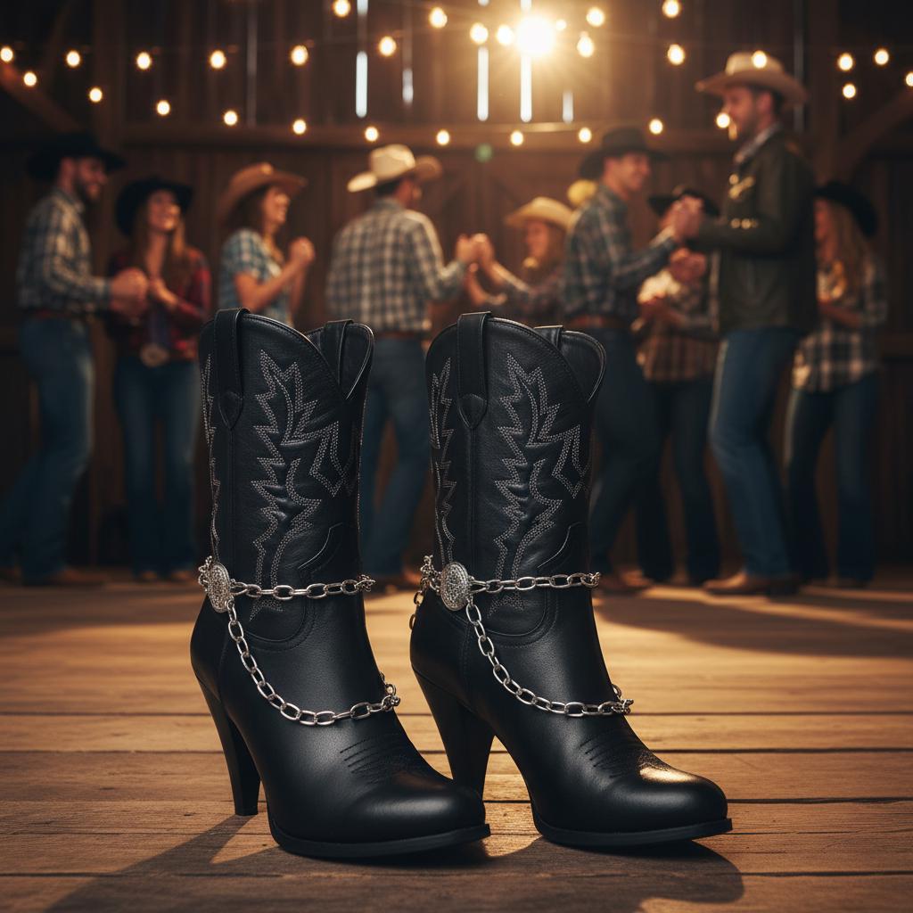 Double-Sided Coin Detail: Etched coin medallions and layered silver-tone chains add refined Western-boho sparkle to ankle booties and cowboy boots.