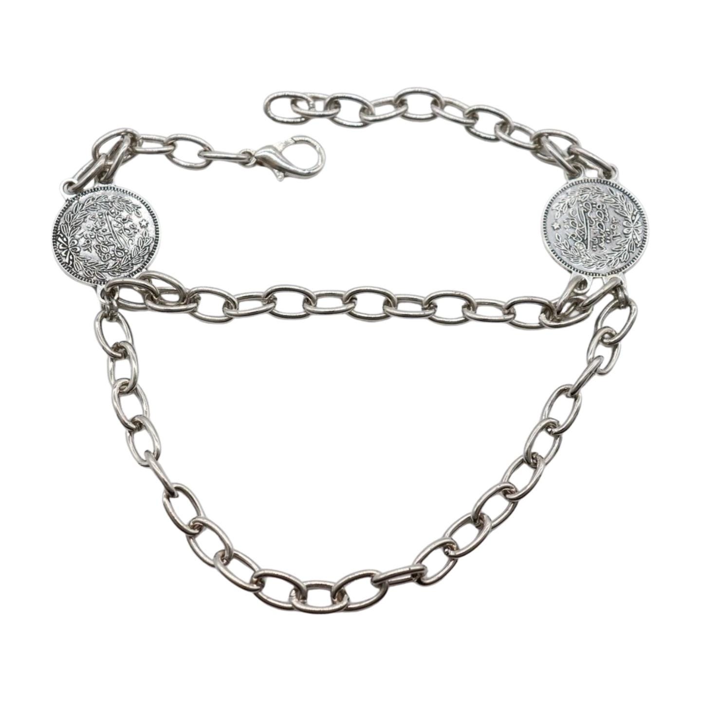 Women 2PCS Silver Metal Boot Chain Bracelet Shoe Anklet Double Sided Ethnic Coin Charm Set Fashion Jewelry - A PAIR BC37