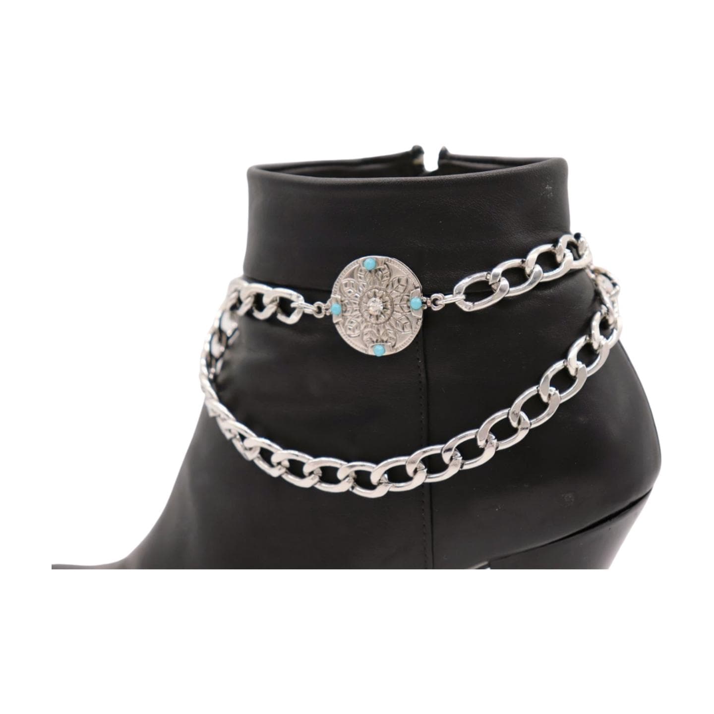 turquoise coin boot chain women silver pair western boot jewelry concho anklet adjustable 11 15 inch cowboy bootie accessories boho festival rodeo concert party set shoe charm southwest double chain stylish gift