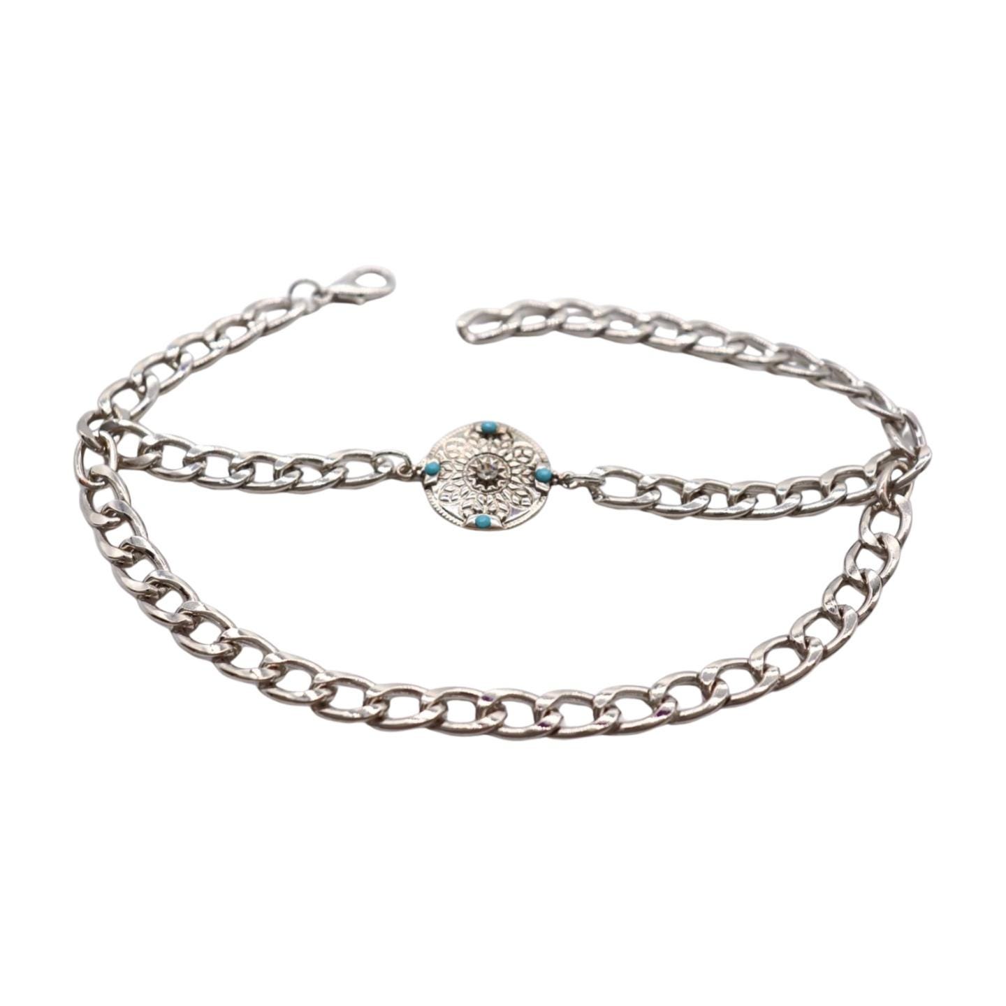 Women’s 2PCS Silver Boot Chain Bracelet Set – Turquoise Coin Concho Charm, Adjustable 11–15 in, Pair For Both Boots, Western/Boho/Biker Festival Shoe Anklet Jewelry – BC38