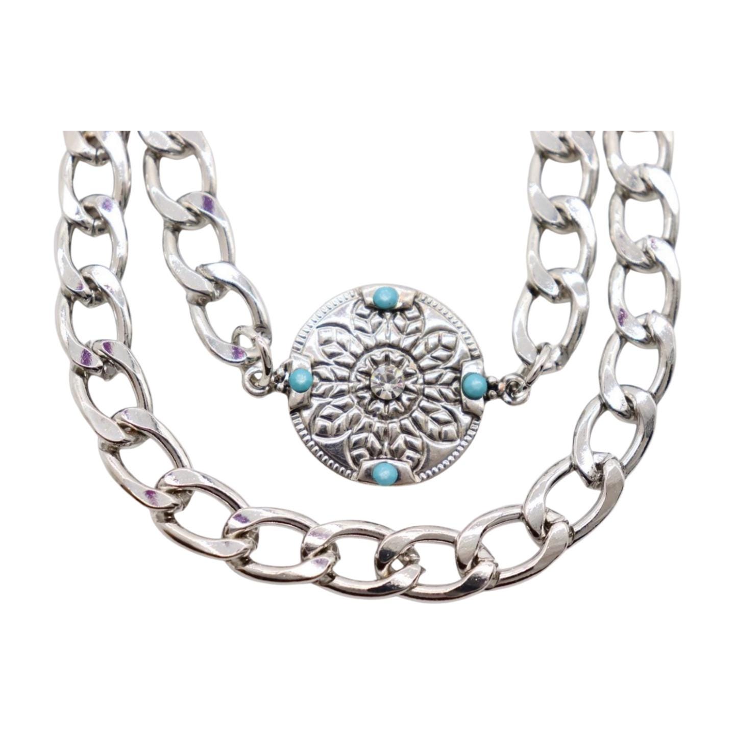 Color: Silver metal chain links and charms + turquoise blue color beads + silver rhinestone (wave + turquoise coins)