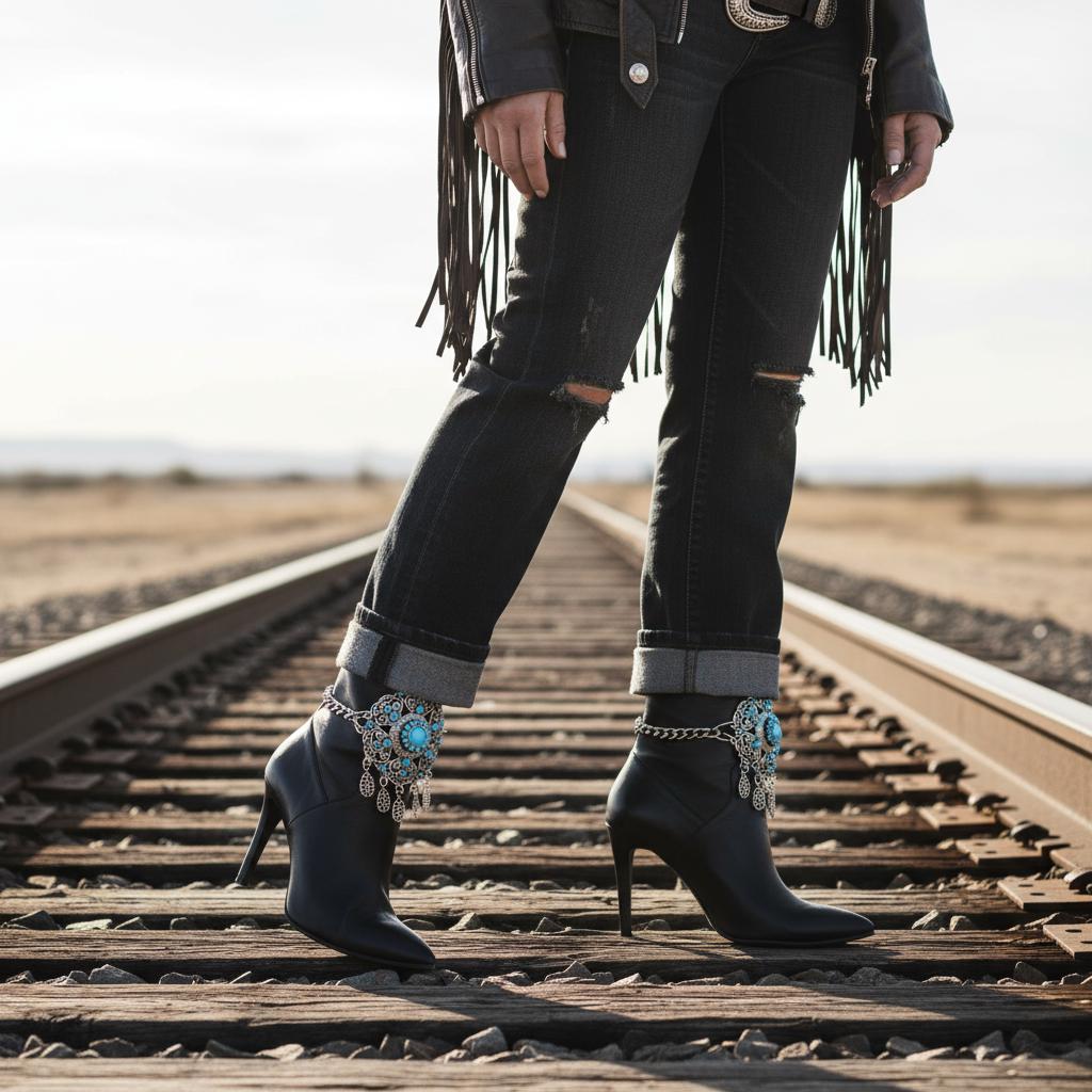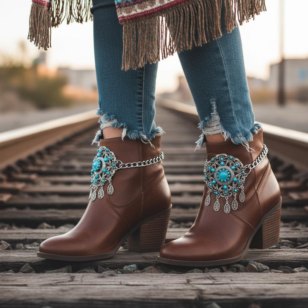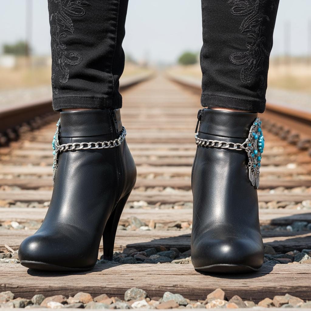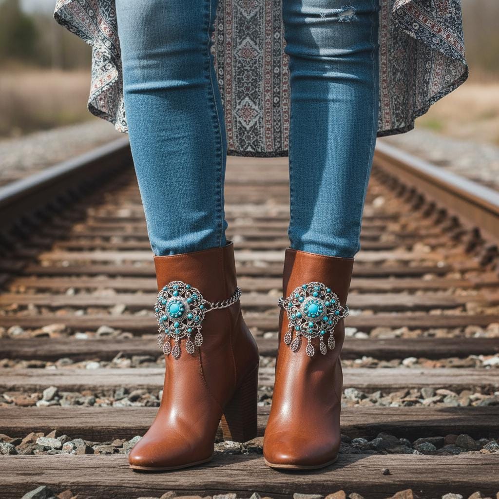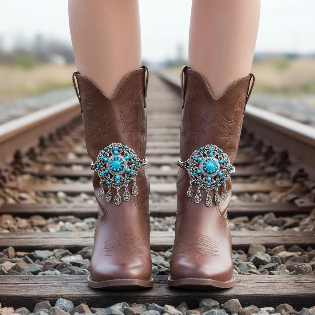 Your boots called—they want a main-character moment. Meet BC40, the show-stopping boot jewelry that turns “nice outfit” into “tell me everything.” The silver double-chain hugs the ankle while a big turquoise flower brings vintage-market vibes and Western energy. Teardrop dangles add playful movement with every step.