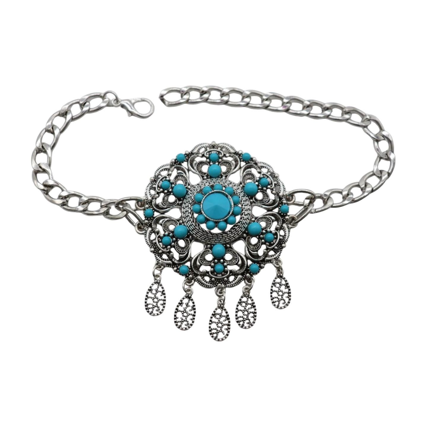 Color: Silver metal chain links and charms + turquoise blue color beads (big ethnic turquoise flower)
