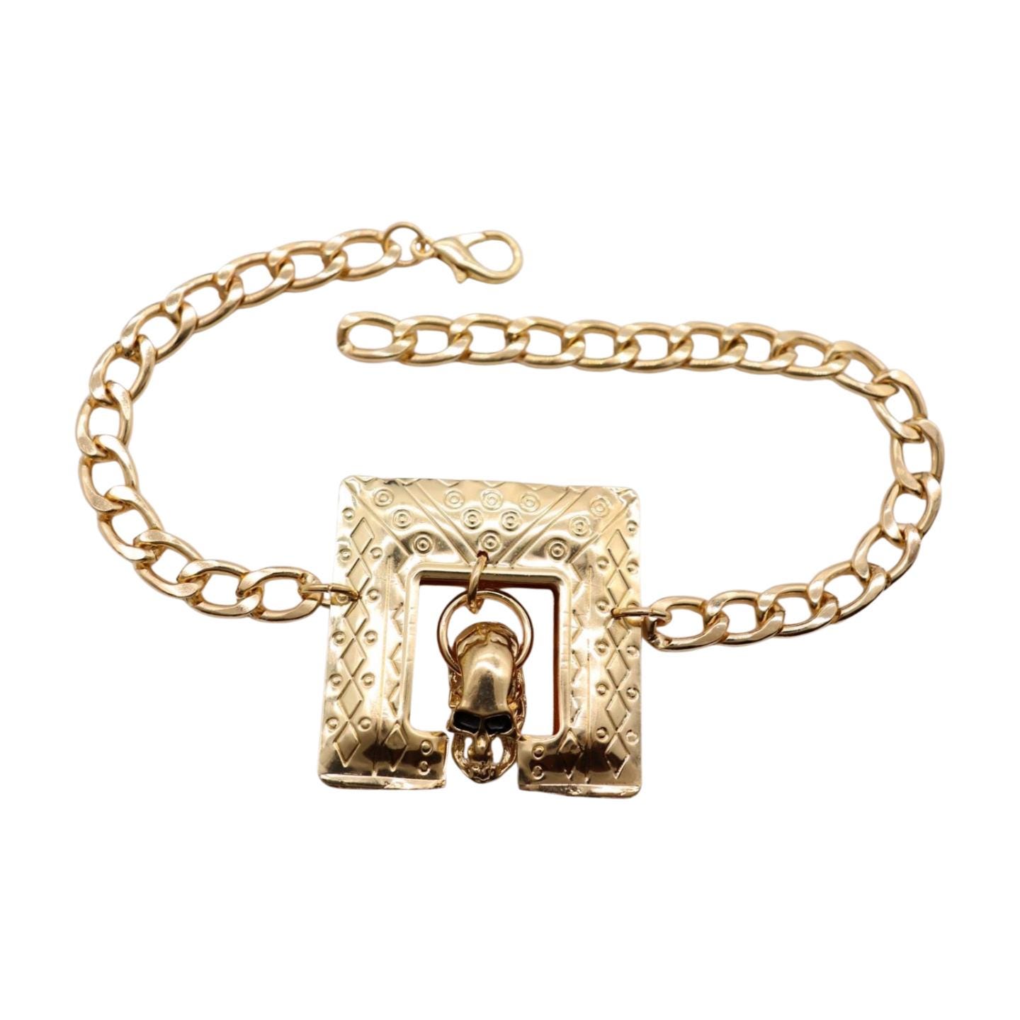 Color: Gold metal chain links and charms (square + skull)