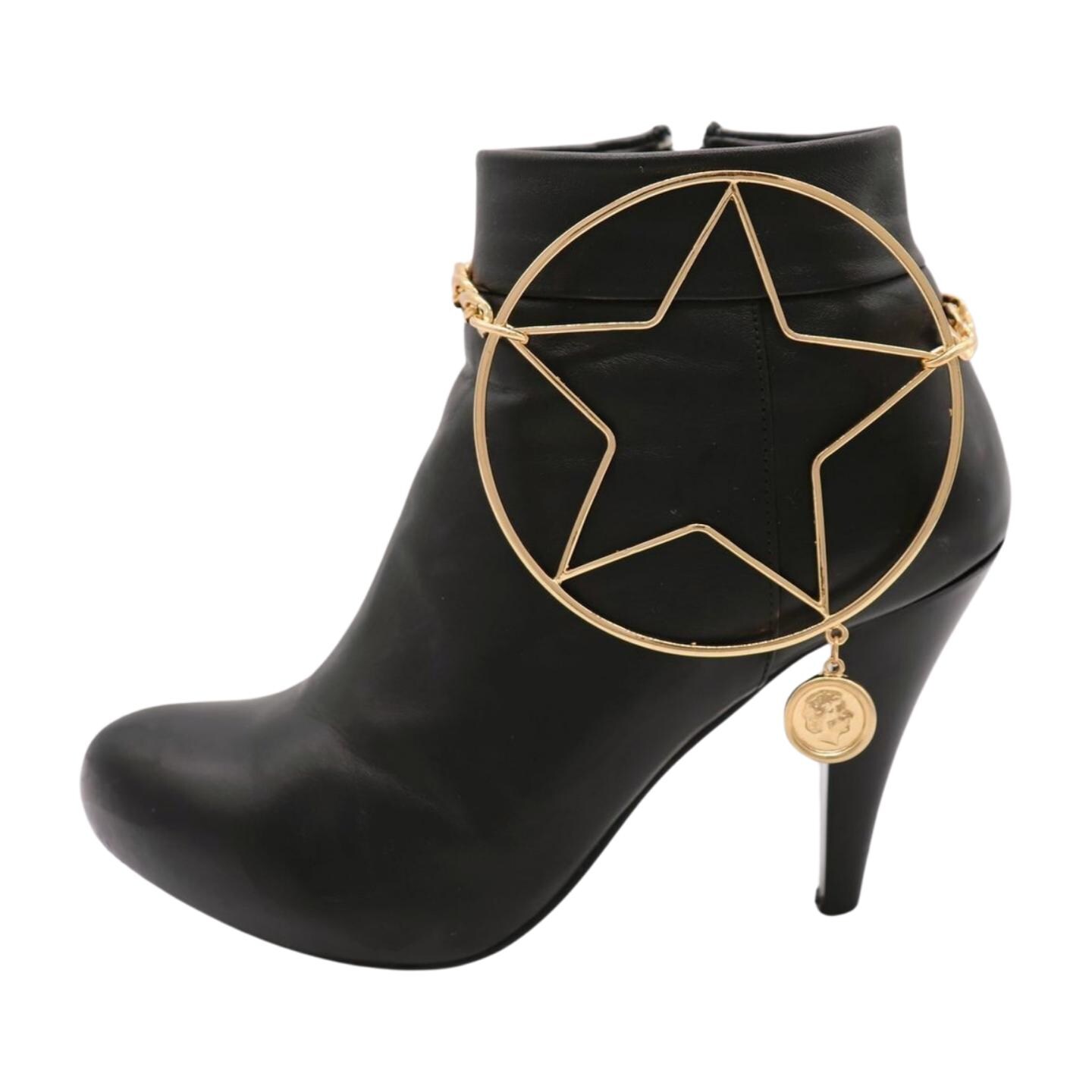 Women 2PCS Gold Metal Boot Chain Bracelet Shoe Anklet Big Star Coin Charm Set Fashion Jewelry - A PAIR BC44