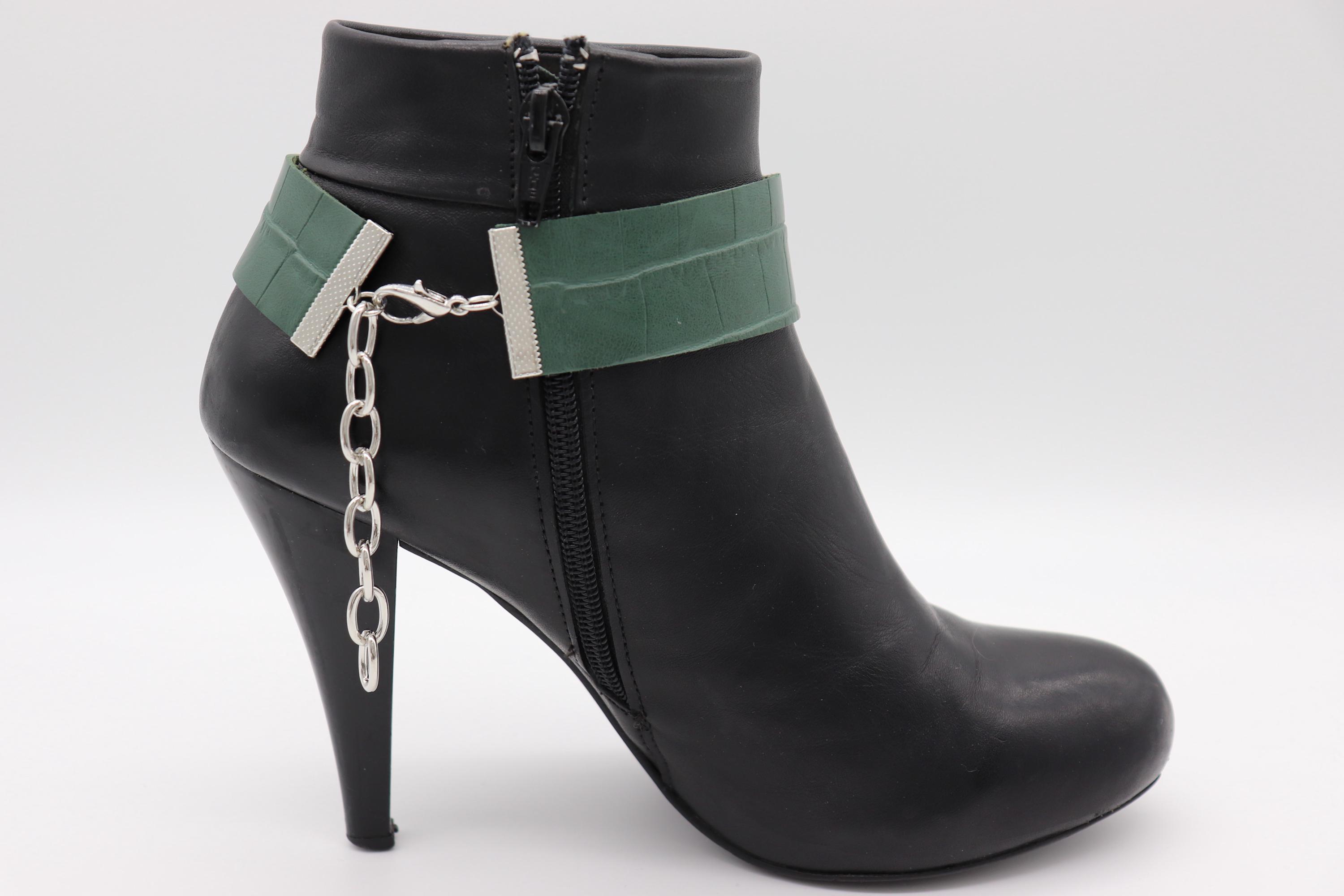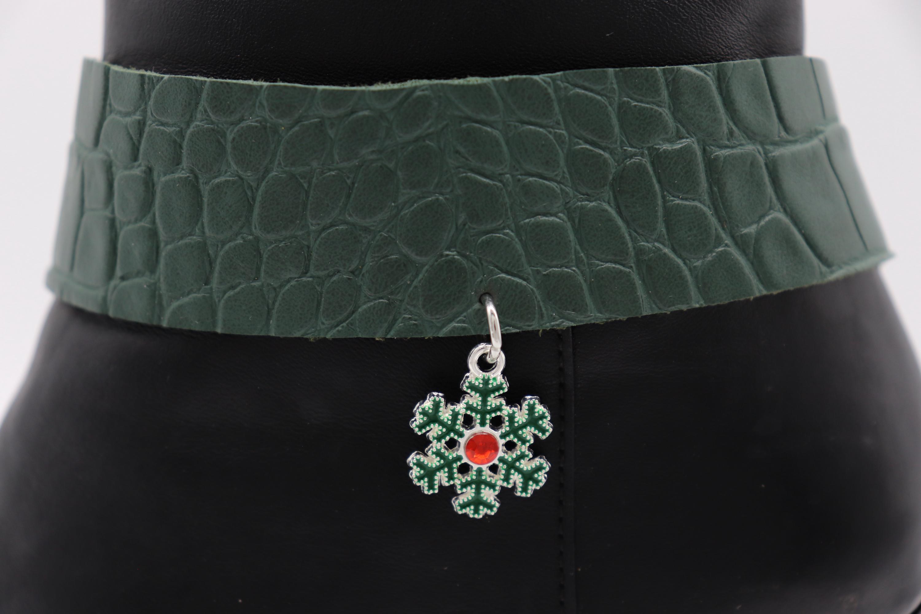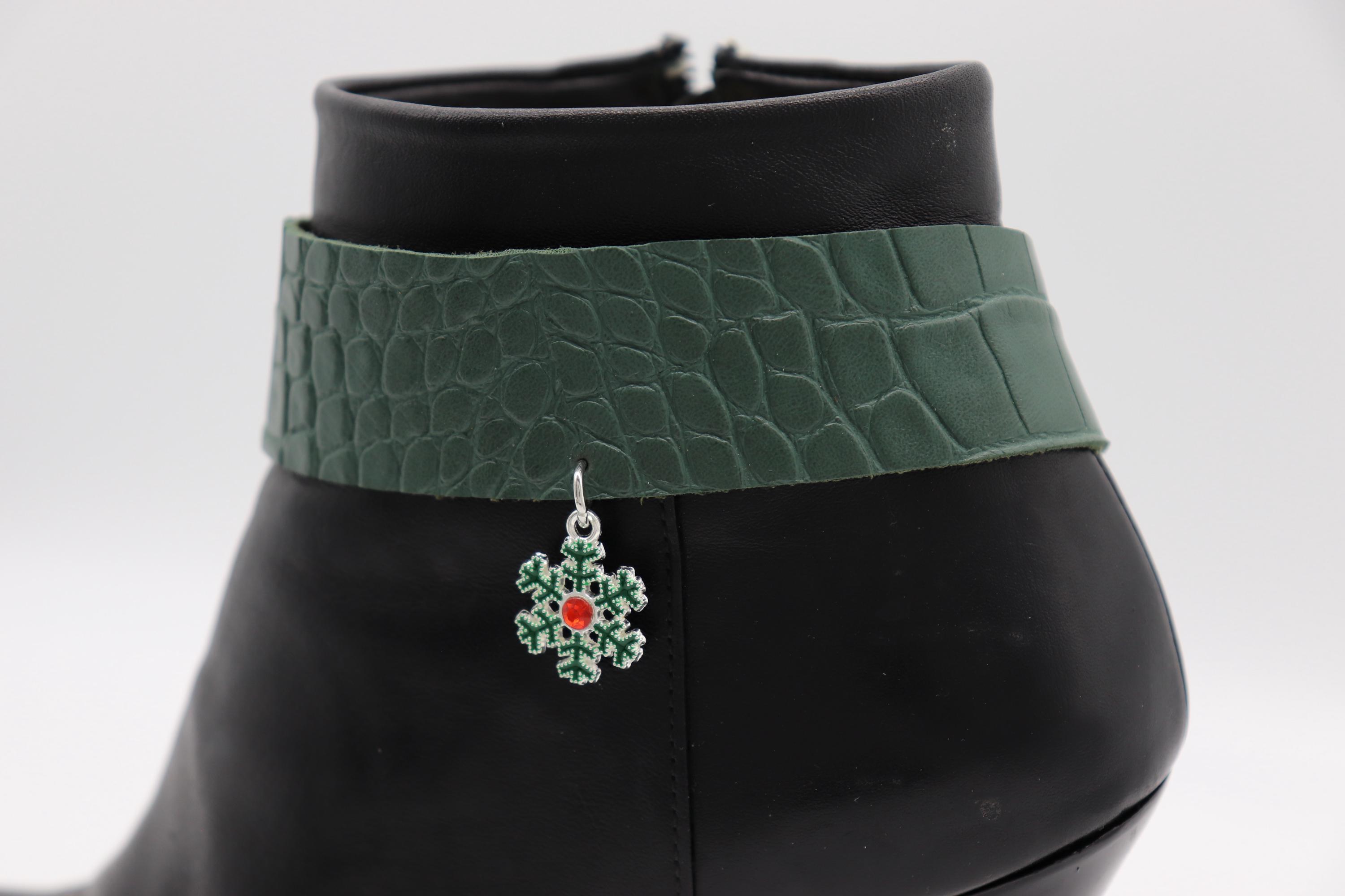 Women’s Boot Chain Bracelet Set – Snowflake Charm & Green Croc-Texture Band, Pair – Adjustable 12–15 in, Limited Edition Handmade In USA, Western Boot Jewelry / Shoe Anklet Gift