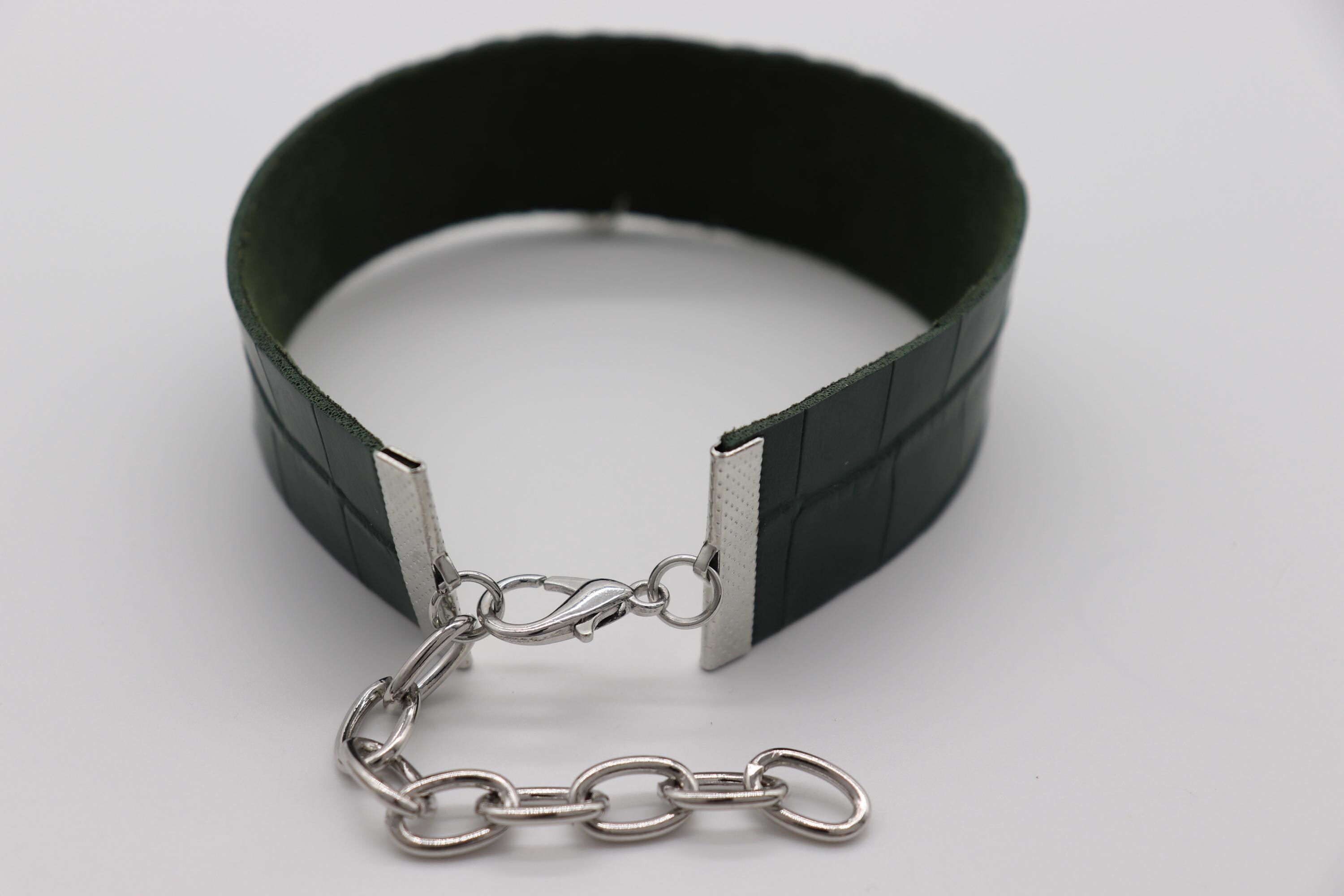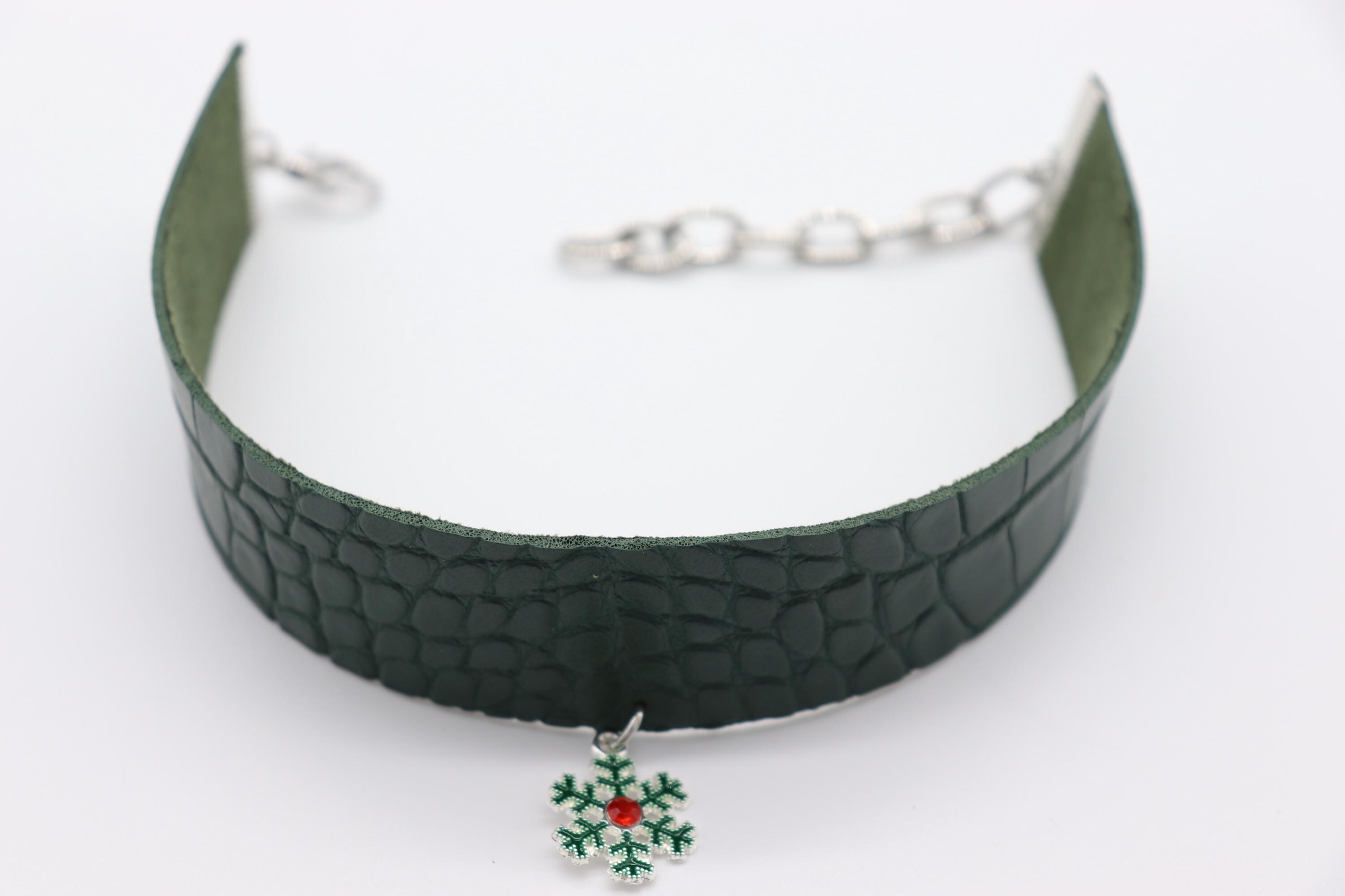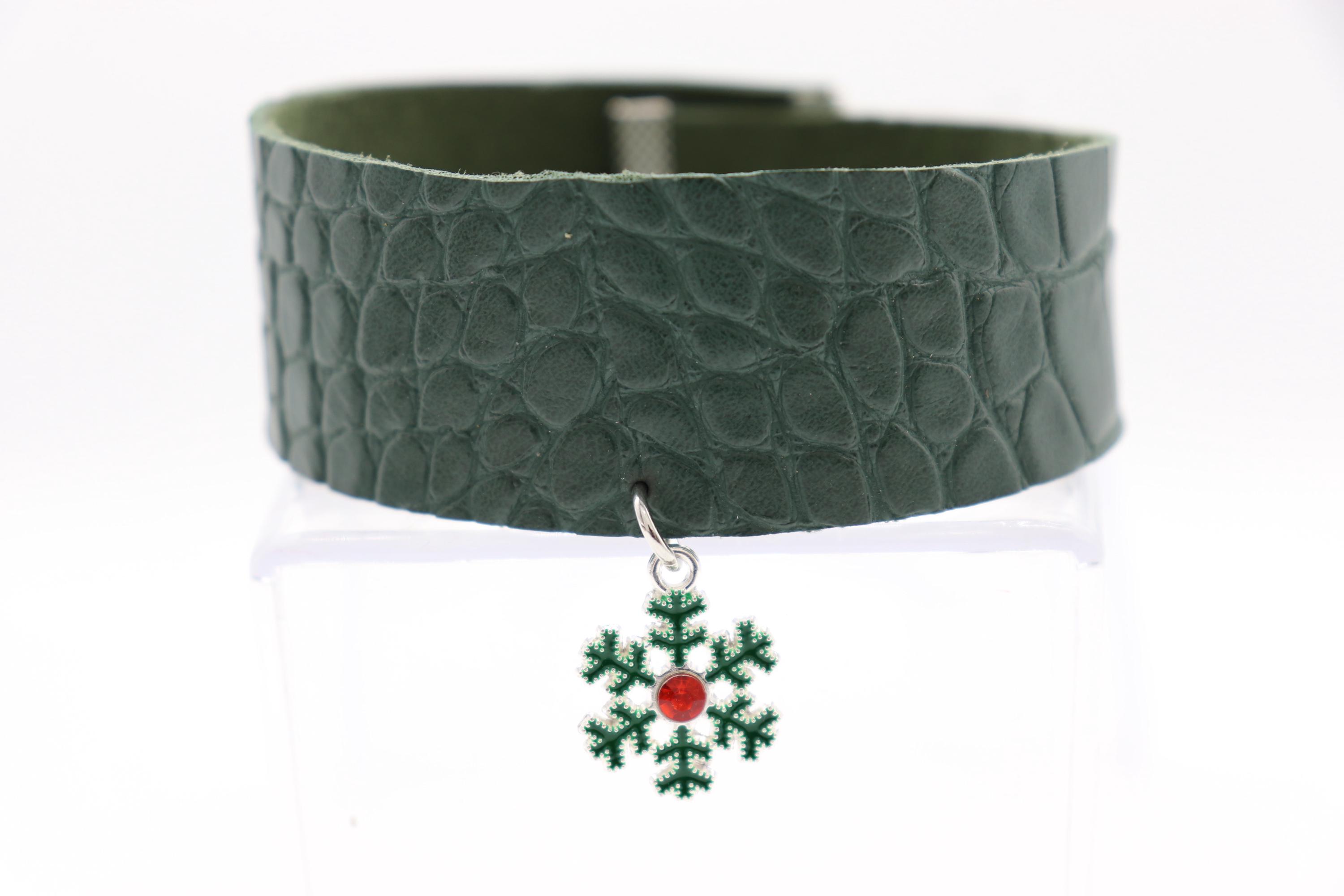 Materials: Faux-leather band (green croc texture), enamel snowflake charm w/ red center, silver-tone hardware, lobster clasp + extender