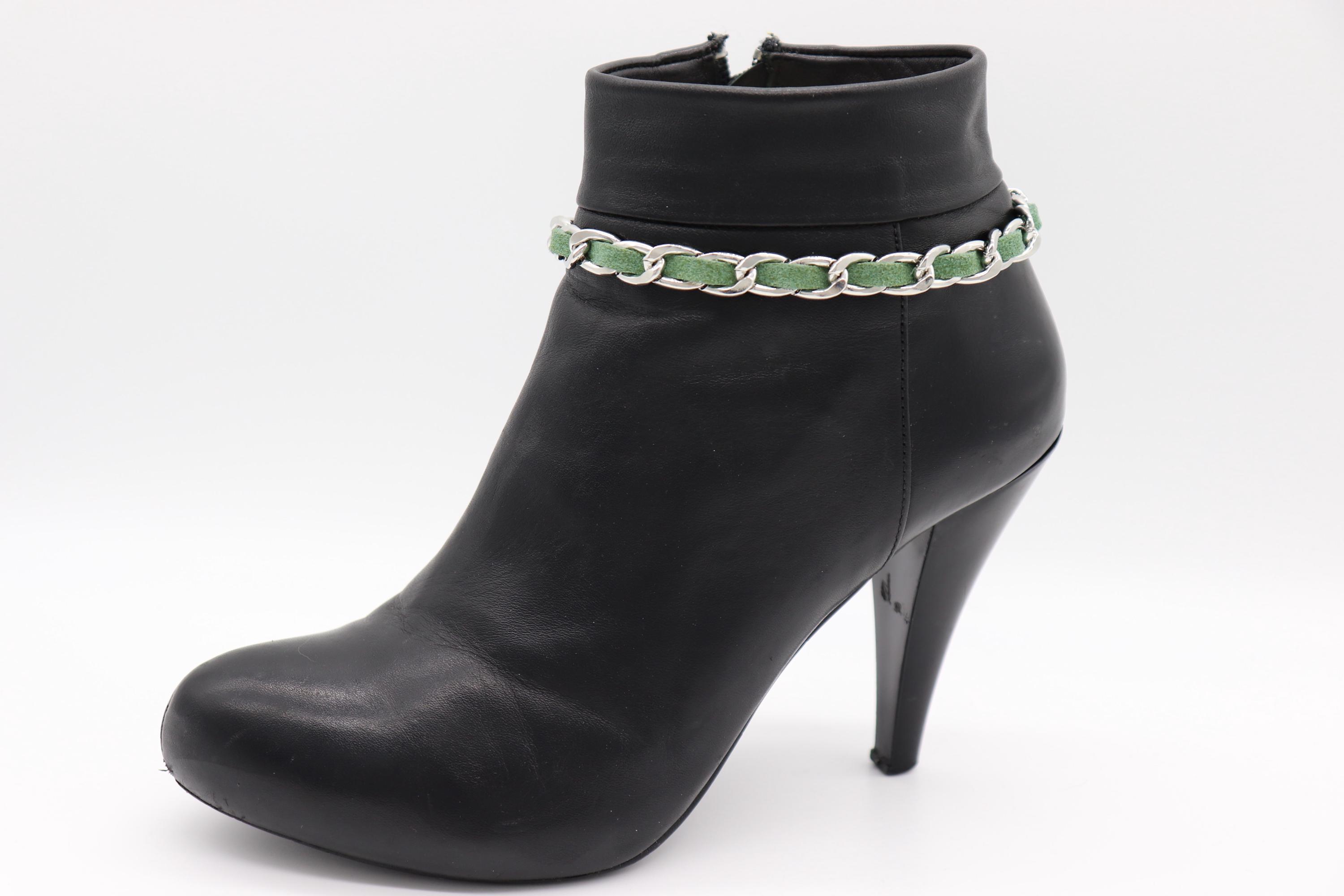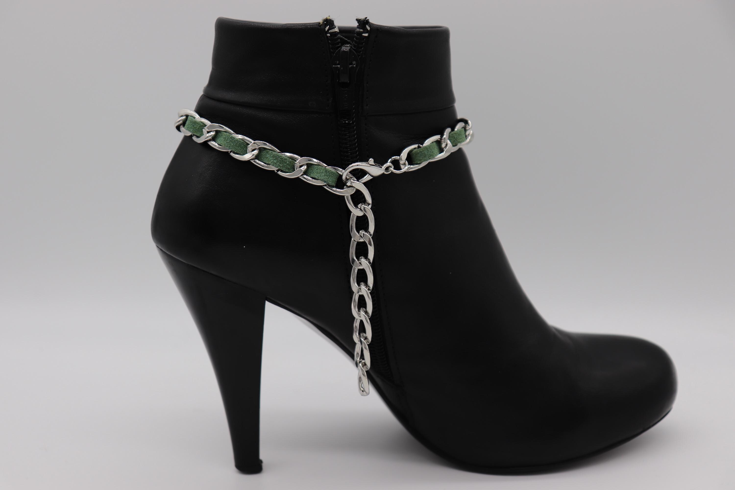 Women 2PCS Silver Metal Boot Chain Bracelet Shoe Anklet Green Faux Leather Band Charm Set Fashion Jewelry - A PAIR BC49
