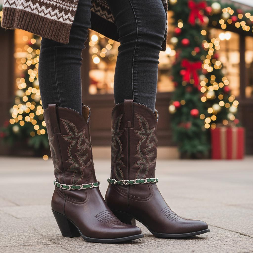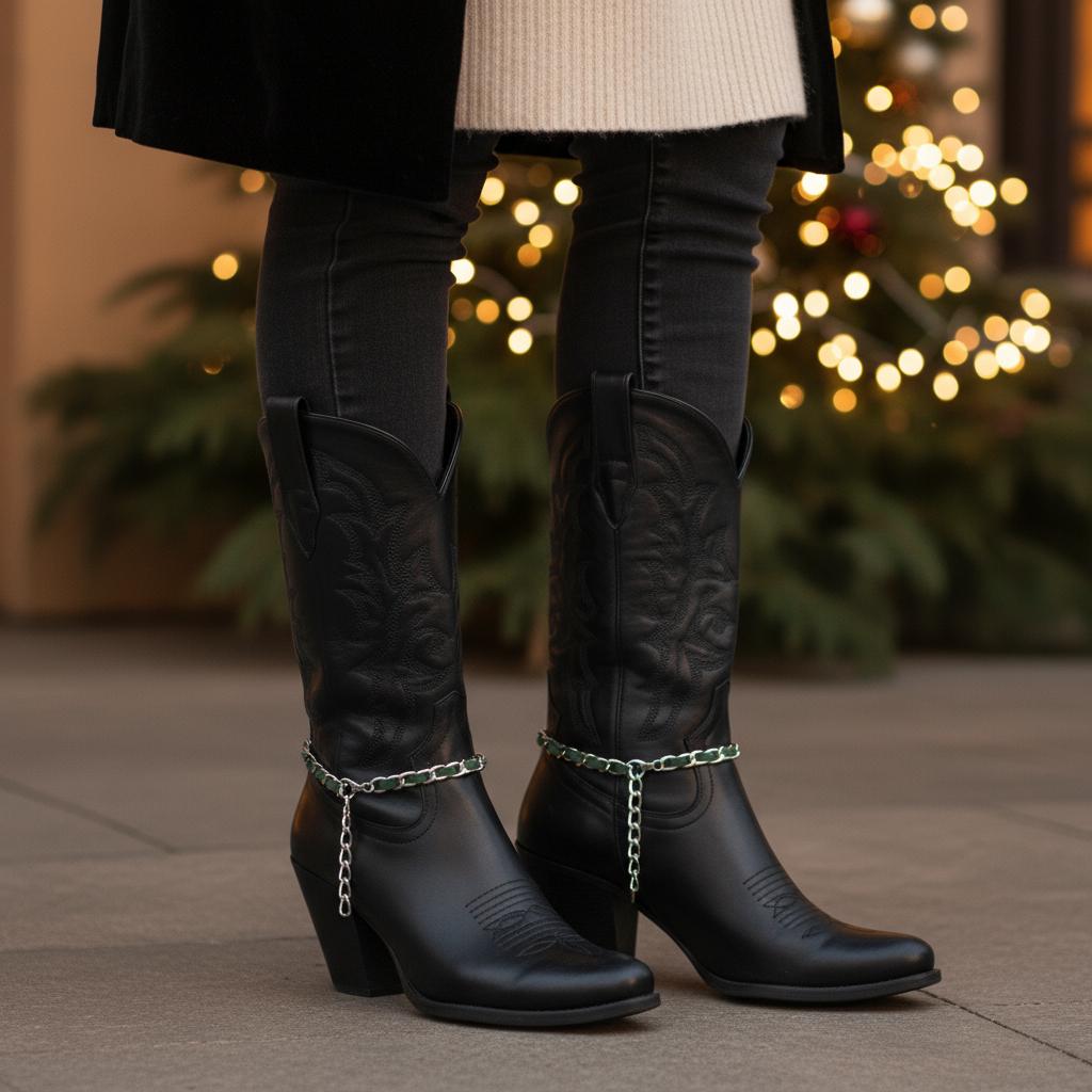 Think of these as tiny cozy scarves for your boots. We weave evergreen faux leather through glossy silver links so your step catches the light (and compliments). Every pair is handmade by us in the USA and we’re keeping it special—only up to 25 pairs. Clip on, add a little drape, and jingle all the way (minus the jingle).