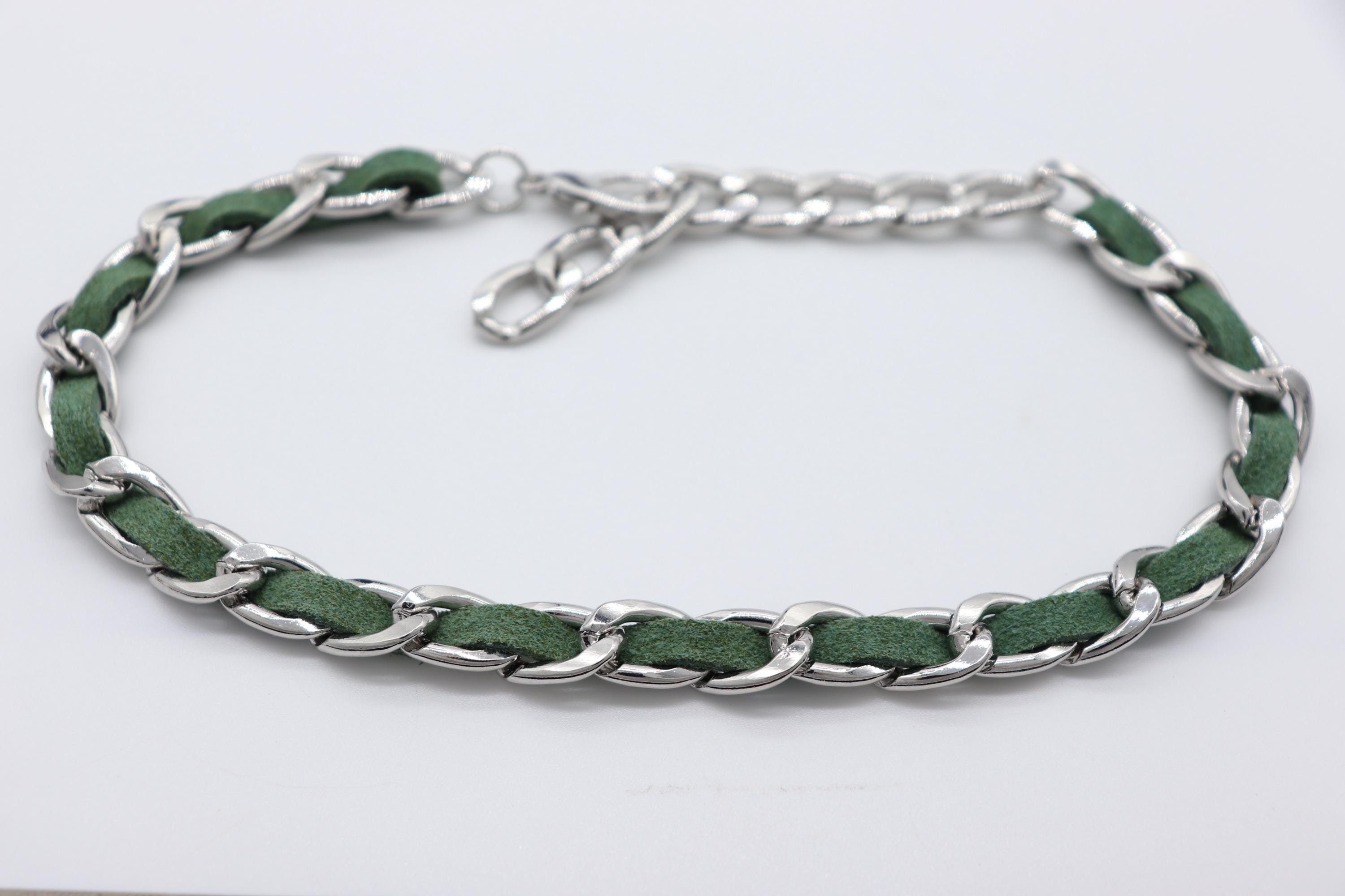 Women’s Boot Chain Anklets – Pair – Silver-Tone Curb Chain Woven with Green Faux Leather – Adjustable 12–15 in – Western / Cowgirl / Biker Boot Jewelry – Handmade in USA – Limited Edition (BC49)