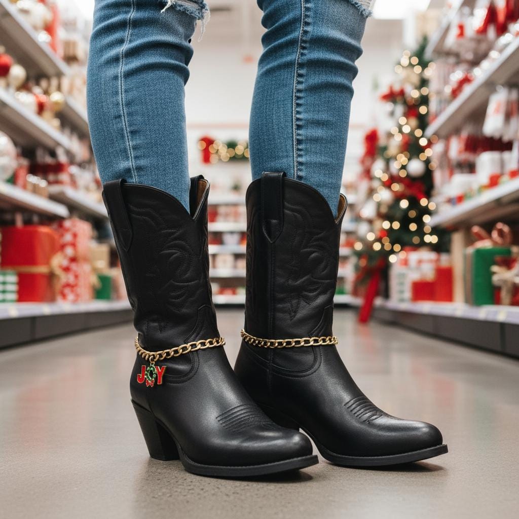 Western Holiday Flair: JOY wreath charm brings Christmas spirit to classic stitching and pointed toes.