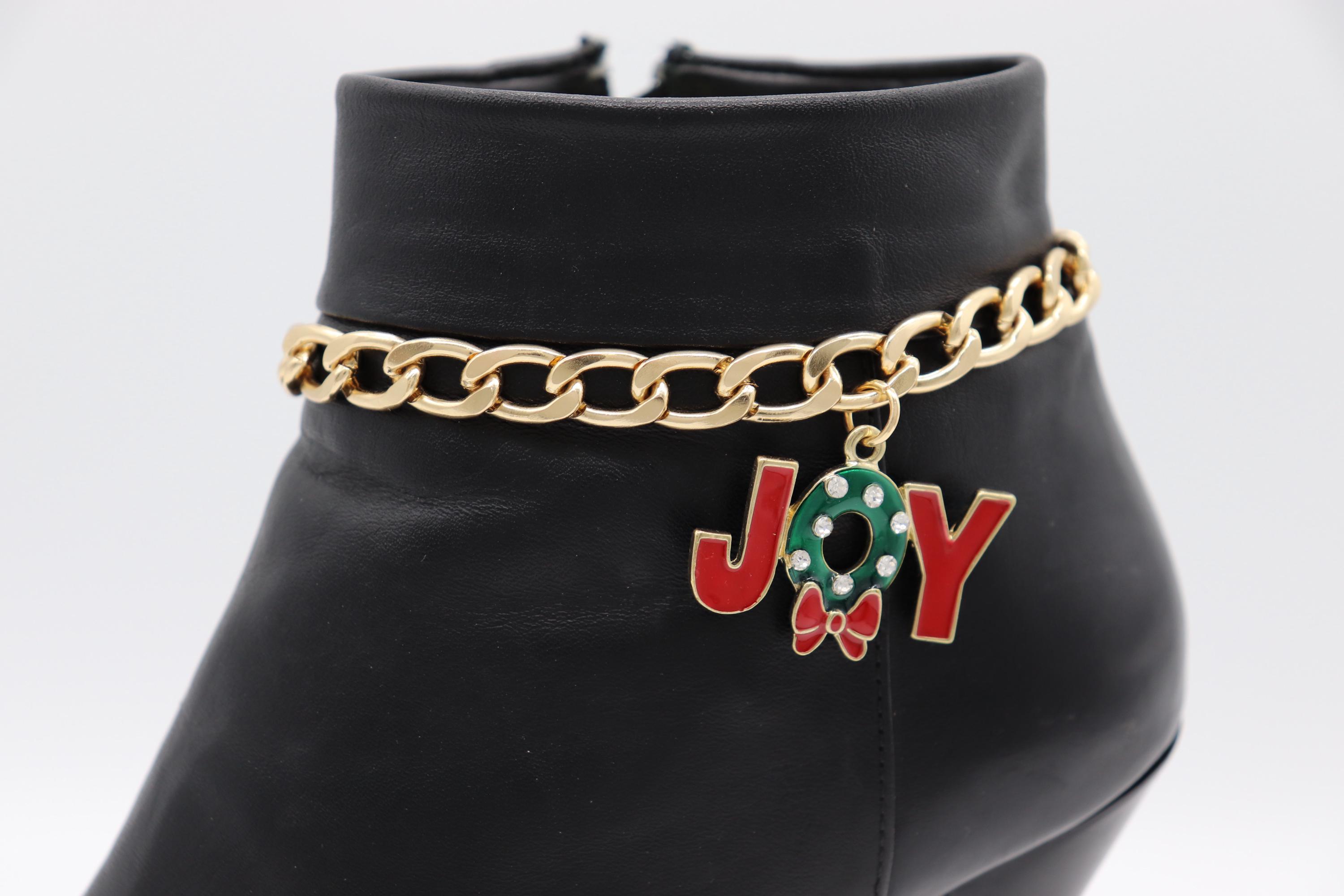Women 2PCS Gold Metal Boot Chain Bracelet Shoe Anklet JOY Wreath Bow Charm Set Fashion Holidays Christmas Jewelry - A PAIR BC53