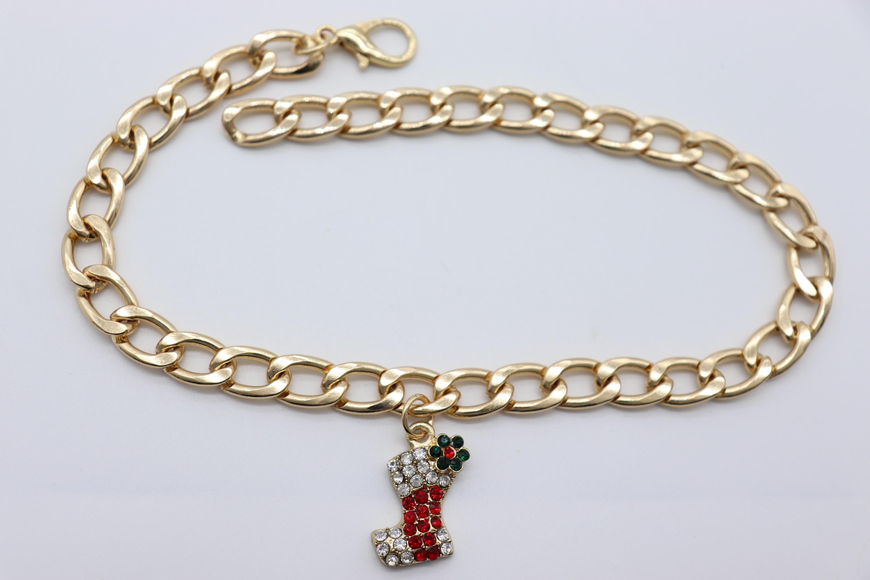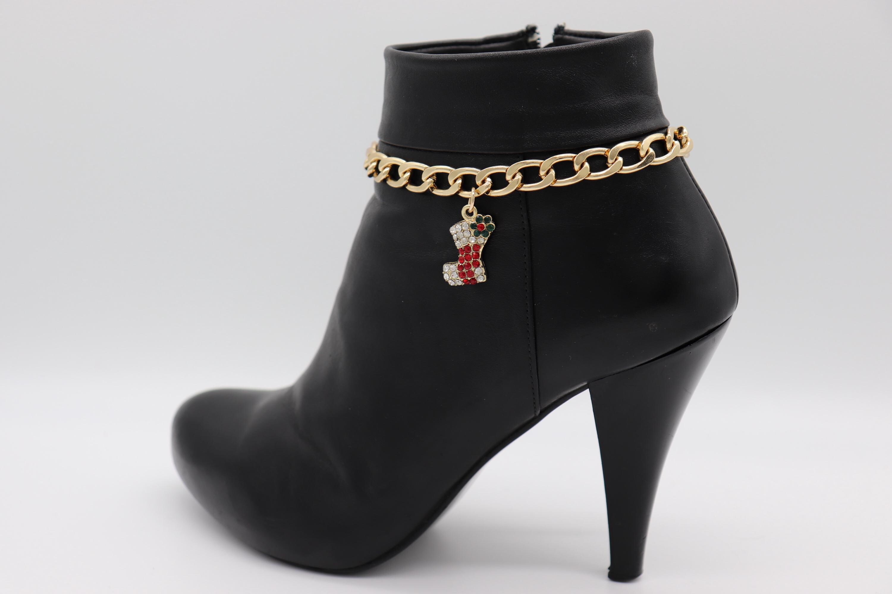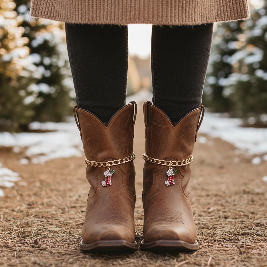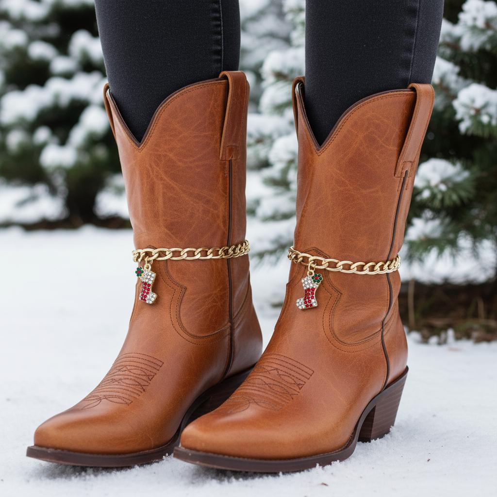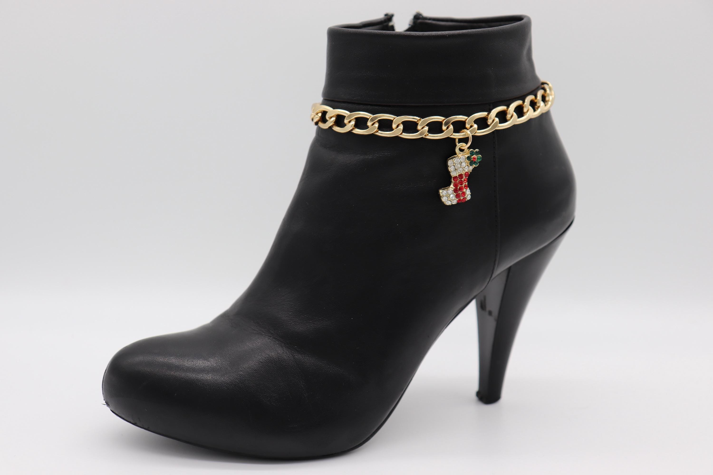 boot chain bracelet pair, christmas boot jewelry, stocking charm boot anklet, holiday boot chains women, gold curb chain ankle boot chain, western boot accessories, rhinestone boot charms, festive shoe jewelry, adjustable boot chain