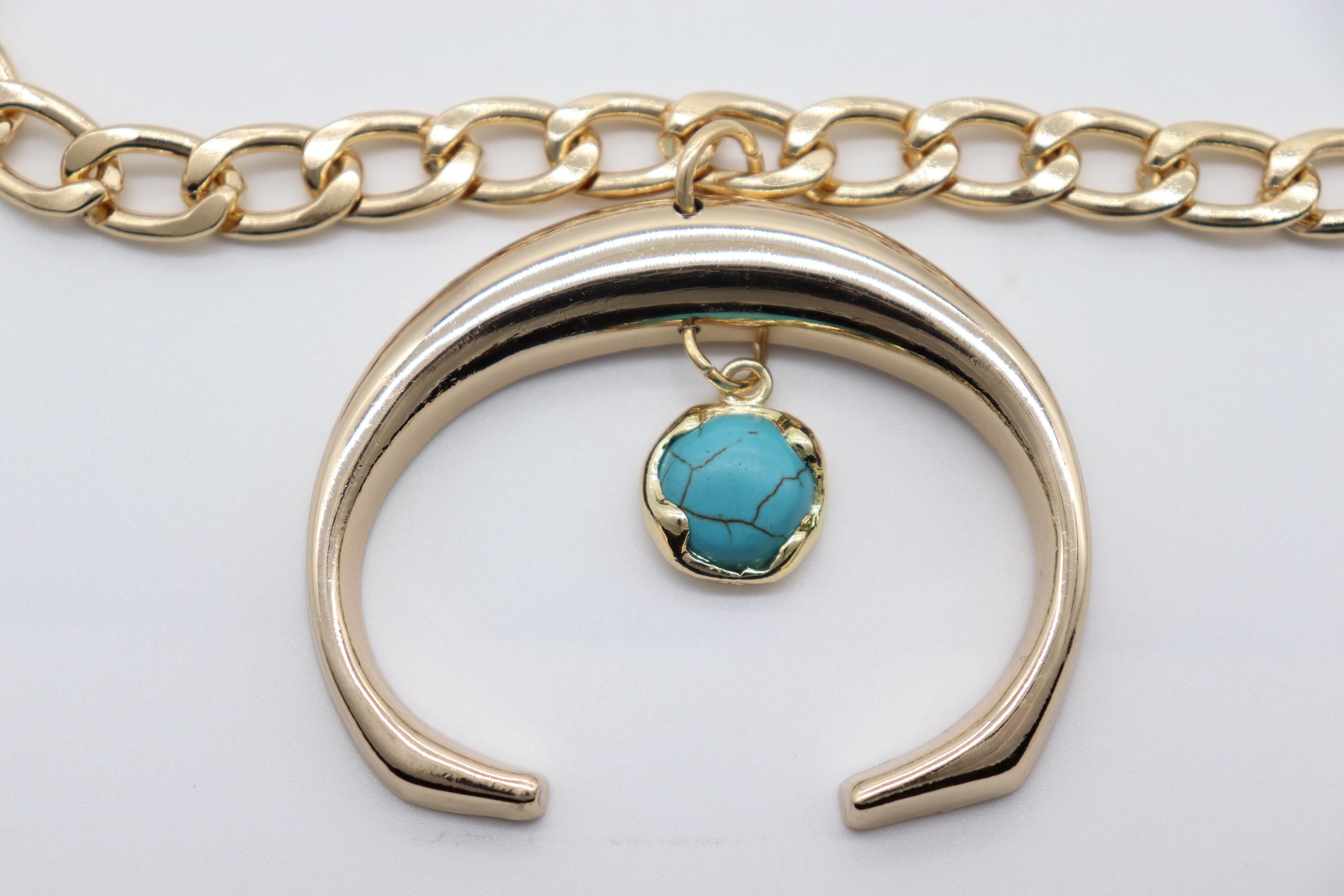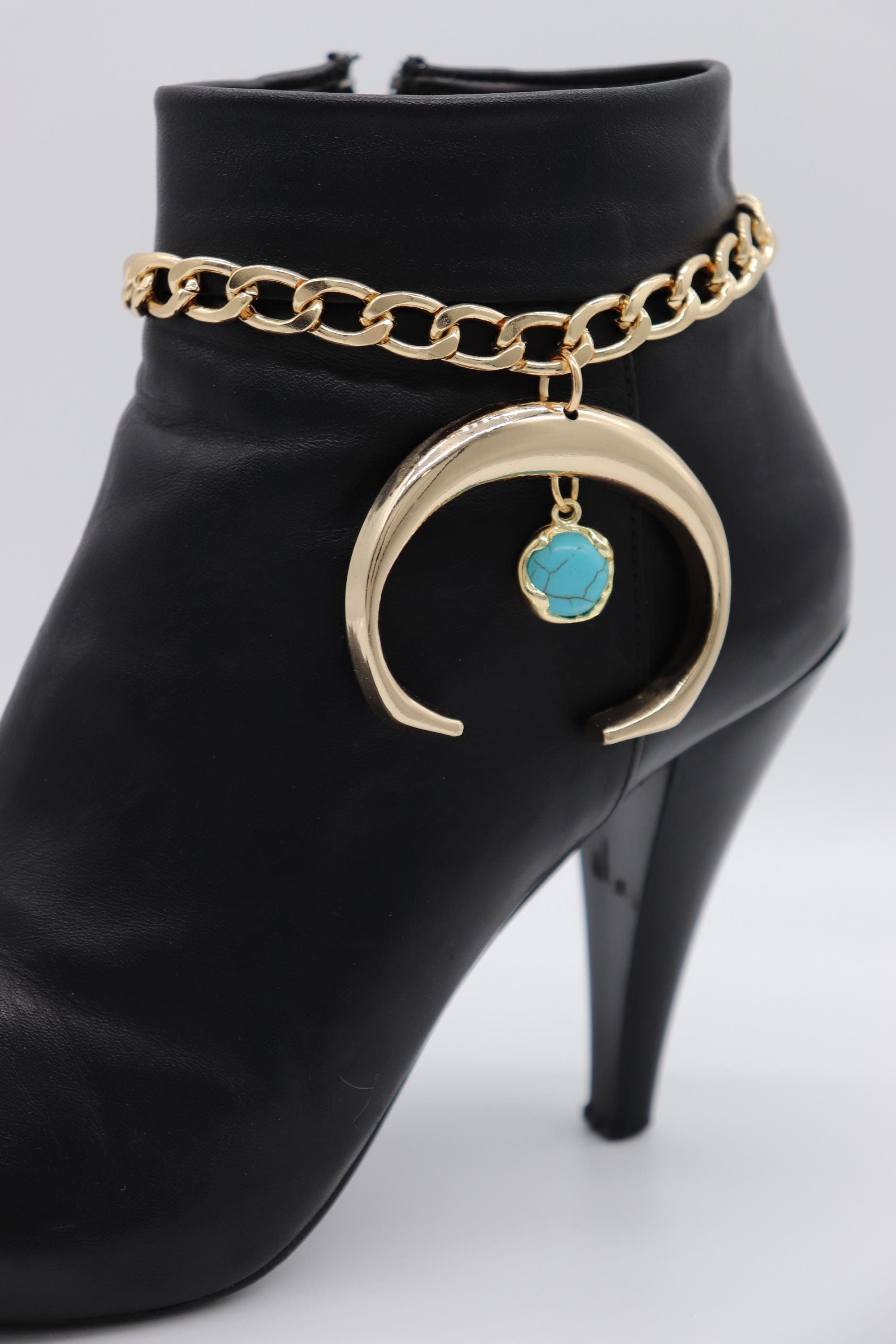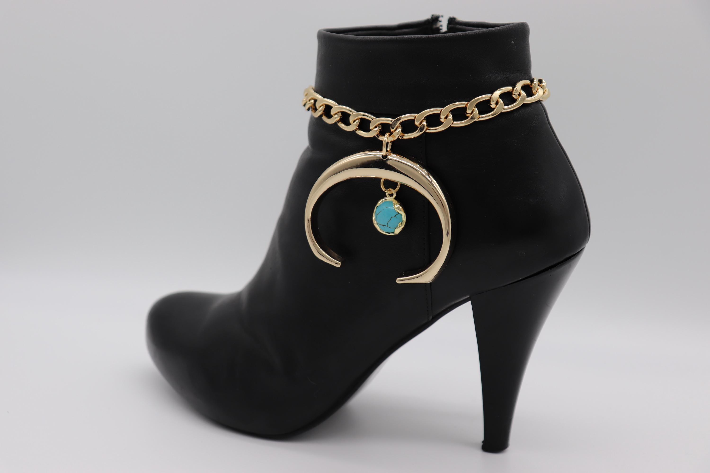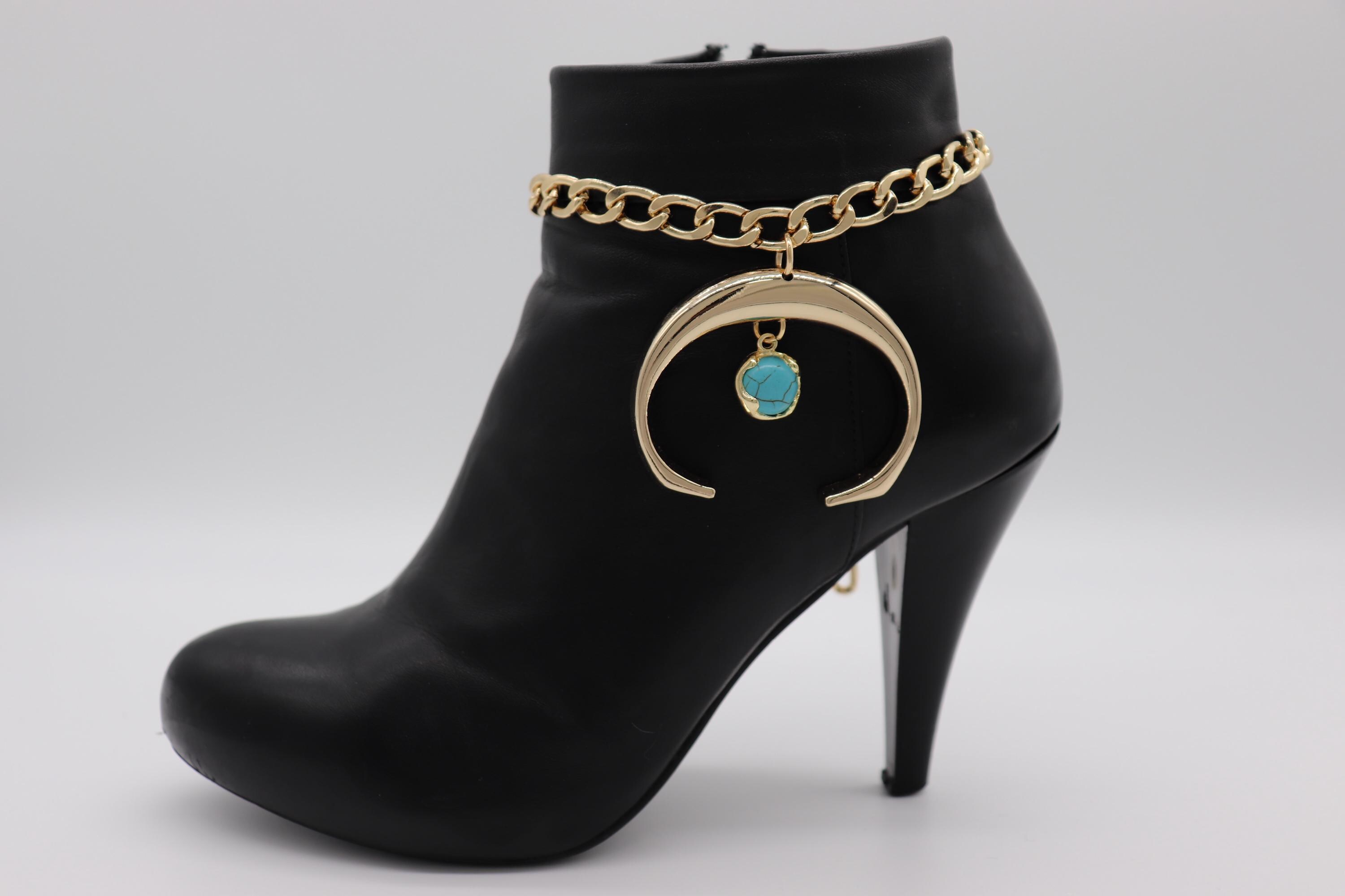 Women’s 2PCS Western Boot Chain Bracelet Set, Crescent Charm With Turquoise Stone, Gold-Tone Chain Anklet For Boots, Adjustable 11"–15", Handmade In USA – BC58 (Pair)