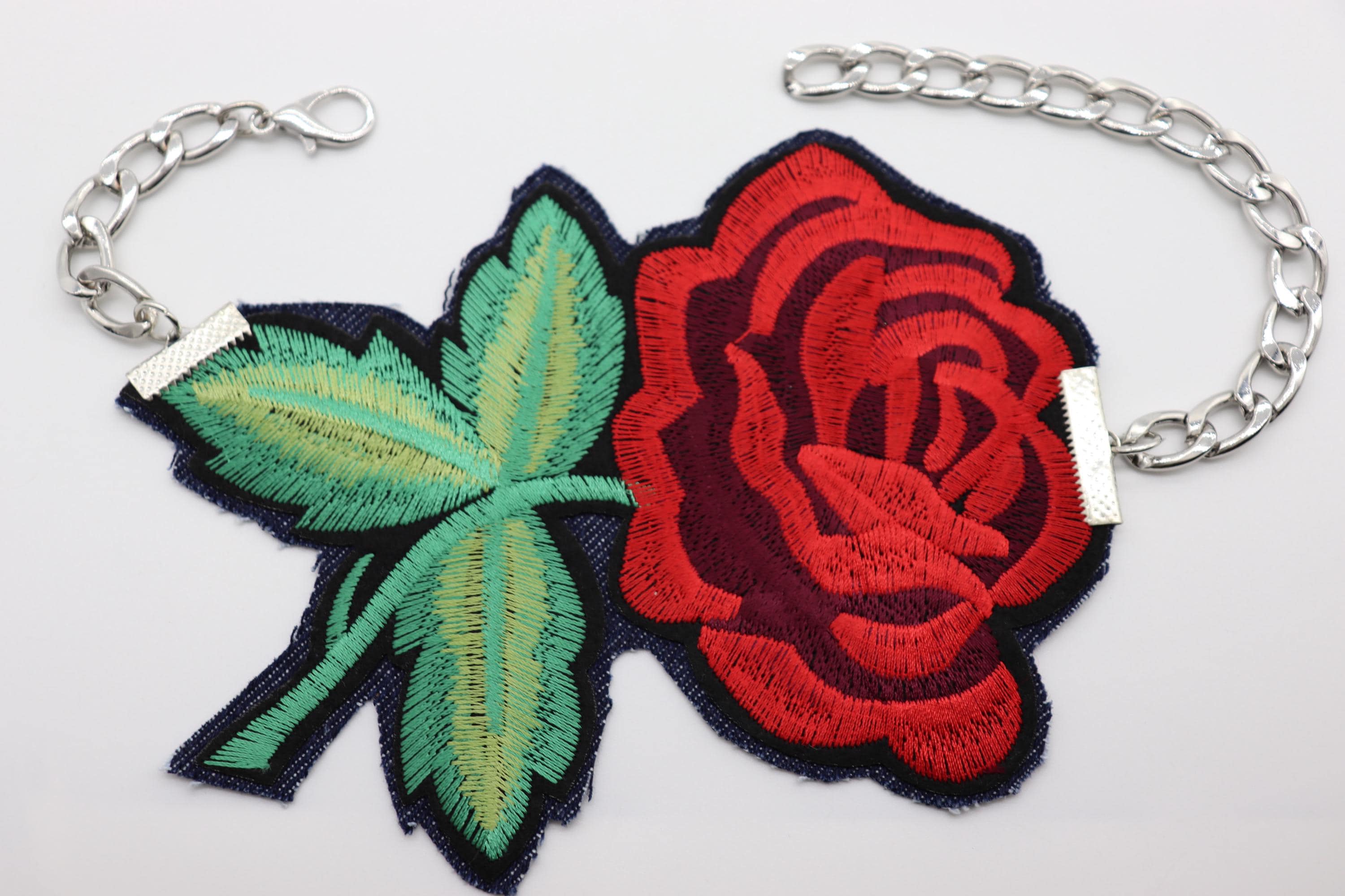 Alloy chain, polyester embroidery, fabric backing, lobster clasp
