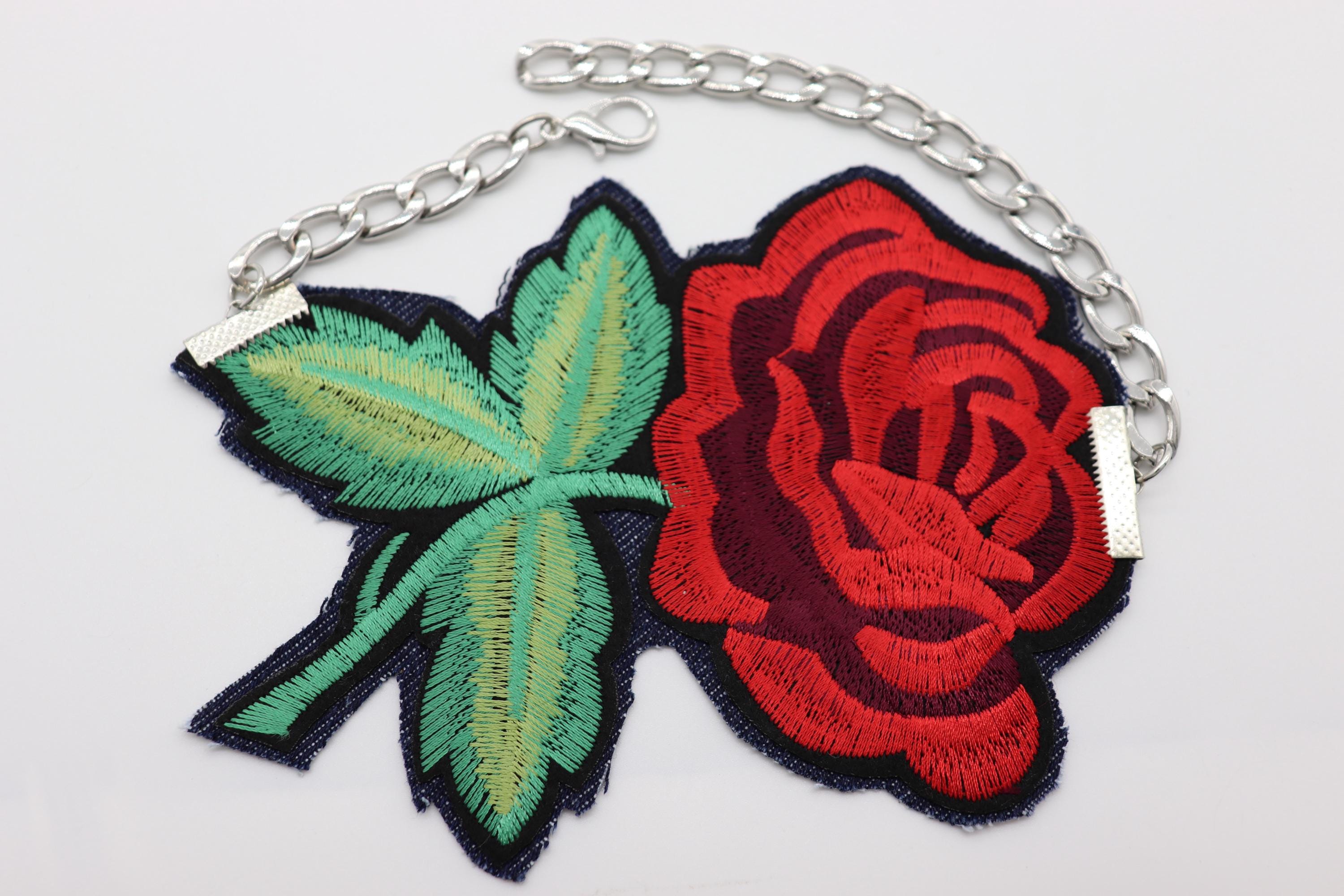 Color: Silver metal chain and hardware + Black red and green fabric patch (rose embroidery)