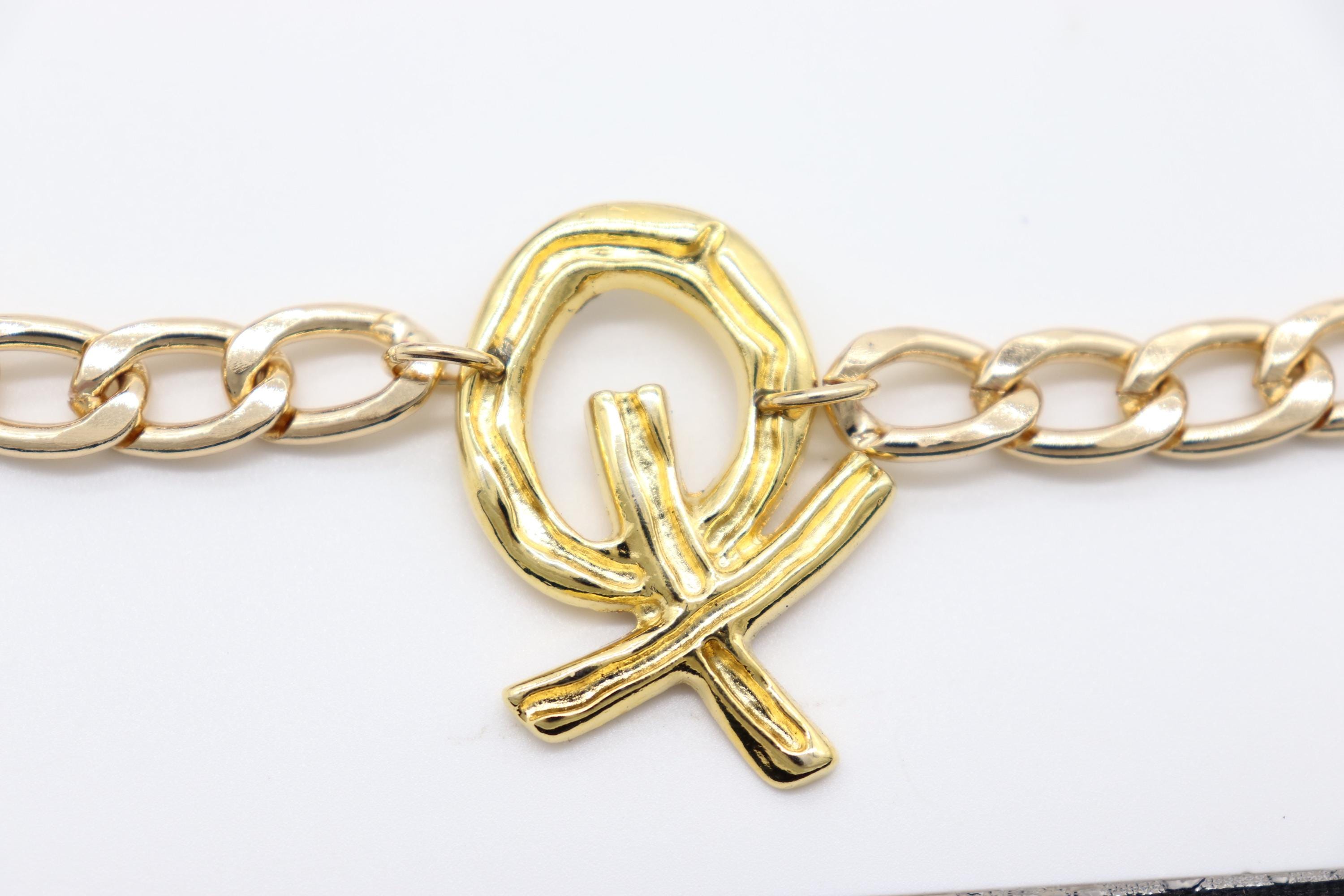 Gold-tone metal alloy, curb chain, XO charm, lobster clasp, extender chain.
