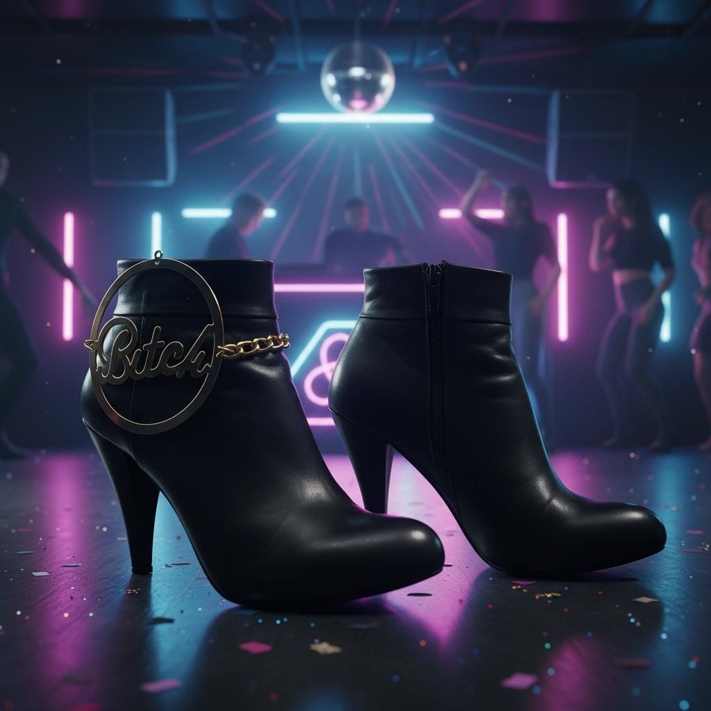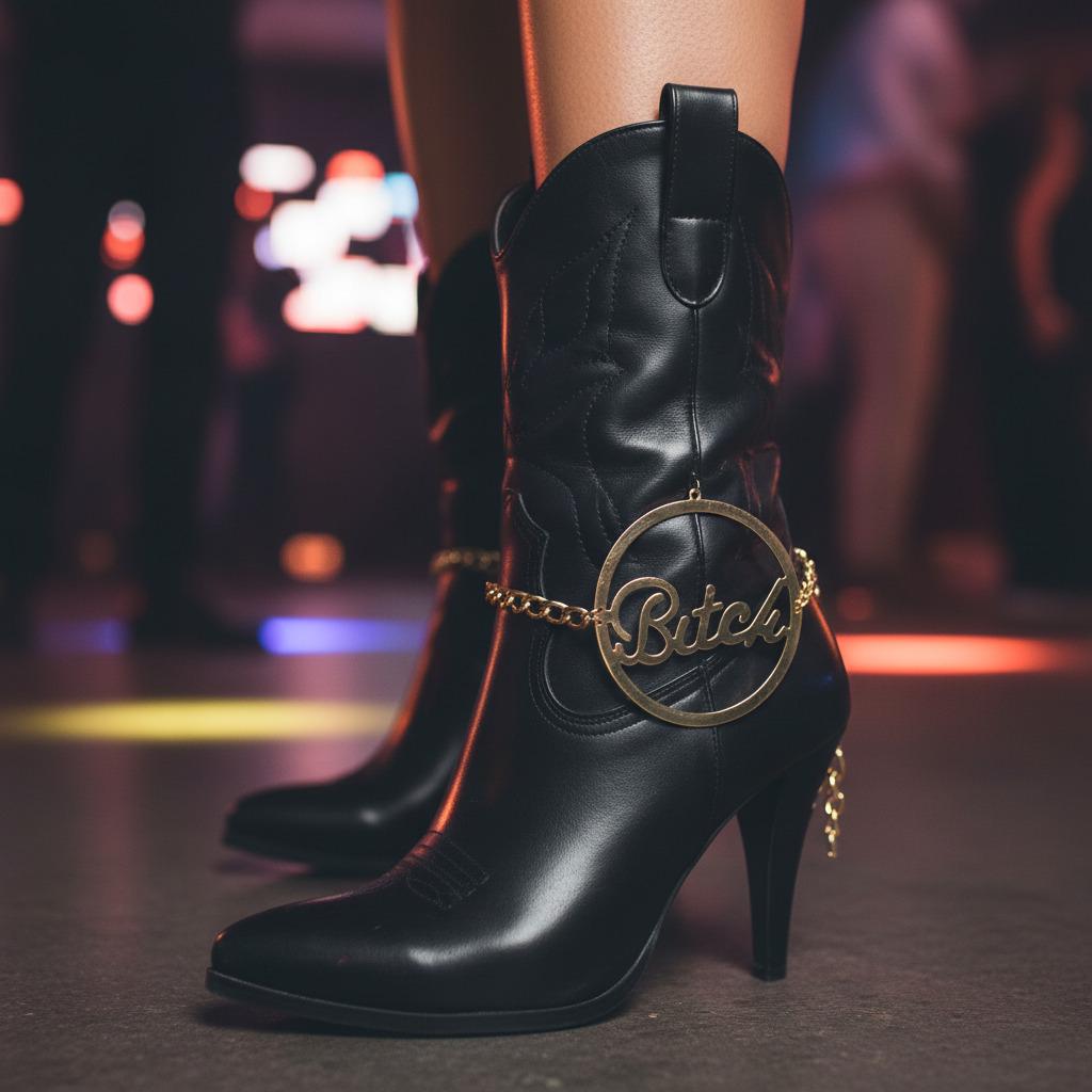 Say it with your boots. This gold boot chain pair comes with an oversize “Bitch” hoop charm that swings with every step—equal parts western and glam. Clip one on each boot, leave a little drape for movement (and to protect the chain), and strut into concerts, festivals, bachelorettes, Halloween parties, drag brunch, birthdays, or that Vegas weekend that somehow always needs one more outfit.