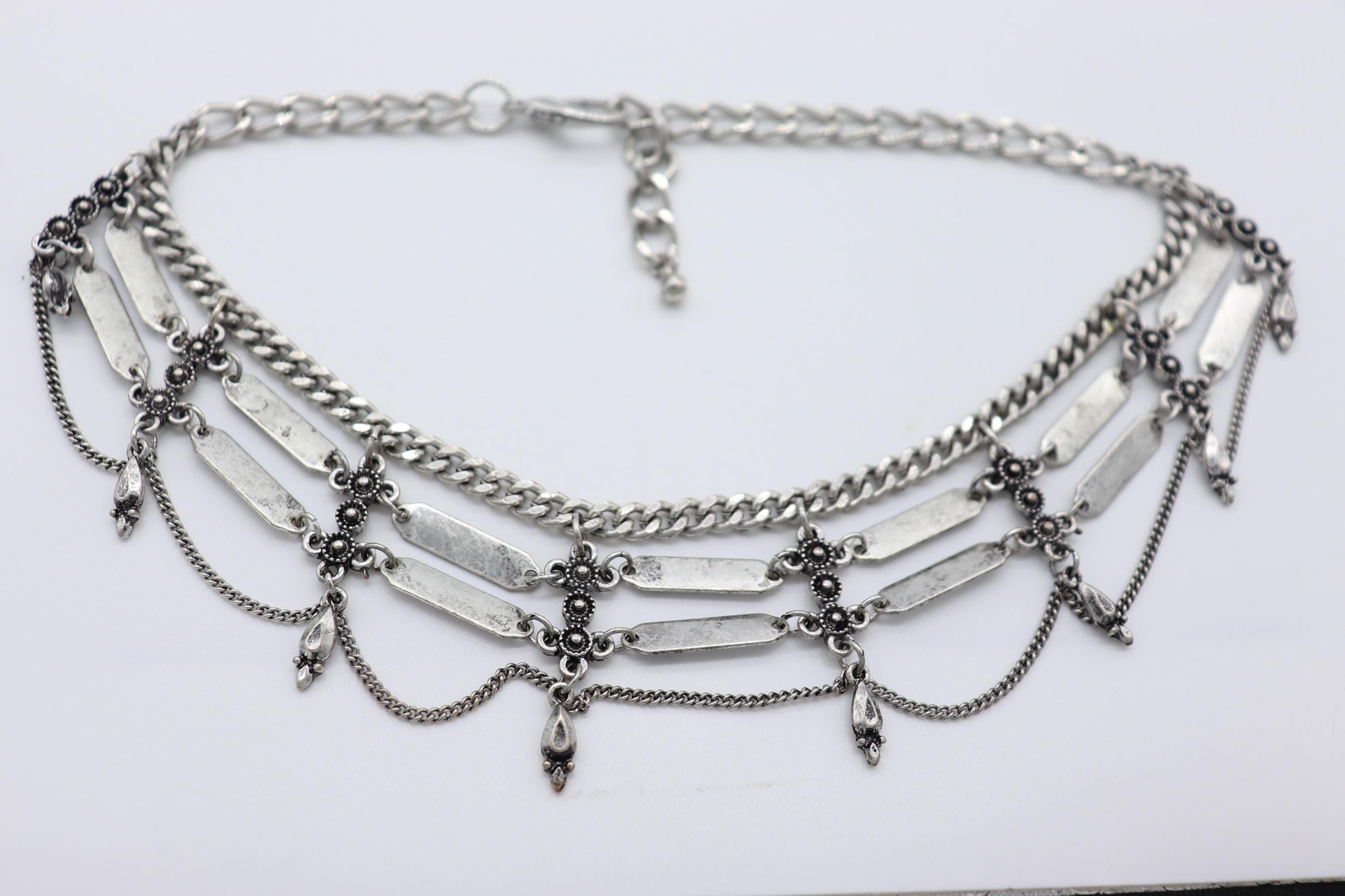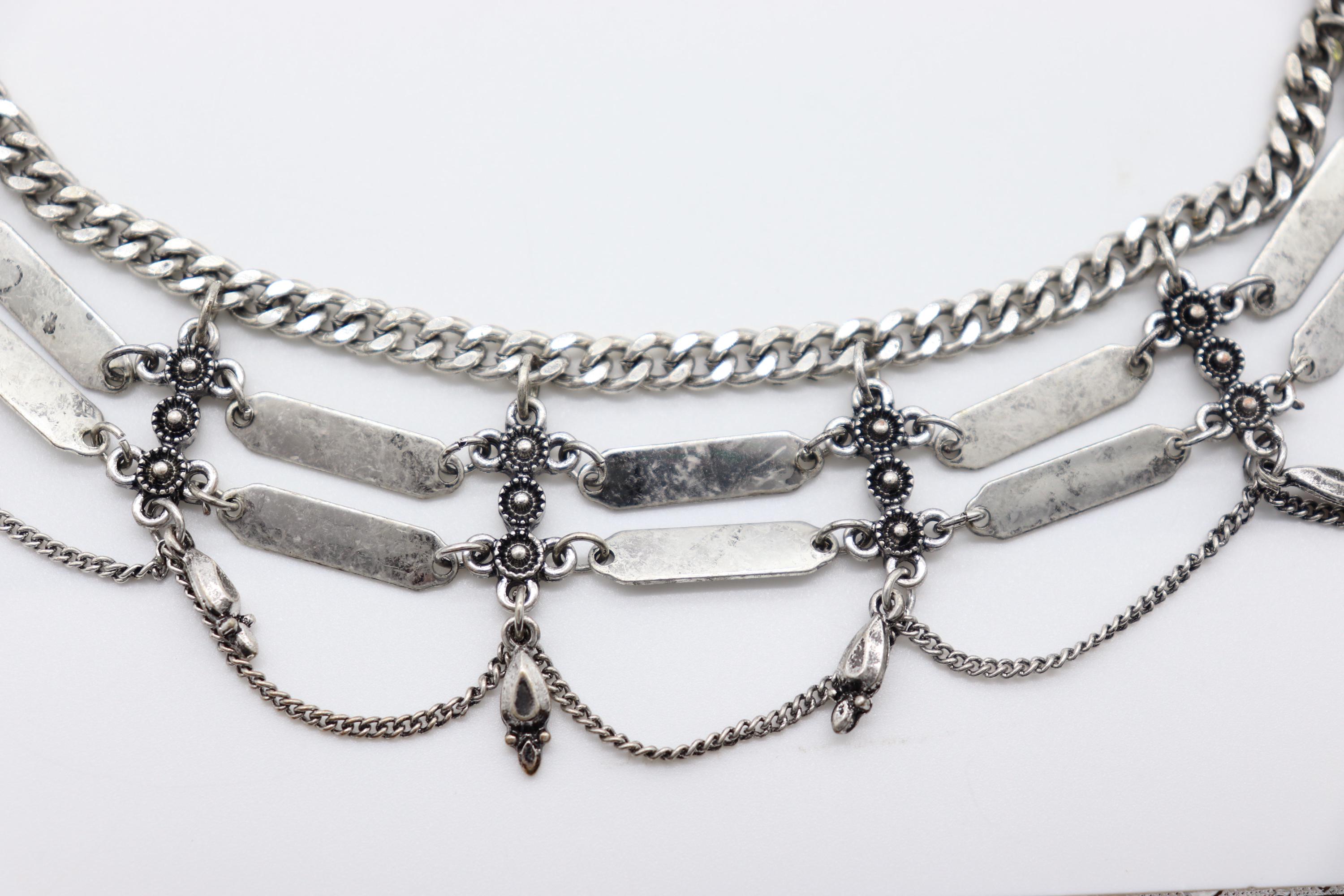 Metal alloy chain and hardware, antique silver-tone finish, etched flower plates, lobster clasp, extender chain.