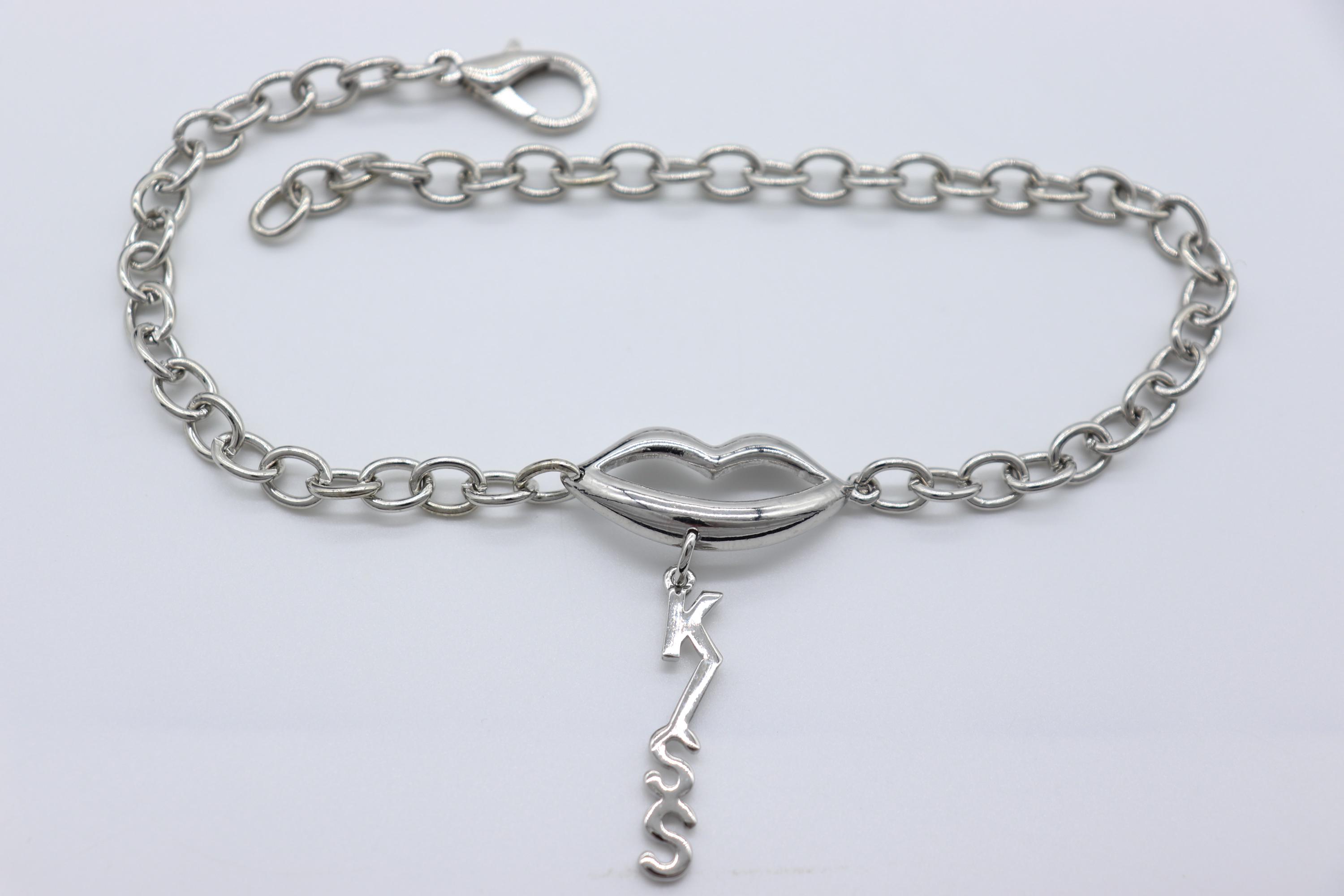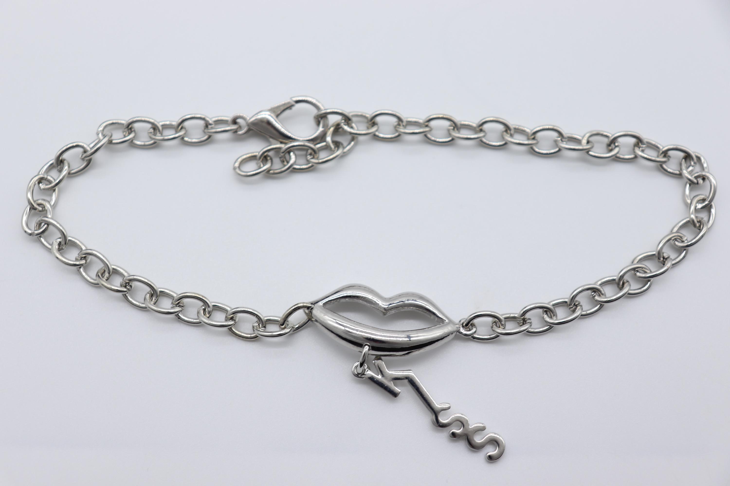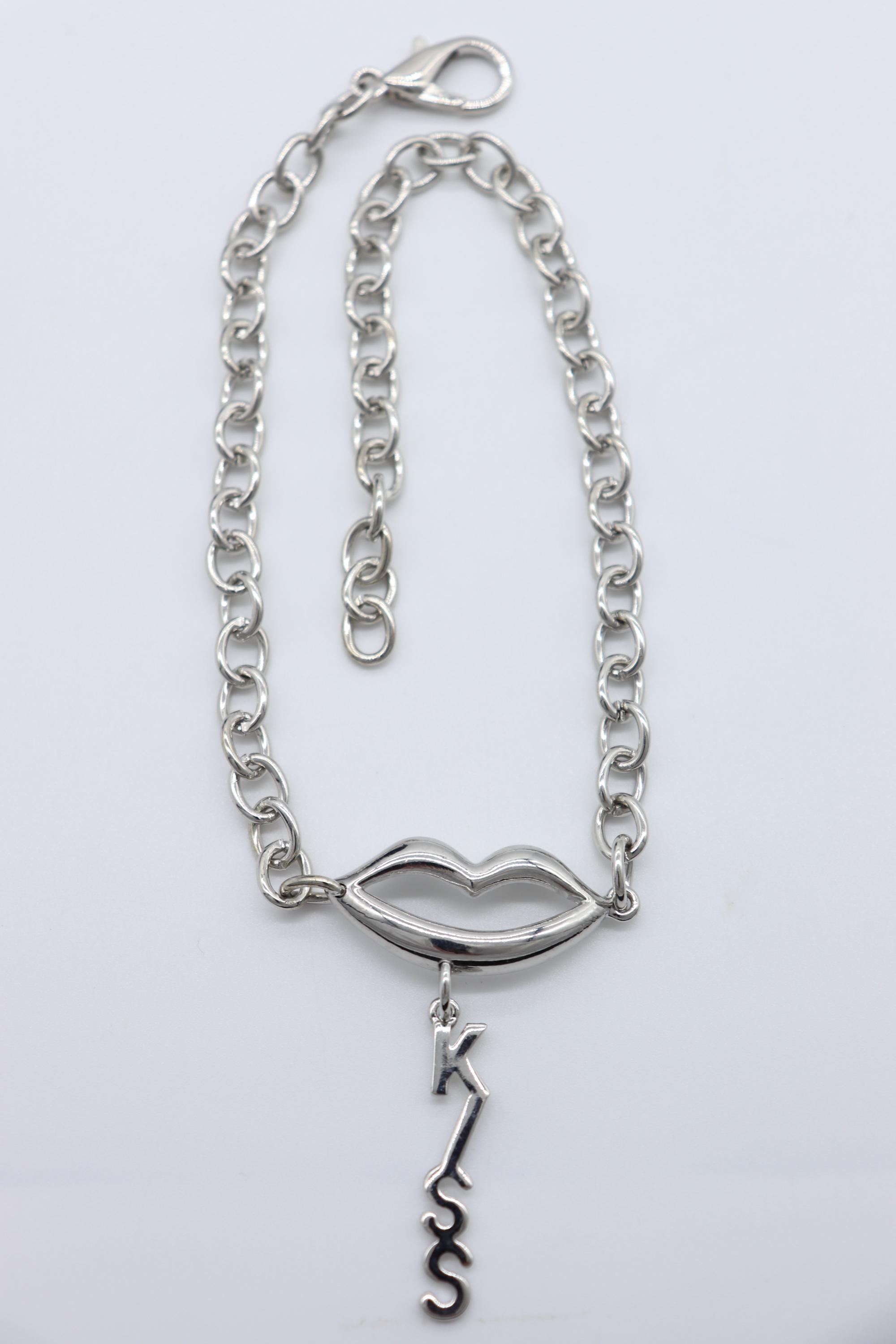 Silver-tone metal-alloy chain and hardware; lobster clasp; “Kiss Lips” charm.