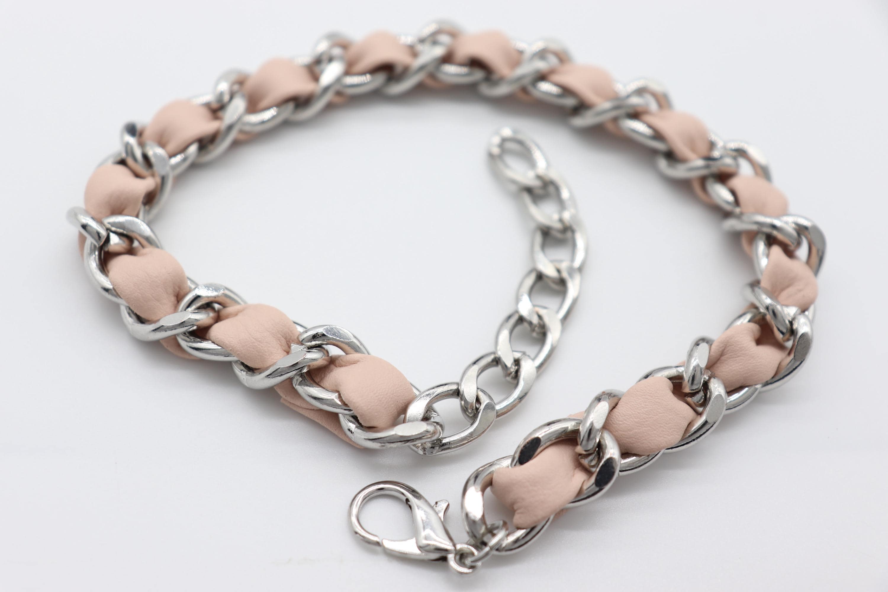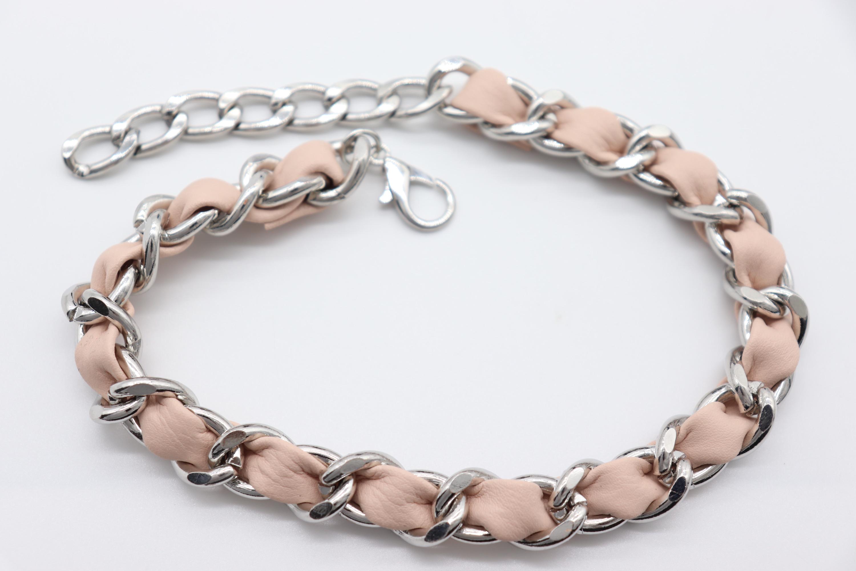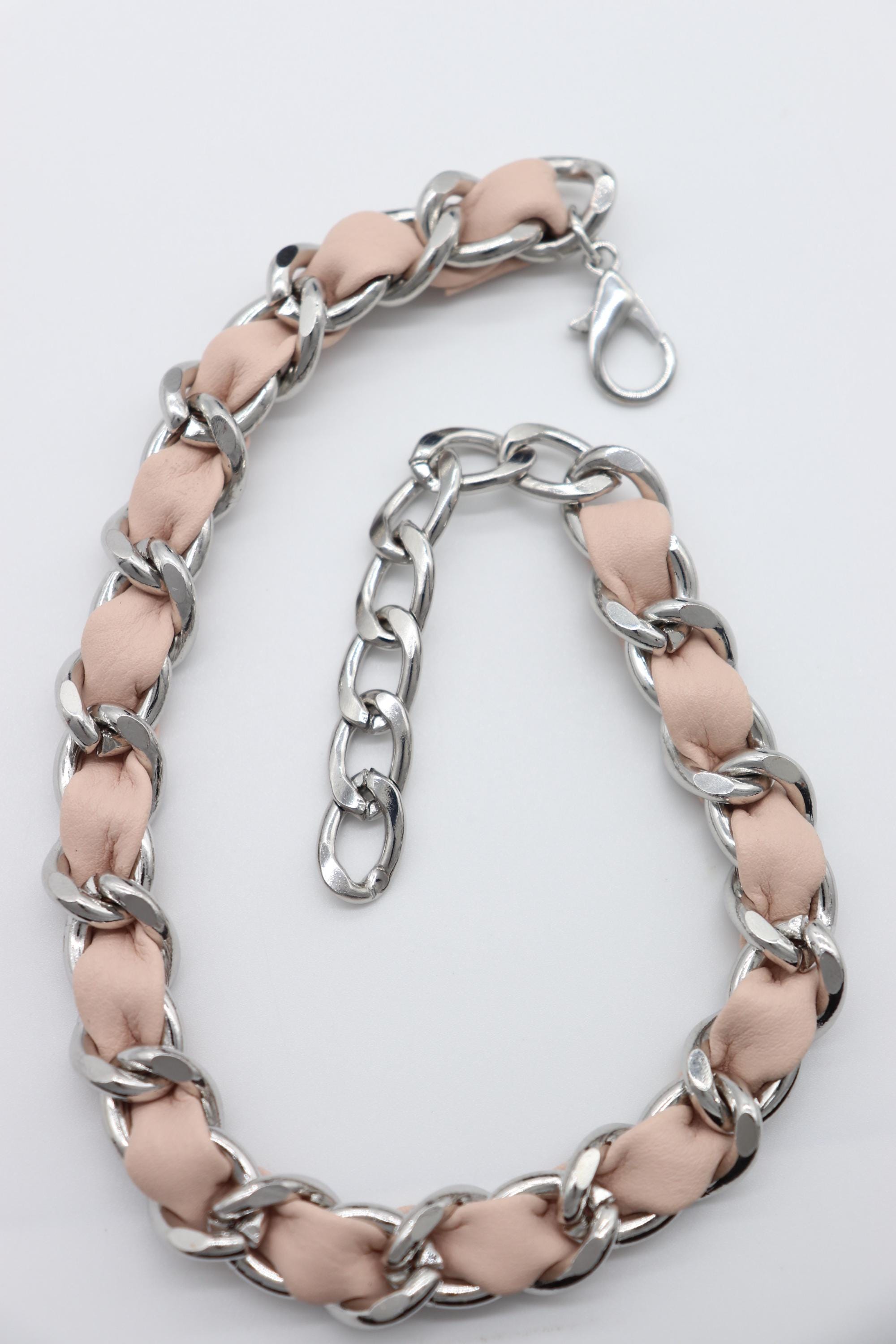 Materials: Zinc-alloy chain (silver-tone), PU faux leather (light pink), lobster clasp