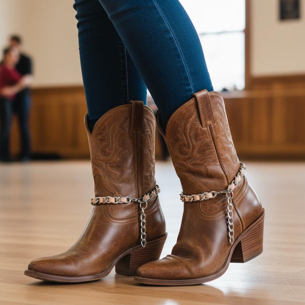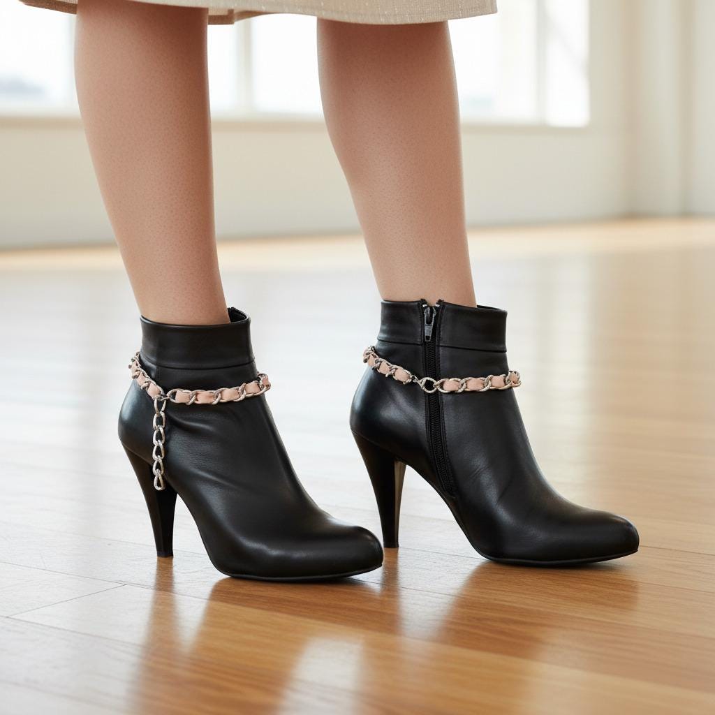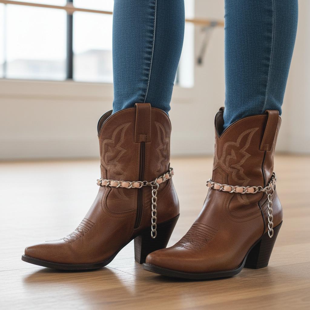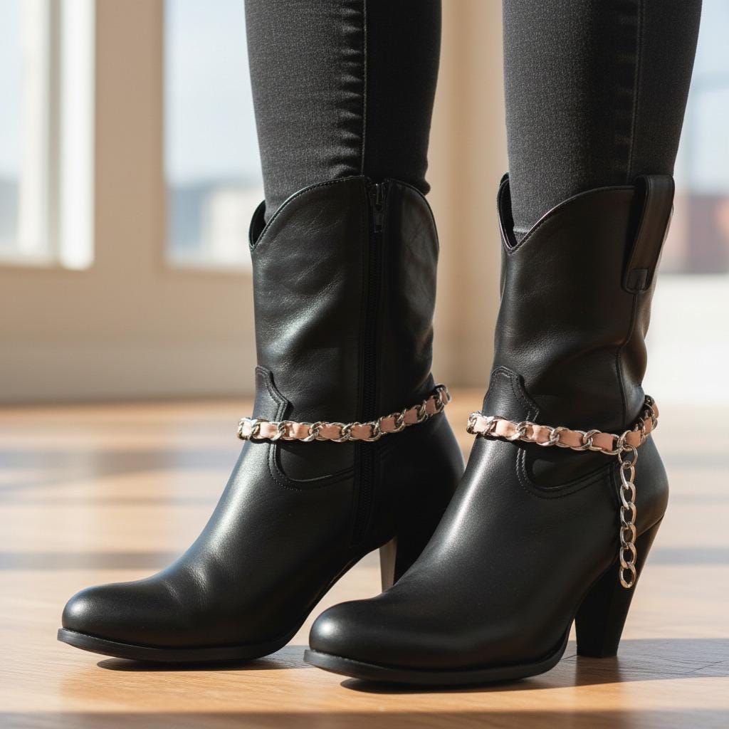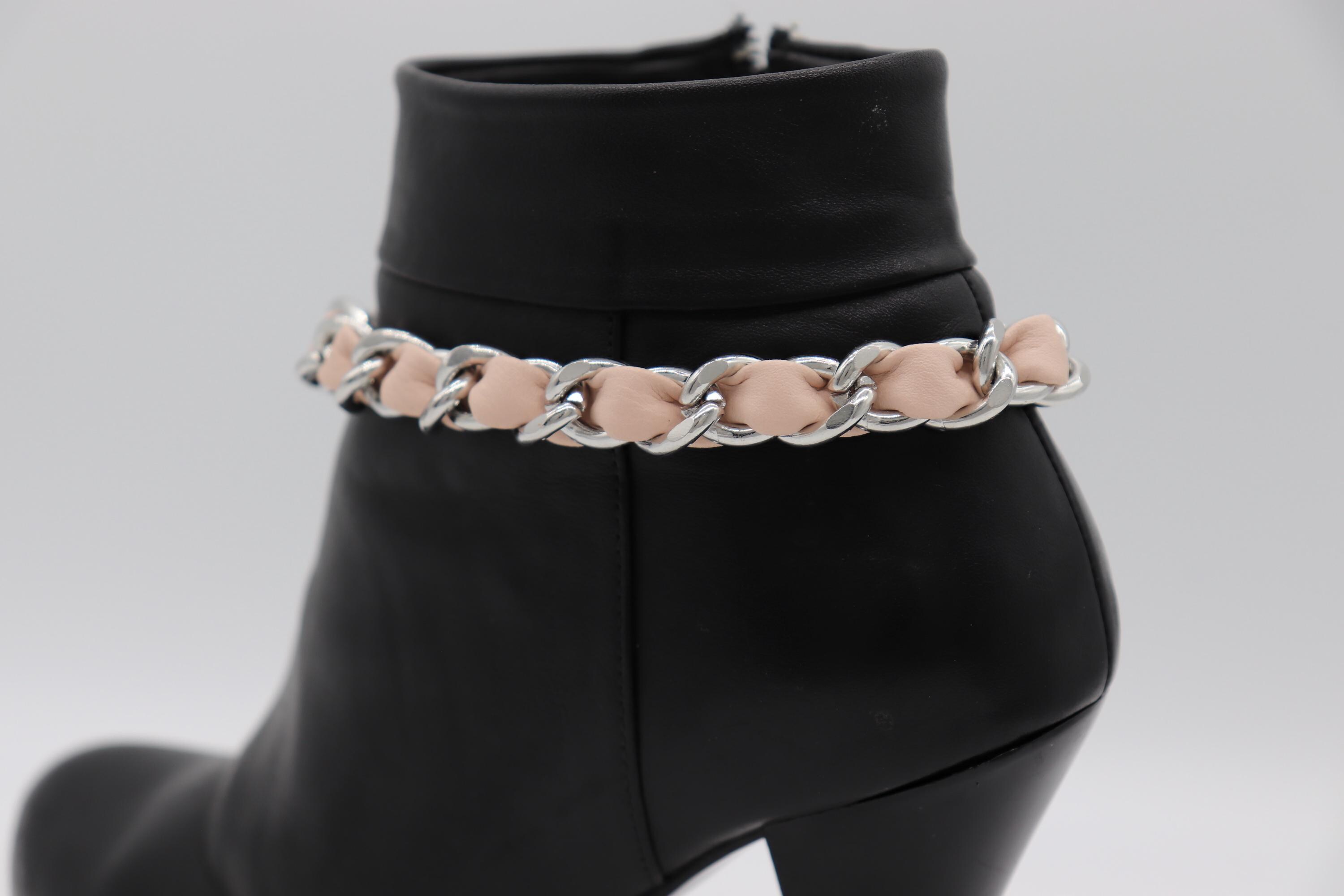 Dress your boots for the party. This pair of handmade boot anklets blends a shiny silver chain with a soft light-pink faux-leather weave—sweet, modern, and just a little flirty. Each anklet adjusts from 11–15 in with a secure lobster clasp, so they’ll drape beautifully on ankle booties or tall cowgirl boots. Wear them to concerts, festivals, rodeo nights, brunch dates, or anytime your outfit needs a wink of Western glam.