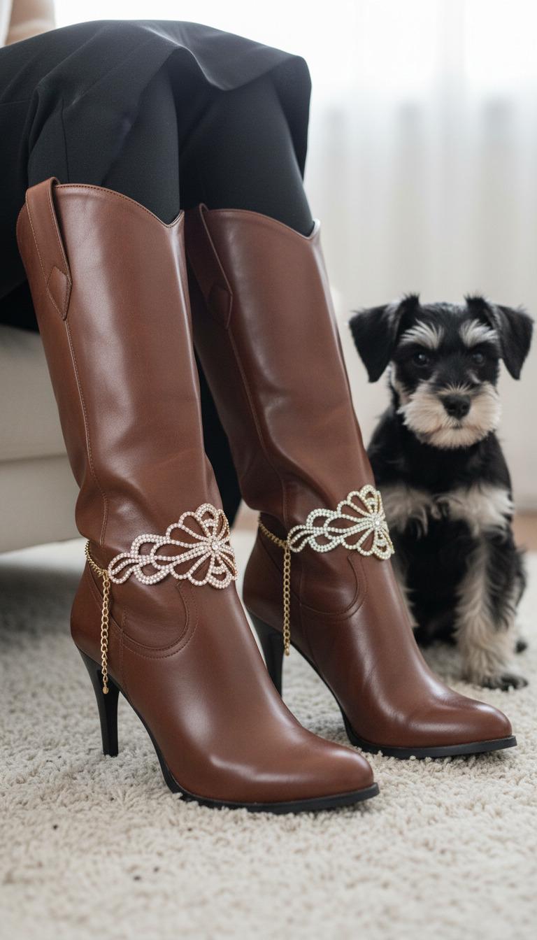 Each order includes two matching boot chains – one for each boot. A big sparkling flower motif wraps around the ankle with layers of crystals that catch every bit of light. Clip them around your favorite cowgirl boots, tall dress boots, or sleek ankle booties and suddenly your everyday shoes look boutique-level.