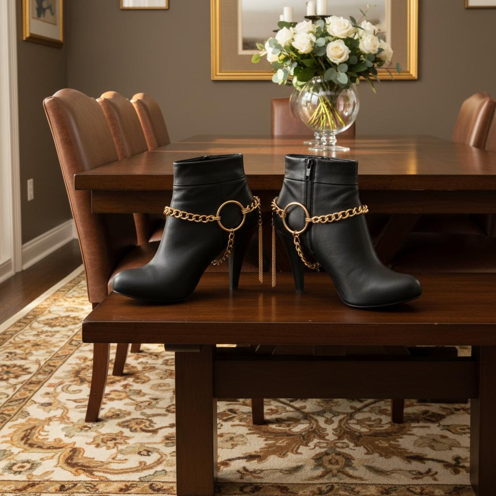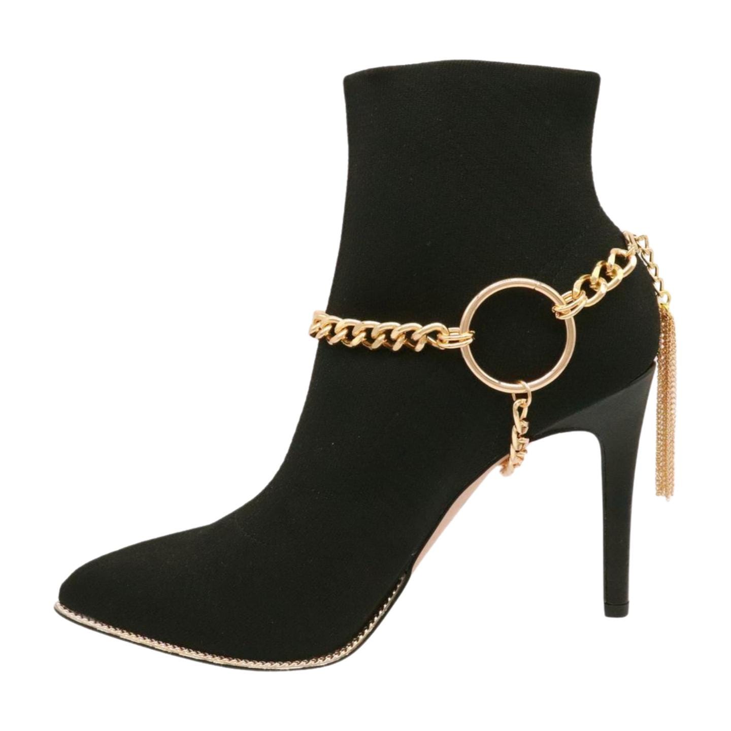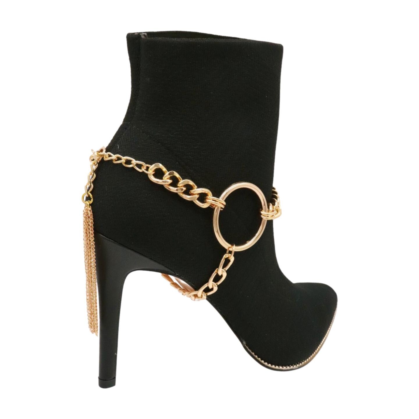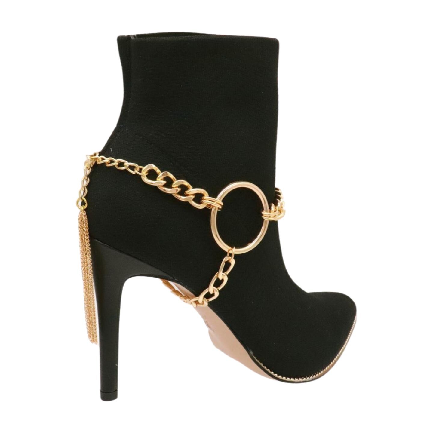 This is a pair of gold-tone boot chain bracelets designed to wrap your boots with a clean, eye-catching detail: a bold circle ring accent on the side and a back fringe tassel that moves when you walk. It’s a fun styling upgrade that makes boots look instantly more “finished,” like your outfit had a plan—even if your plan was “grab coffee and look cute doing it.”
