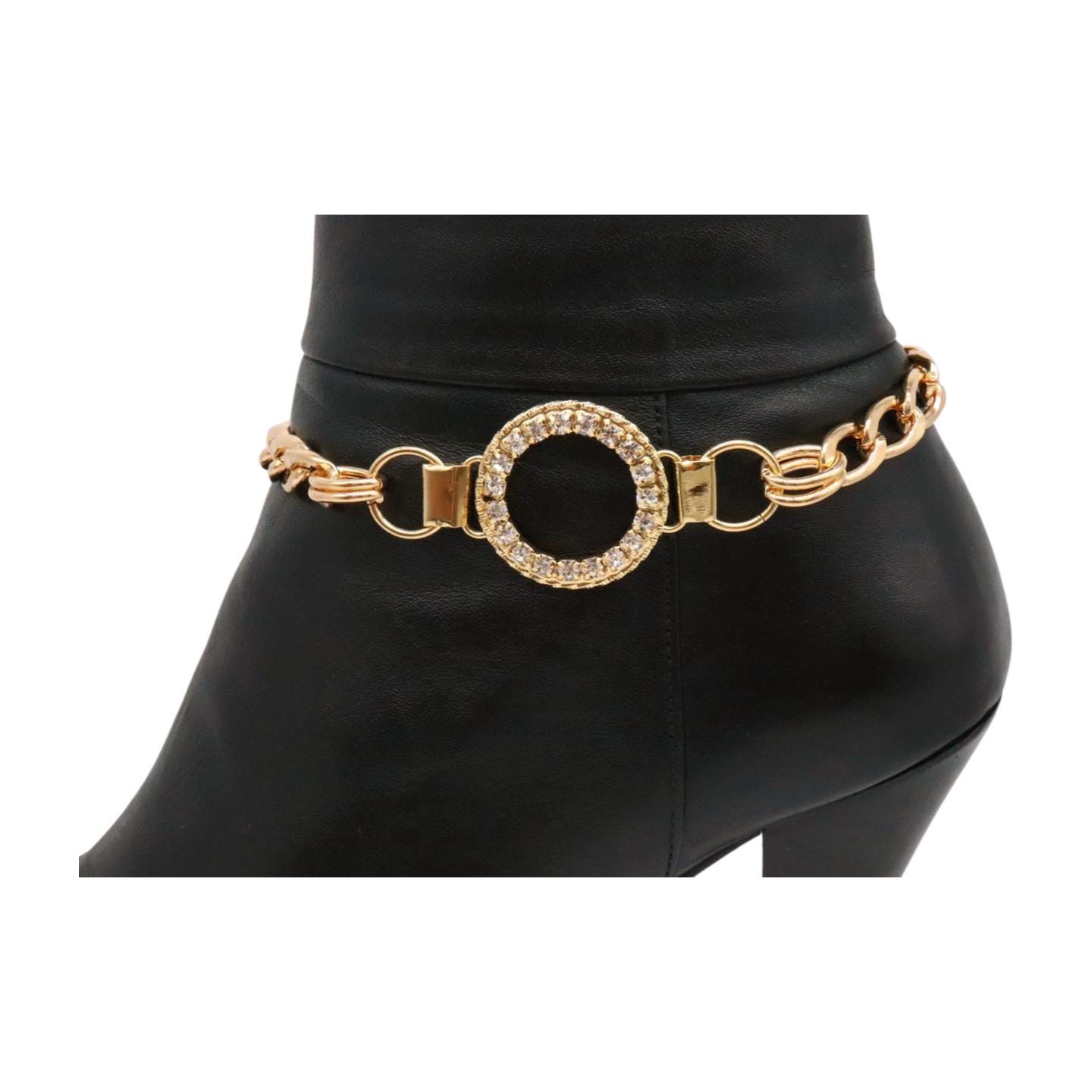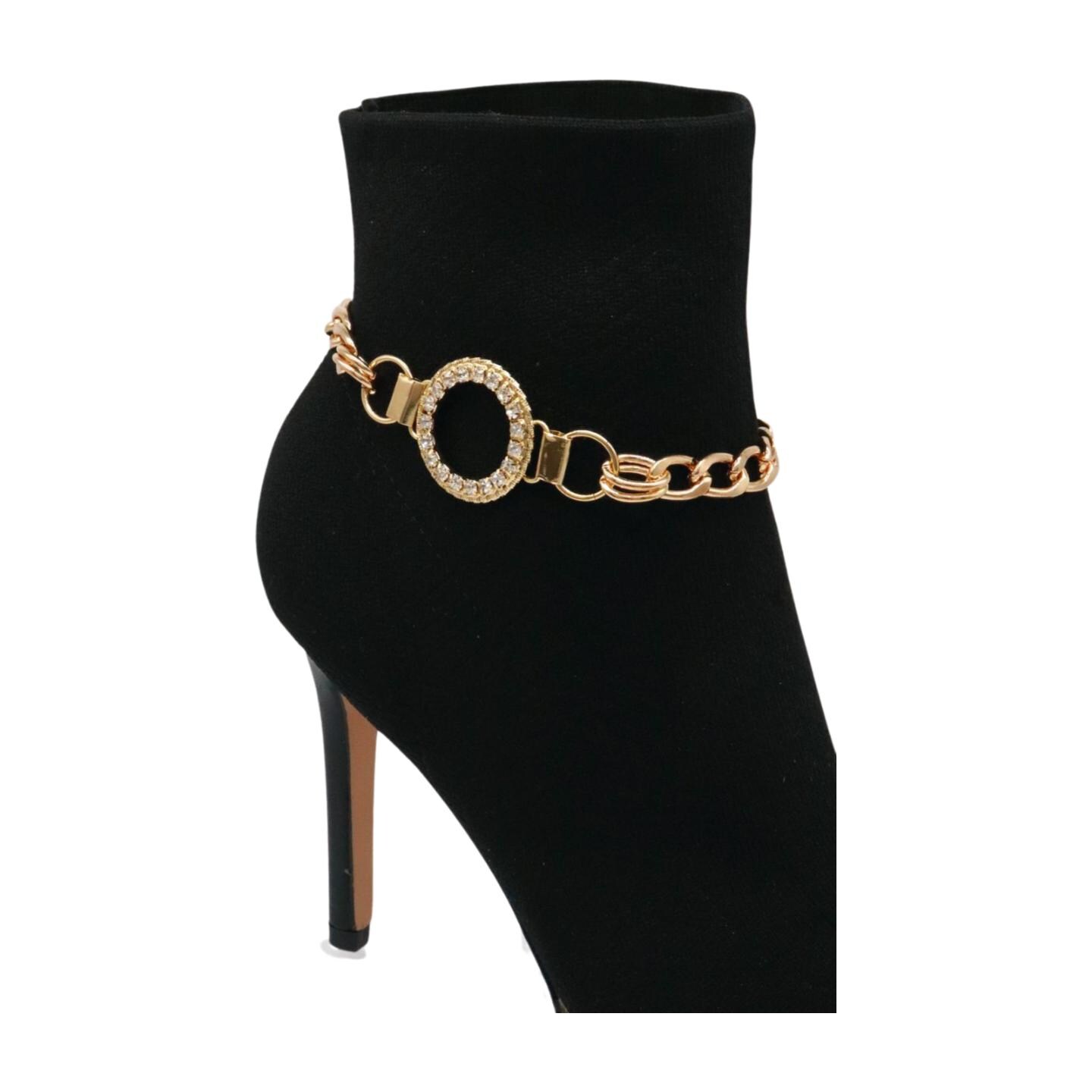 Gold Boot Chain Bracelets Pair, Rhinestone Circle Bling Charm Boot Jewelry, 2Pcs - BC160