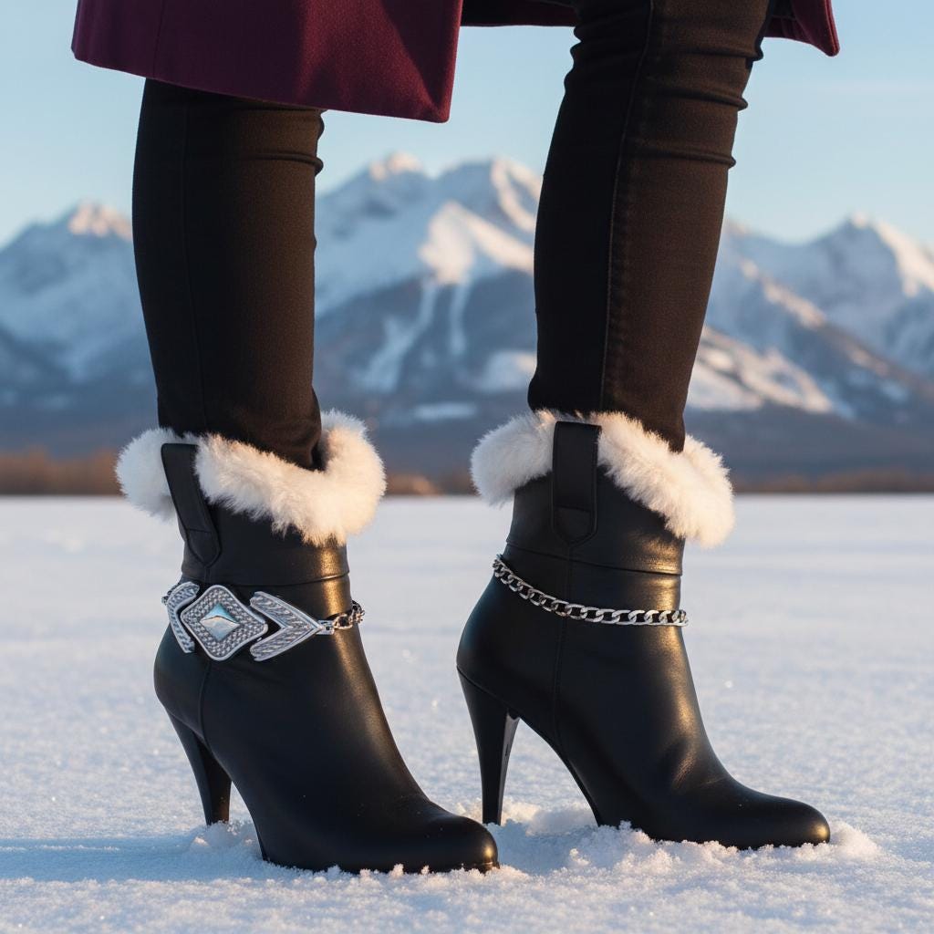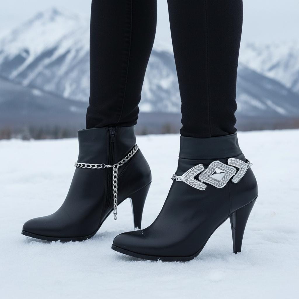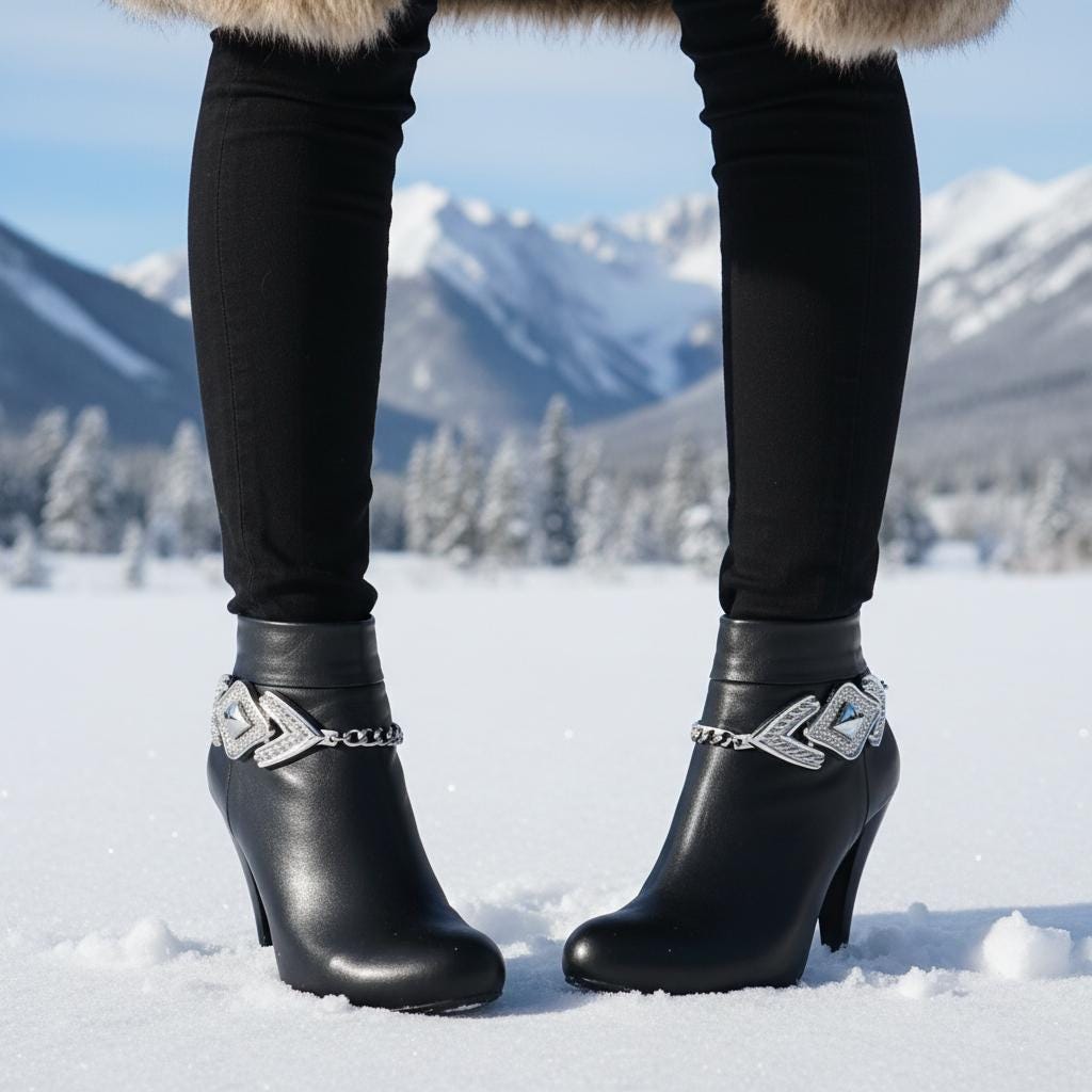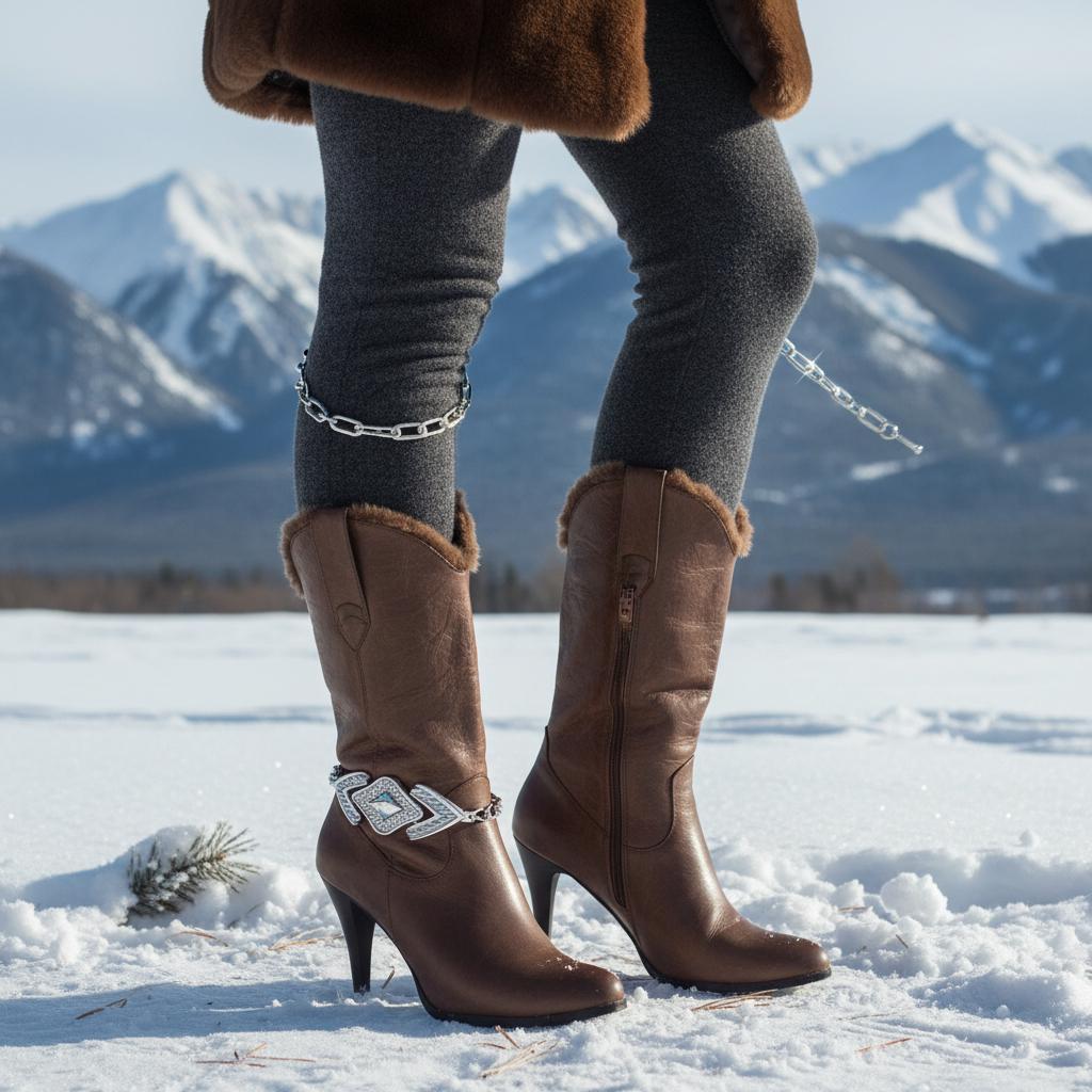 BC165 is a silver tone boot chain bracelet set made to turn everyday boots into a statement. It’s shiny, bold, and surprisingly easy to wear: metal links for texture and movement, plus an arrowhead-inspired centerpiece that makes the whole look feel intentional (like you planned your outfit days in advance, not five minutes ago).