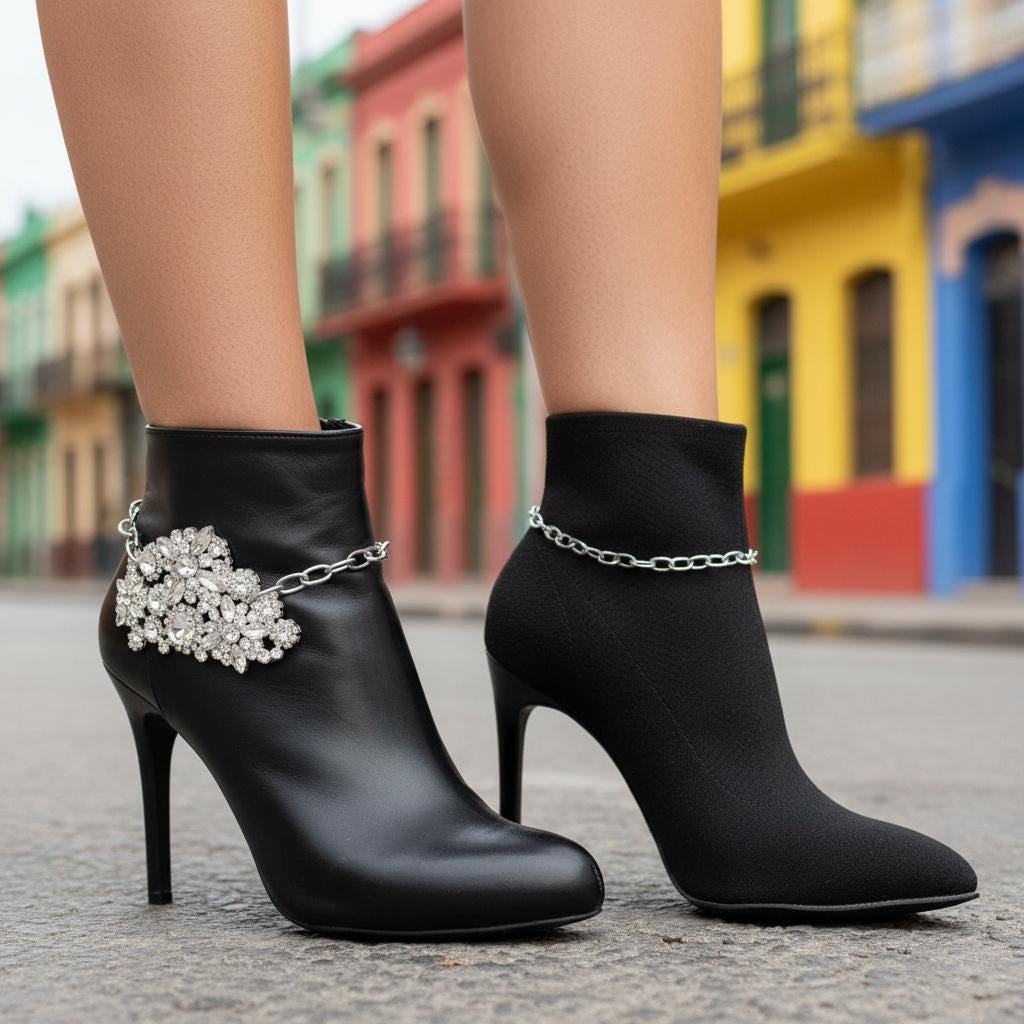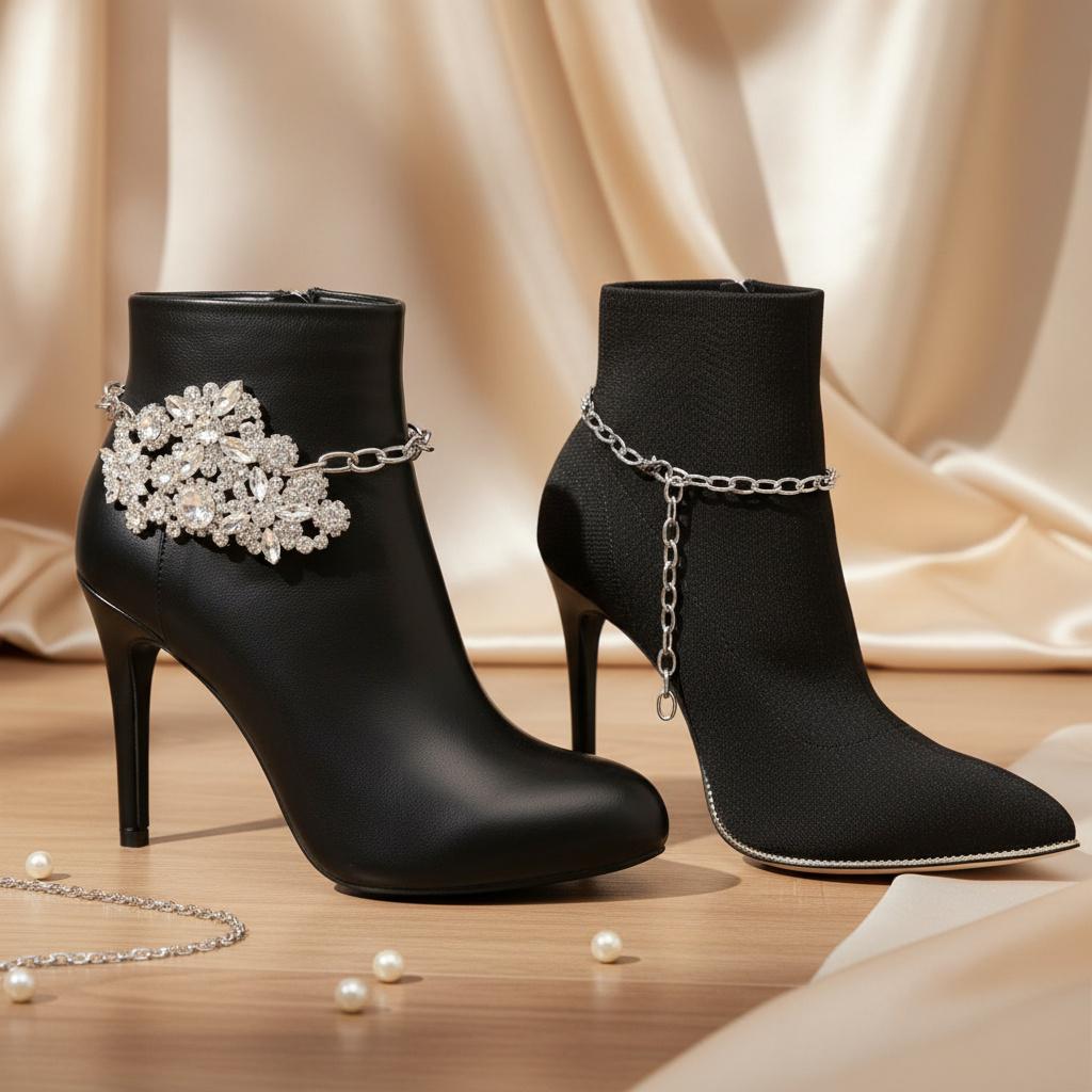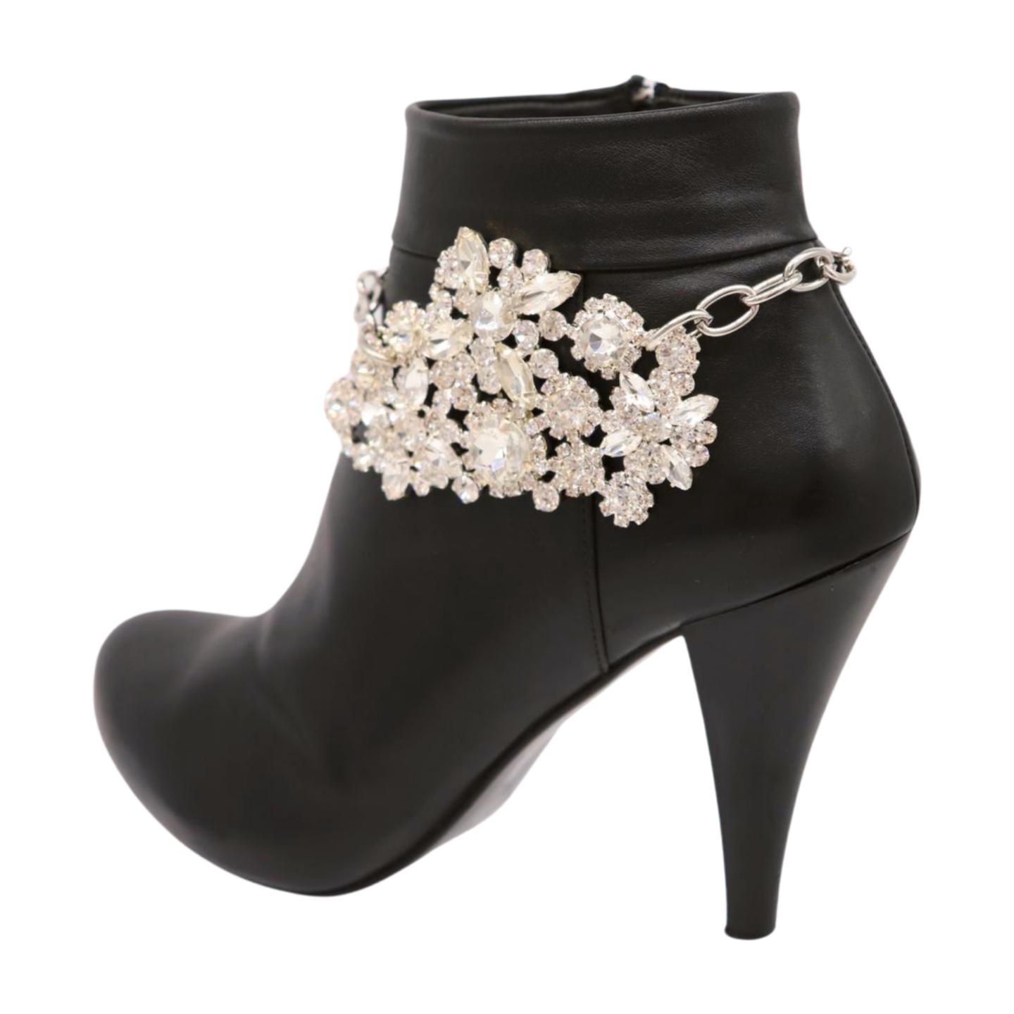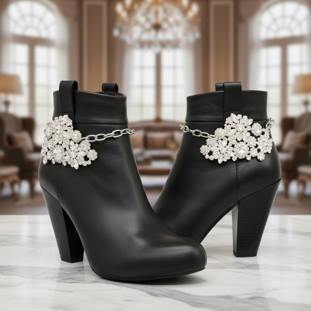 These boot bracelets are adjustable from approximately 11" to 15" per piece, so you can choose a comfortable drape around many ankle boots and booties. Styling tip: place the rhinestone flower cluster on the outer ankle for maximum sparkle and wear the chains with a slight drape rather than a tight fit. A little drape helps reduce tension and helps protect the chain during wear.