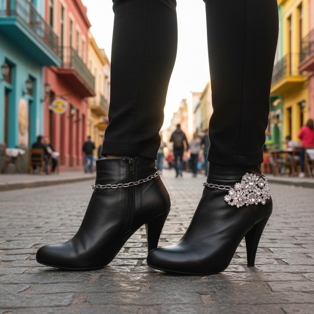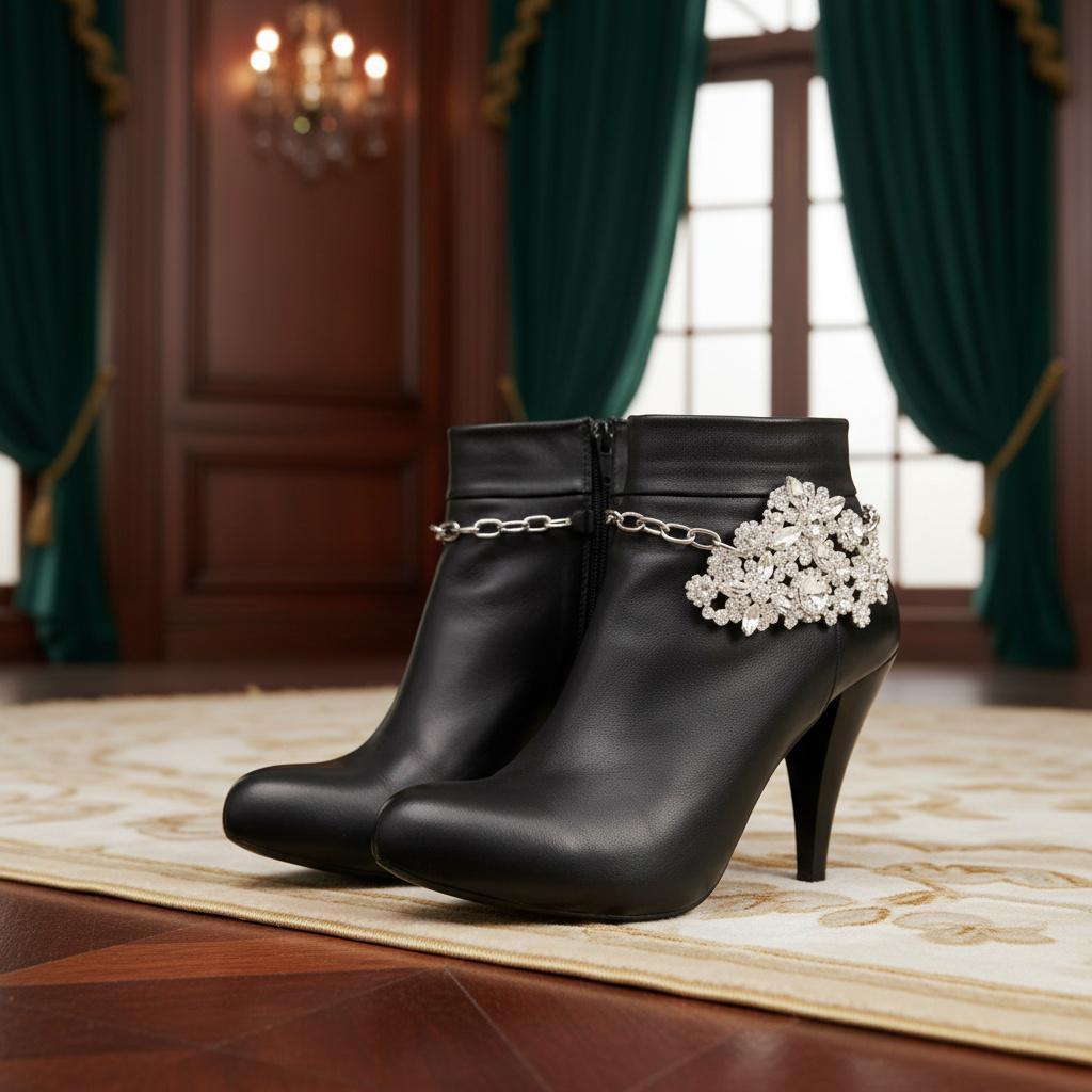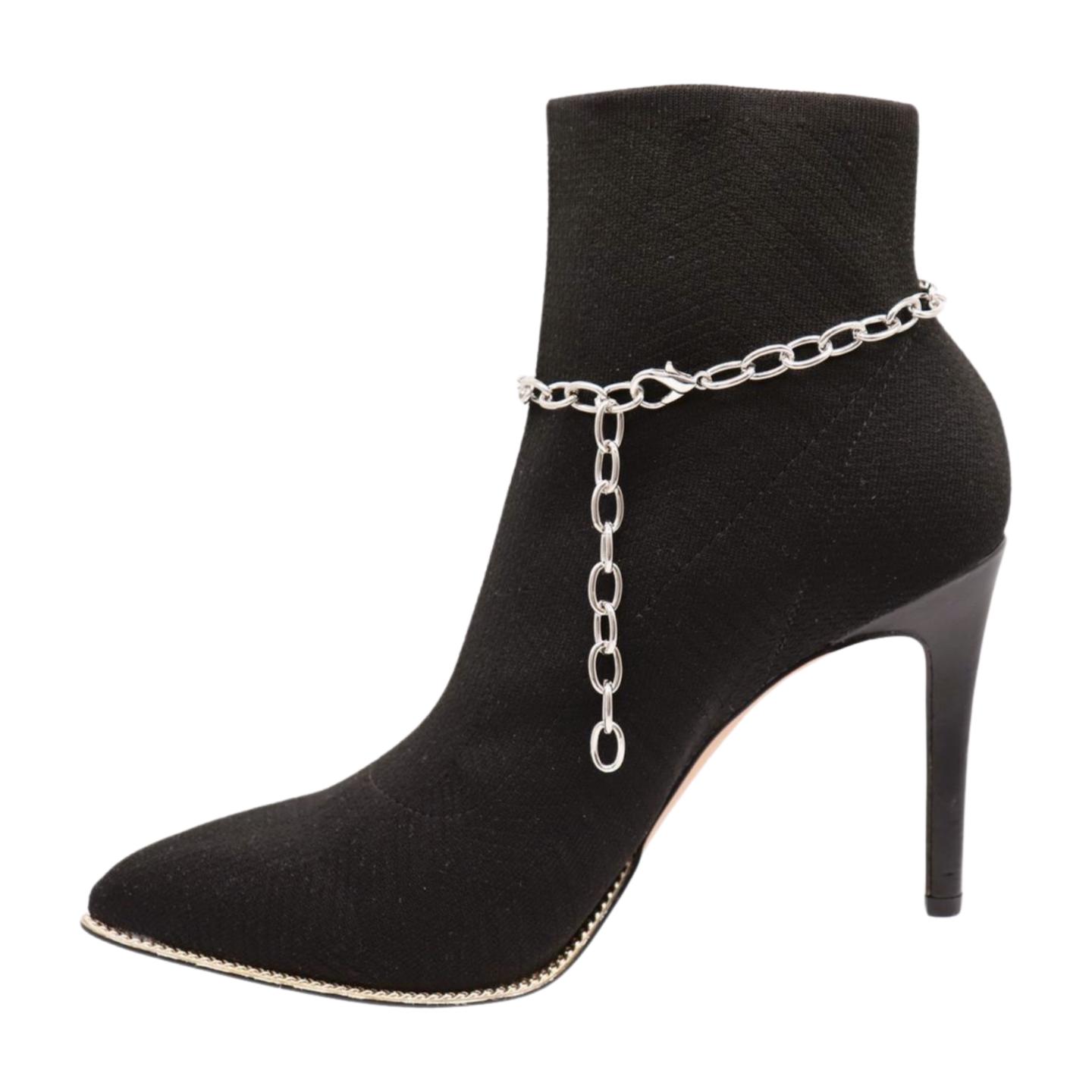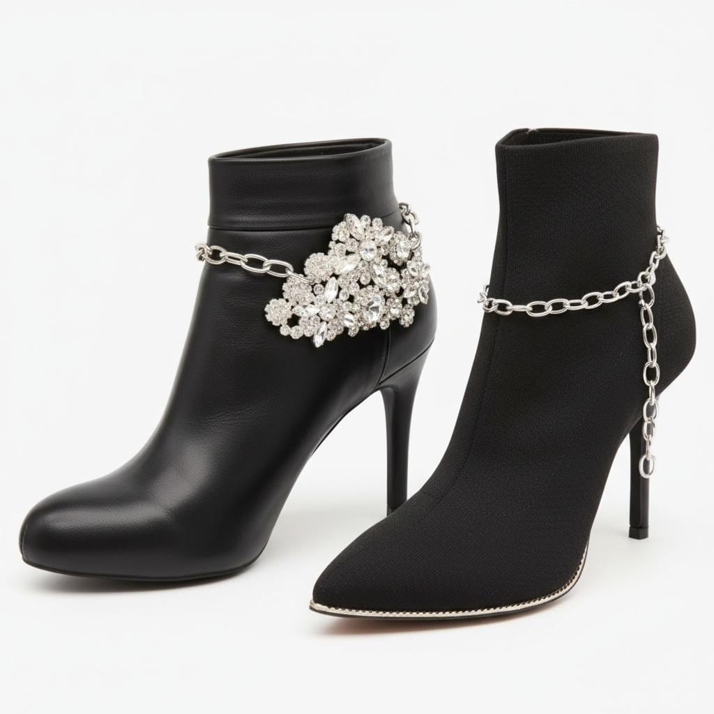 These boot bracelets are adjustable from approximately 11" to 15" per piece, so you can choose a comfortable drape around many ankle boots and booties. Styling tip: place the rhinestone flower cluster on the outer ankle for maximum sparkle and wear the chains with a slight drape rather than a tight fit. A little drape helps reduce tension and helps protect the chain during wear.