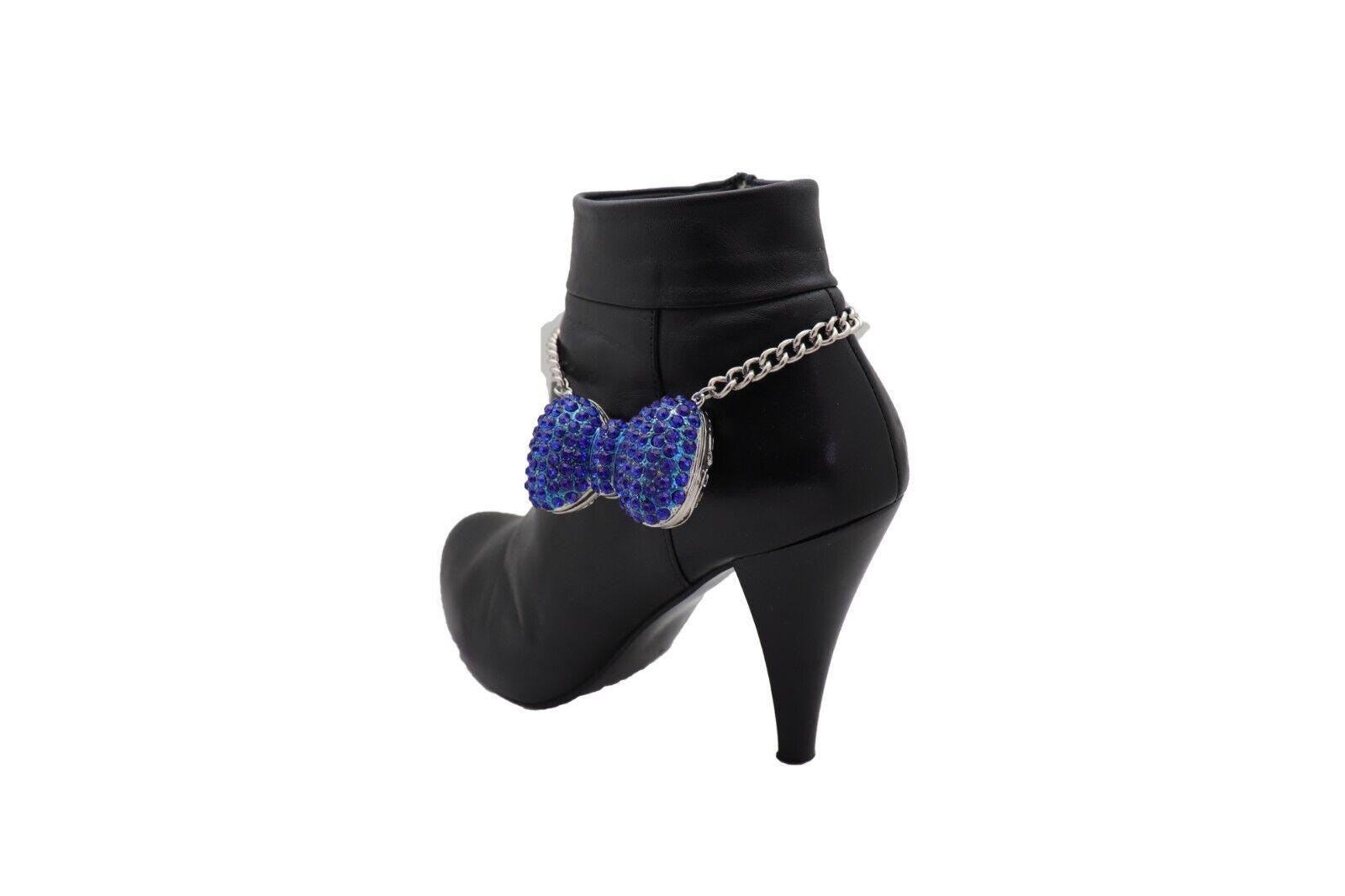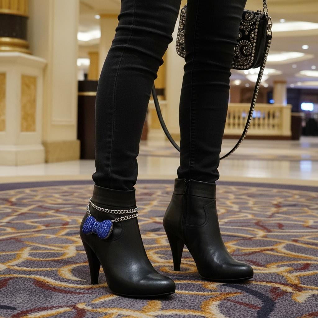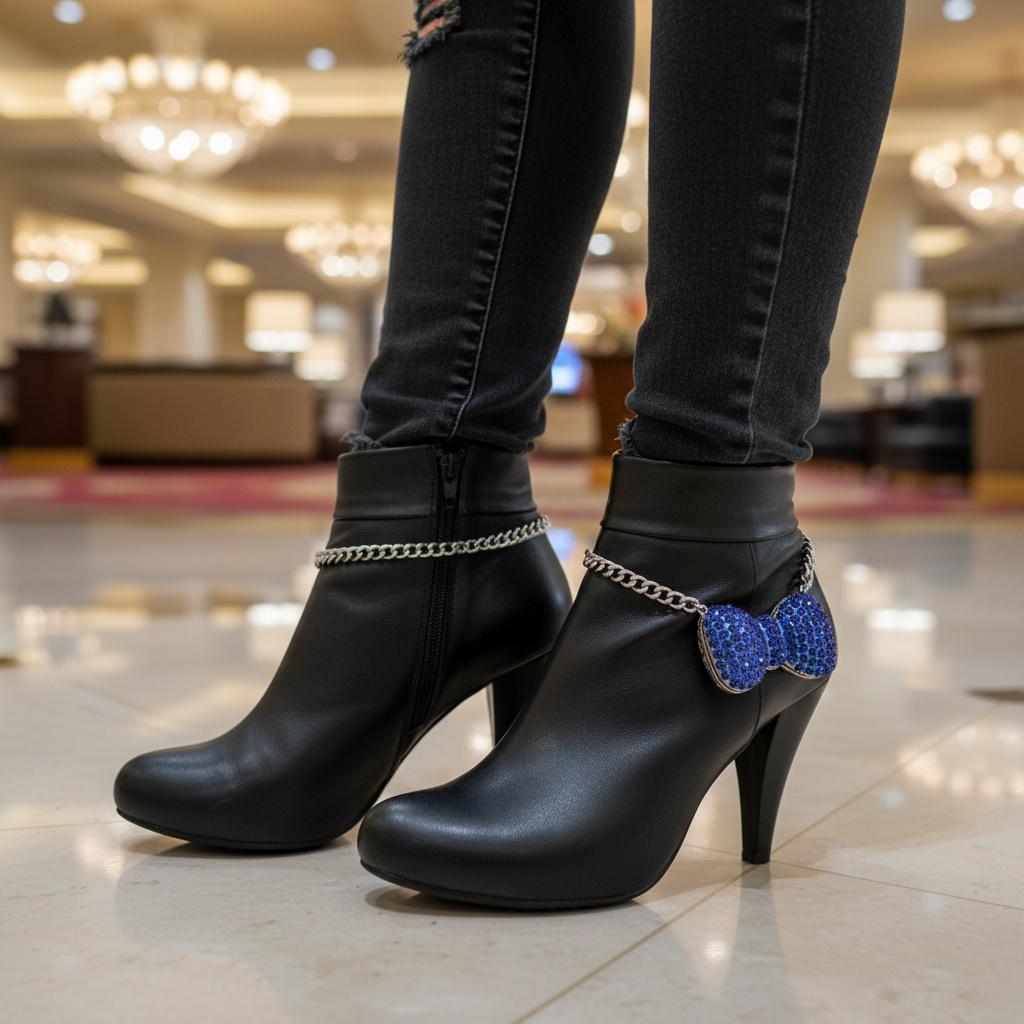 Meet BC186: the boot accessory that makes a simple outfit look styled in seconds. This listing is for a pair (2 pcs) of silver-tone boot chain bracelets—one for each side—finished with a bold blue rhinestone bow charm. The curb-chain style gives a clean, classic outline, while the bow adds the sparkle-pop that shows up beautifully in photos and in person.