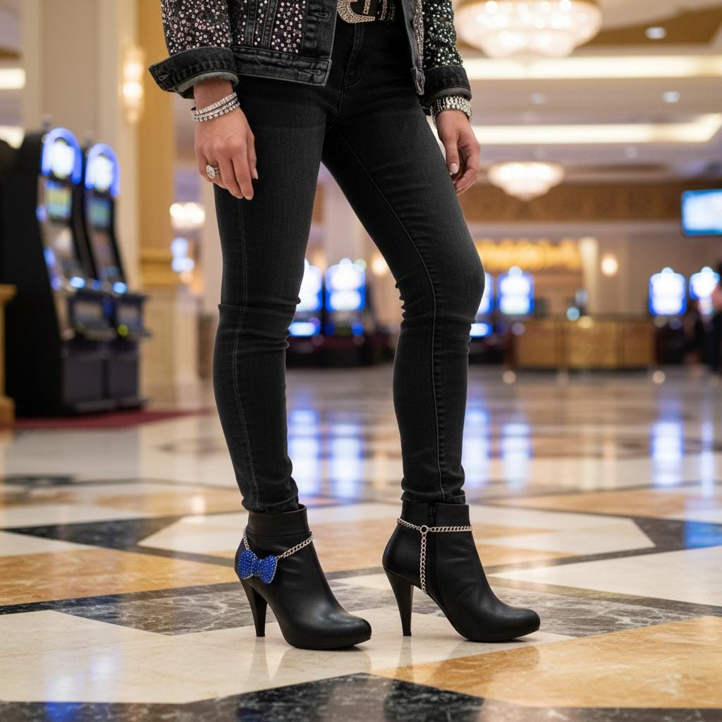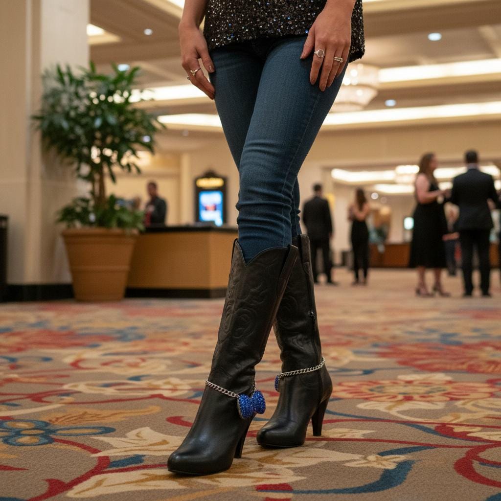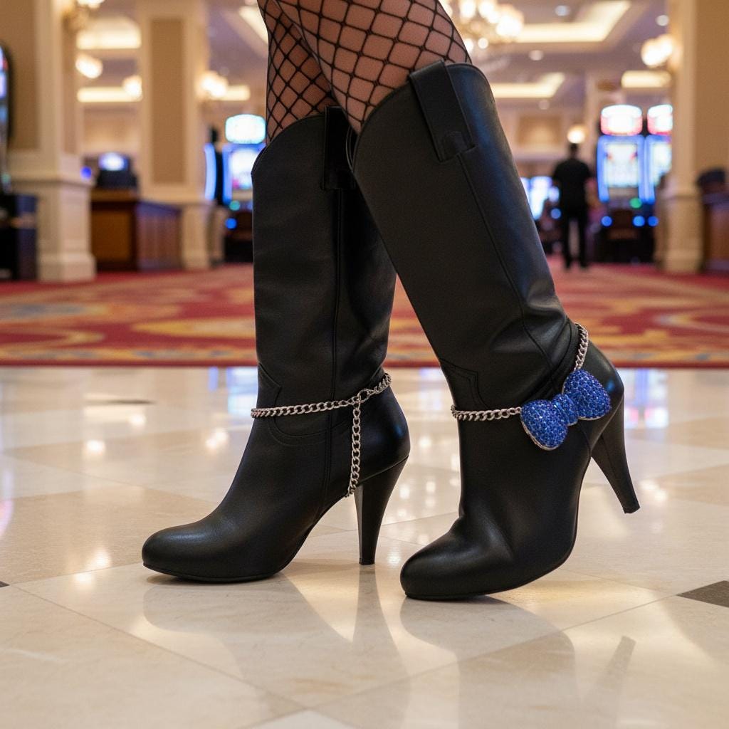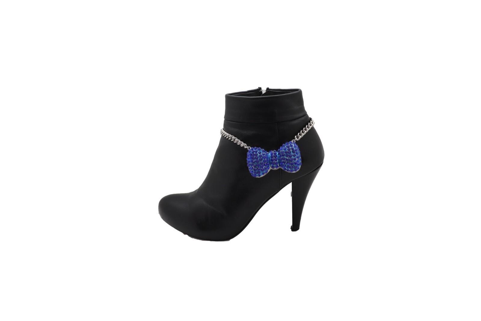 Meet BC186: the boot accessory that makes a simple outfit look styled in seconds. This listing is for a pair (2 pcs) of silver-tone boot chain bracelets—one for each side—finished with a bold blue rhinestone bow charm. The curb-chain style gives a clean, classic outline, while the bow adds the sparkle-pop that shows up beautifully in photos and in person.