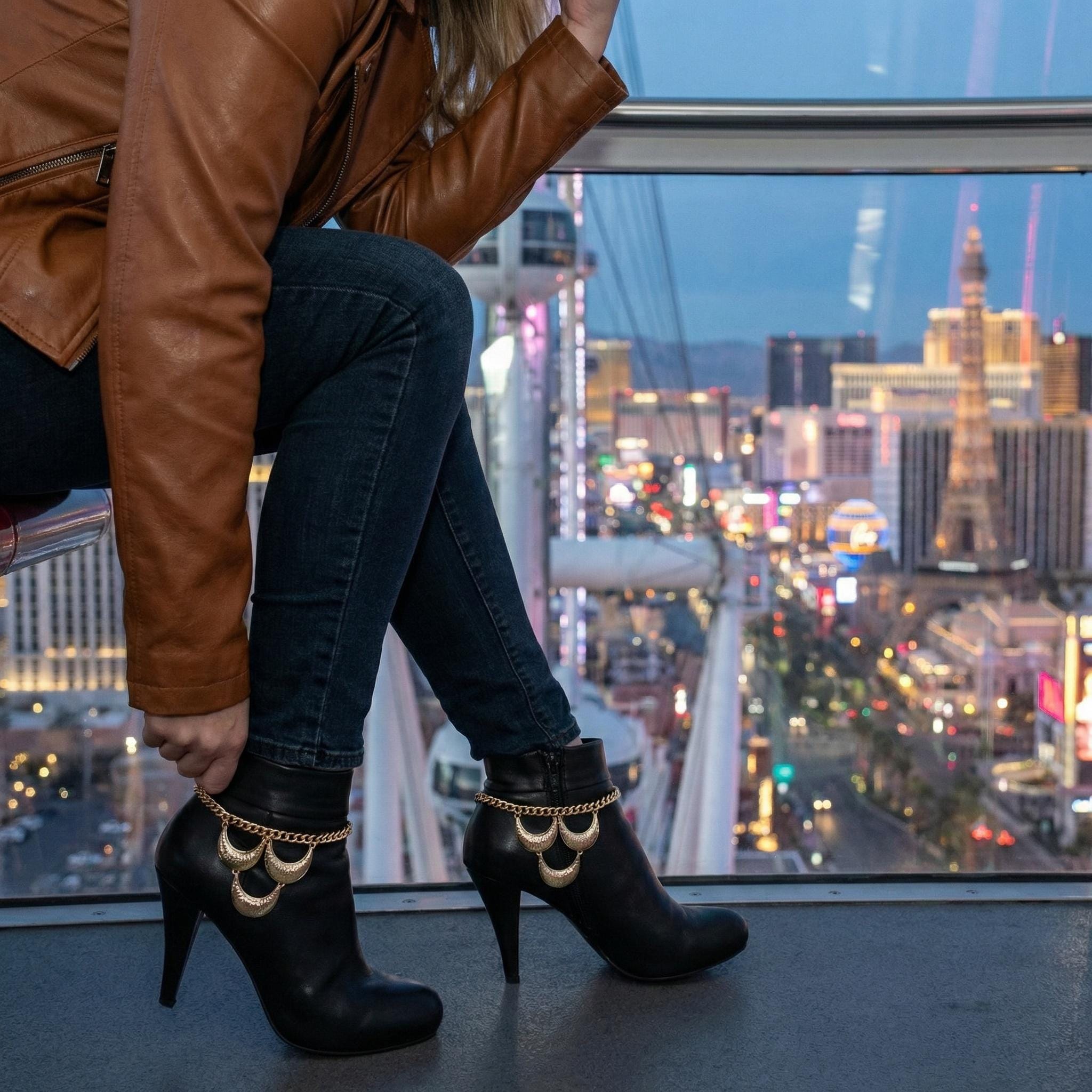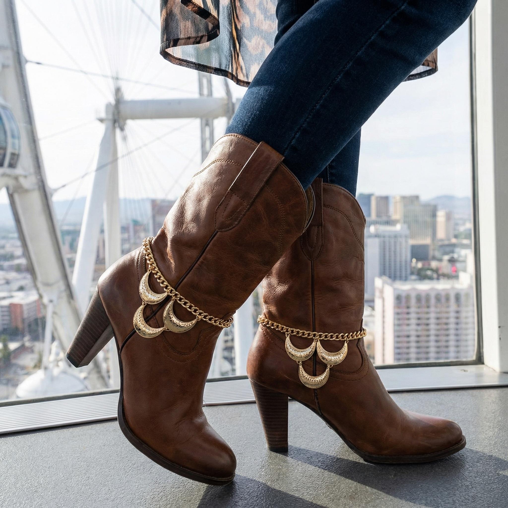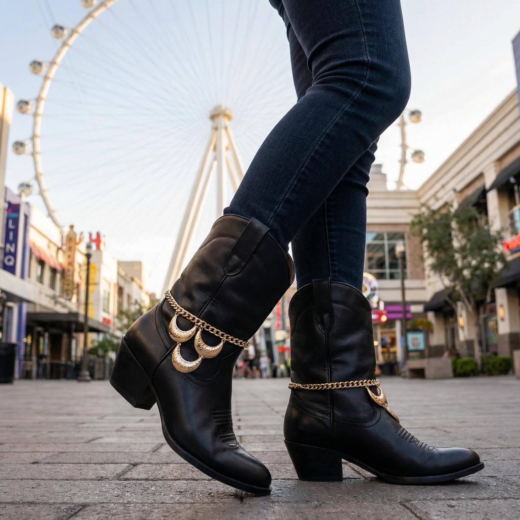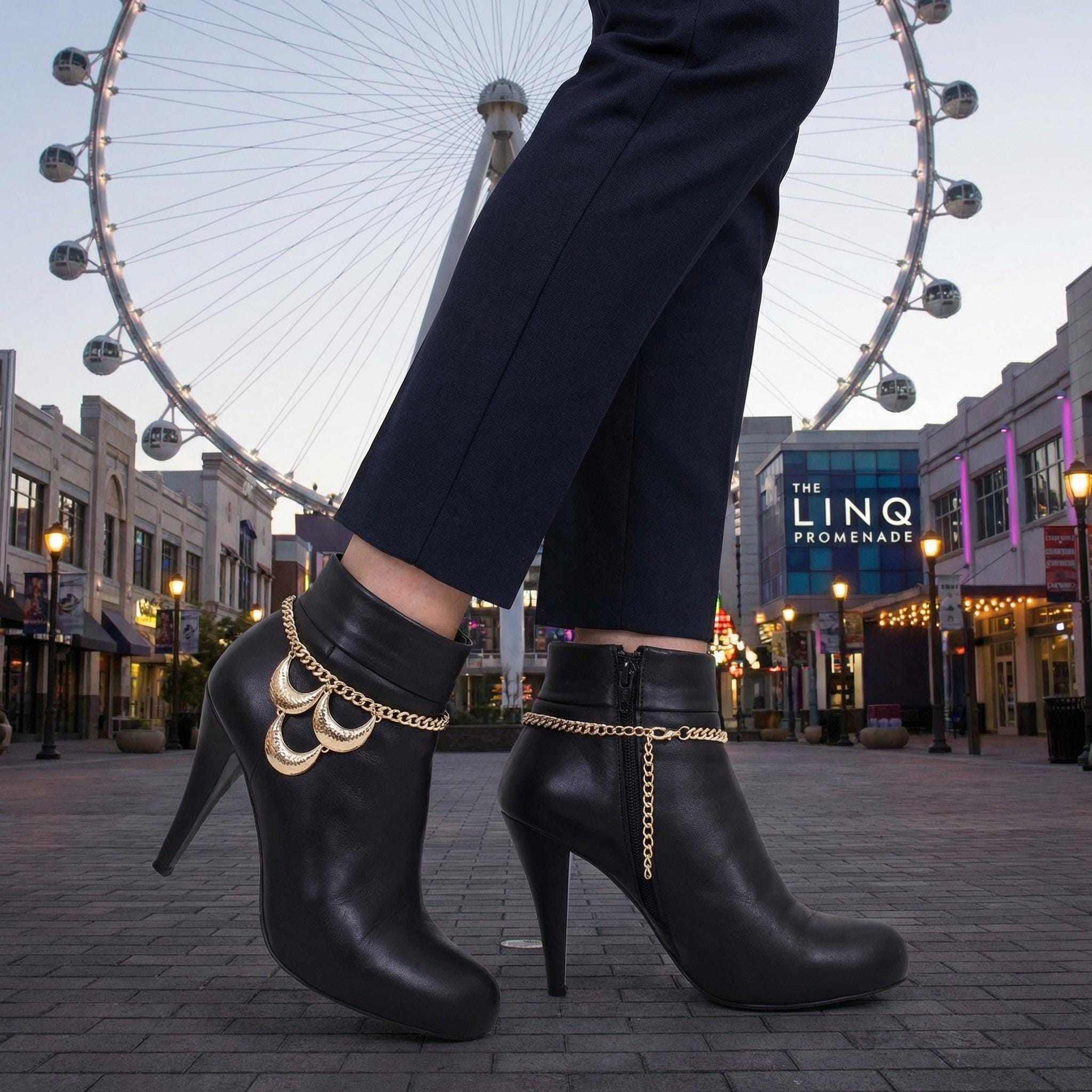 Turn your favorite boots into a styled statement in seconds. This handmade pair of gold-tone boot chain bracelets features layered crescent moon charms that add shine and movement—western-inspired, elegant, and photo-ready.