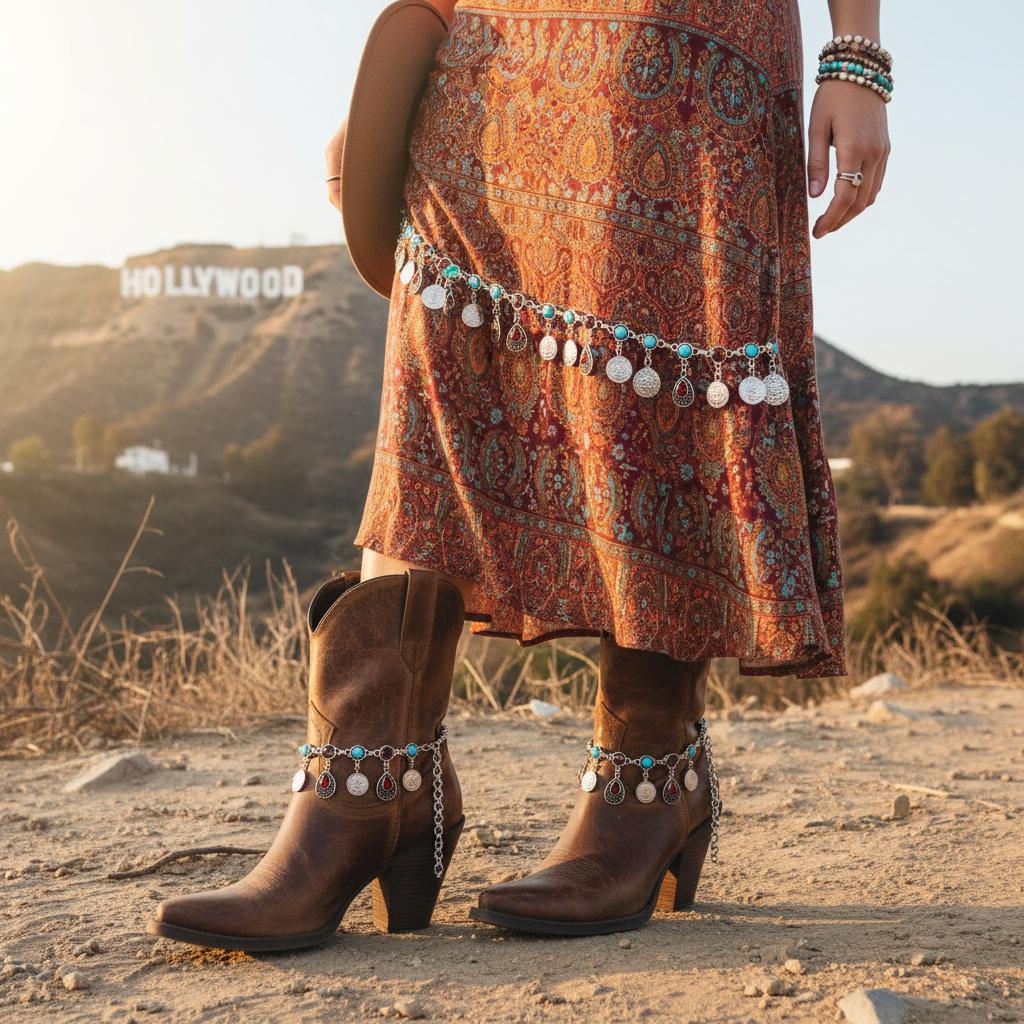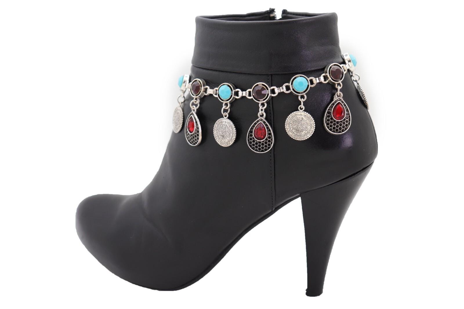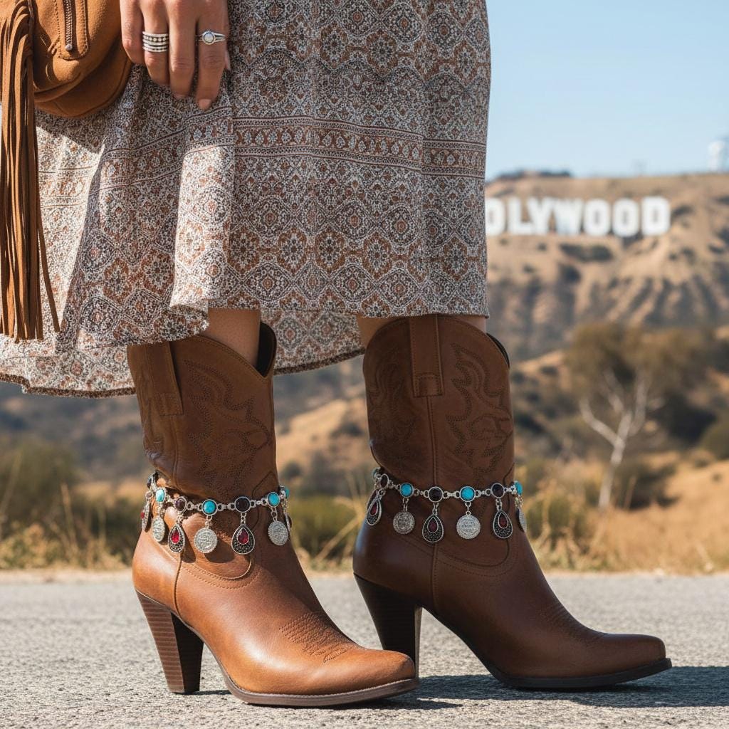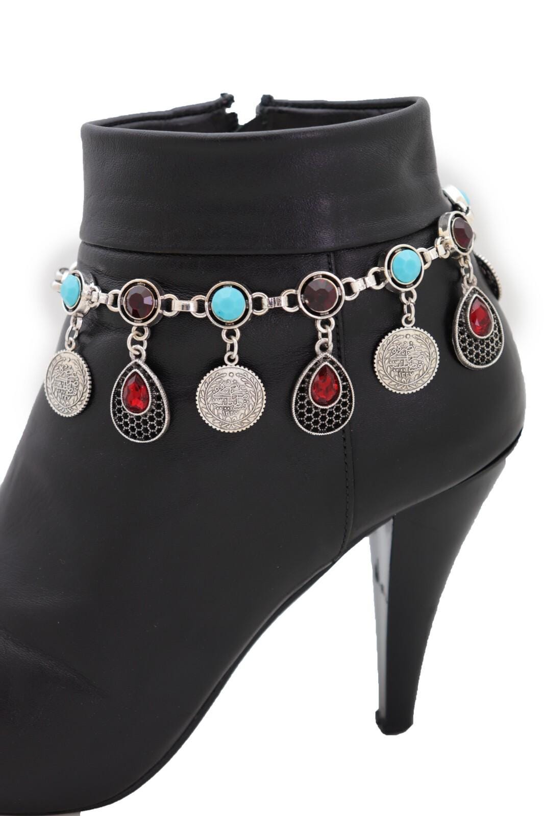 Meet BC190: a bold, movement-filled boot jewelry set designed to turn any pair of boots into a full outfit moment. This set features silver-tone chain links with turquoise-blue and deep red accents, finished with coin dangles and teardrop drops that swing beautifully as you walk. It’s the perfect detail for boho western styling, festival outfits, line dance nights, parties, photos, and day-to-night looks.