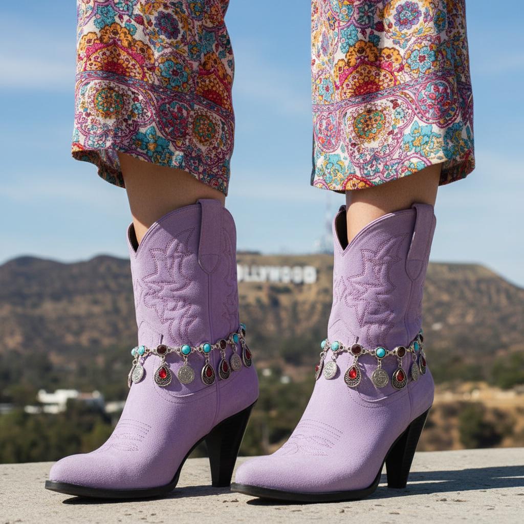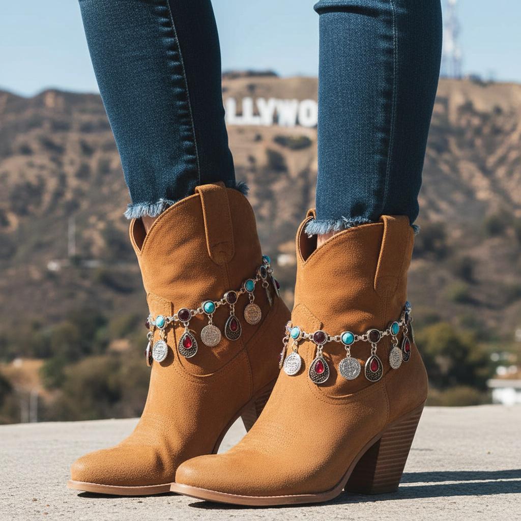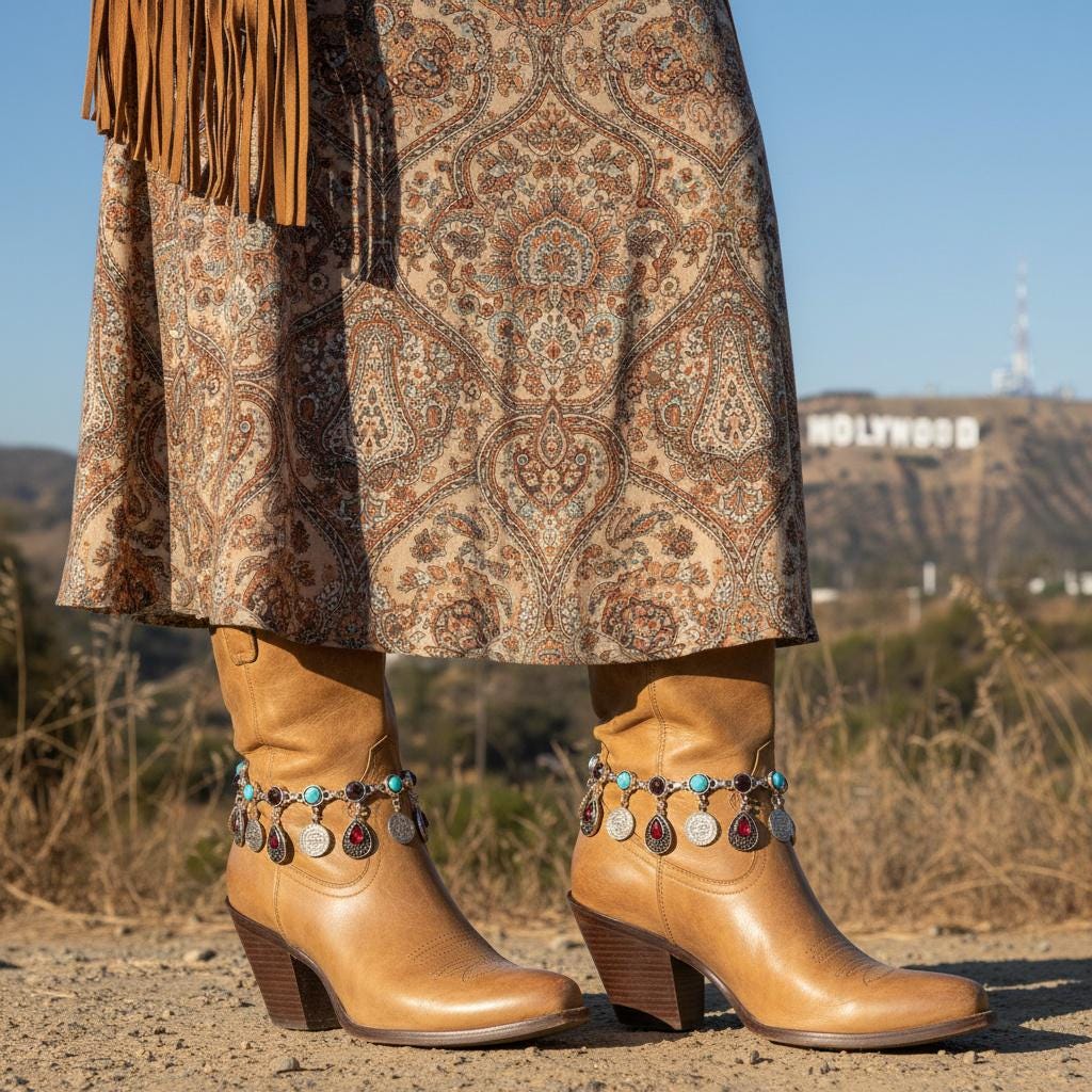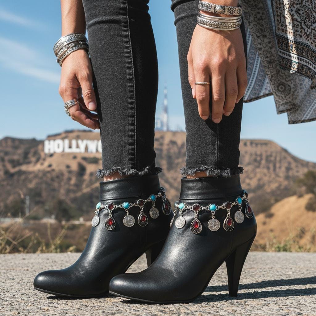 Meet BC190: a bold, movement-filled boot jewelry set designed to turn any pair of boots into a full outfit moment. This set features silver-tone chain links with turquoise-blue and deep red accents, finished with coin dangles and teardrop drops that swing beautifully as you walk. It’s the perfect detail for boho western styling, festival outfits, line dance nights, parties, photos, and day-to-night looks.