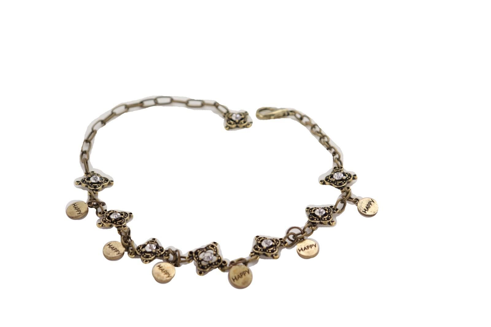 Handmade boot chain bracelet pair (2 pcs) in antique gold tone with rhinestones and “Happy” coin charms. Adjustable 11"–15" with a comfort drape fit tip.