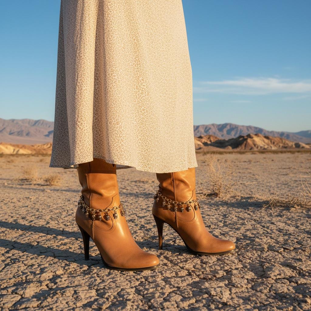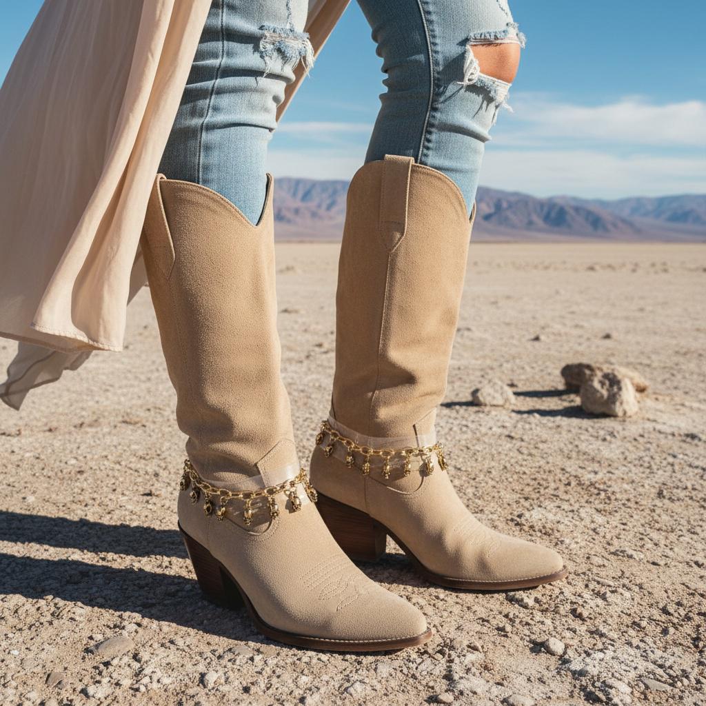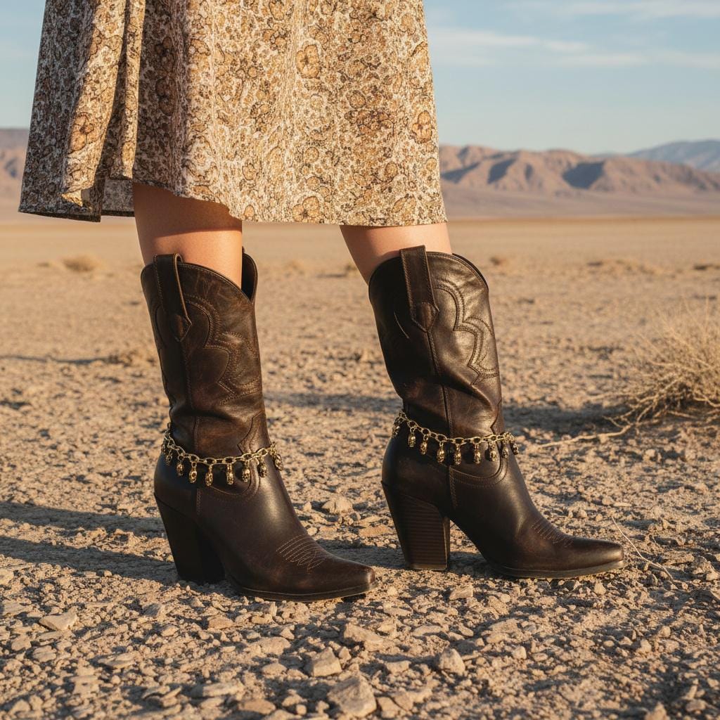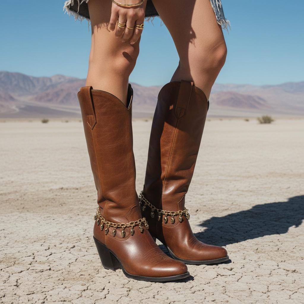 Each set includes two pieces (one for each boot). The length is adjustable from 11 to 15 inches using the extension chain, and if you want a more precise fit, we can customize the sizing by adding or removing links. For the best look and wear, style the chain with a slight drape around the boot rather than pulling it tight—chains are happiest when they can move.