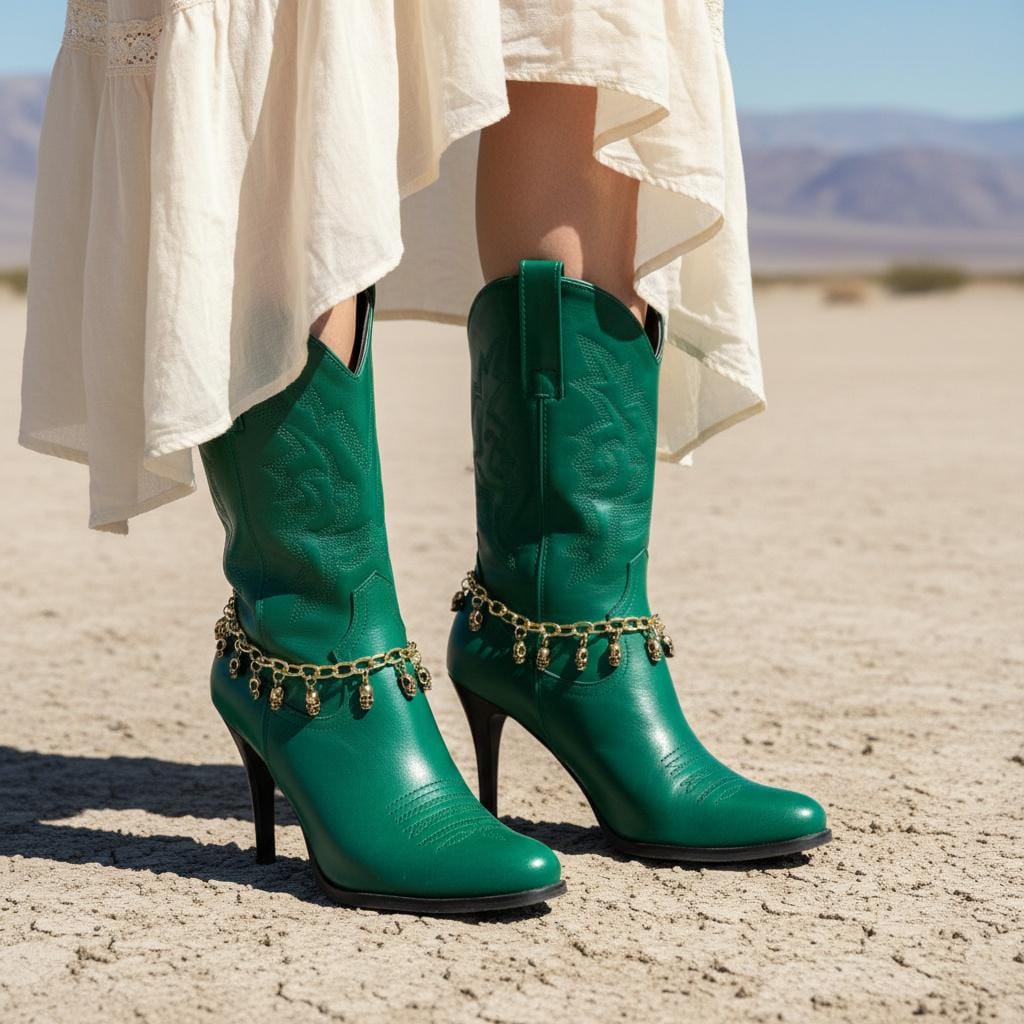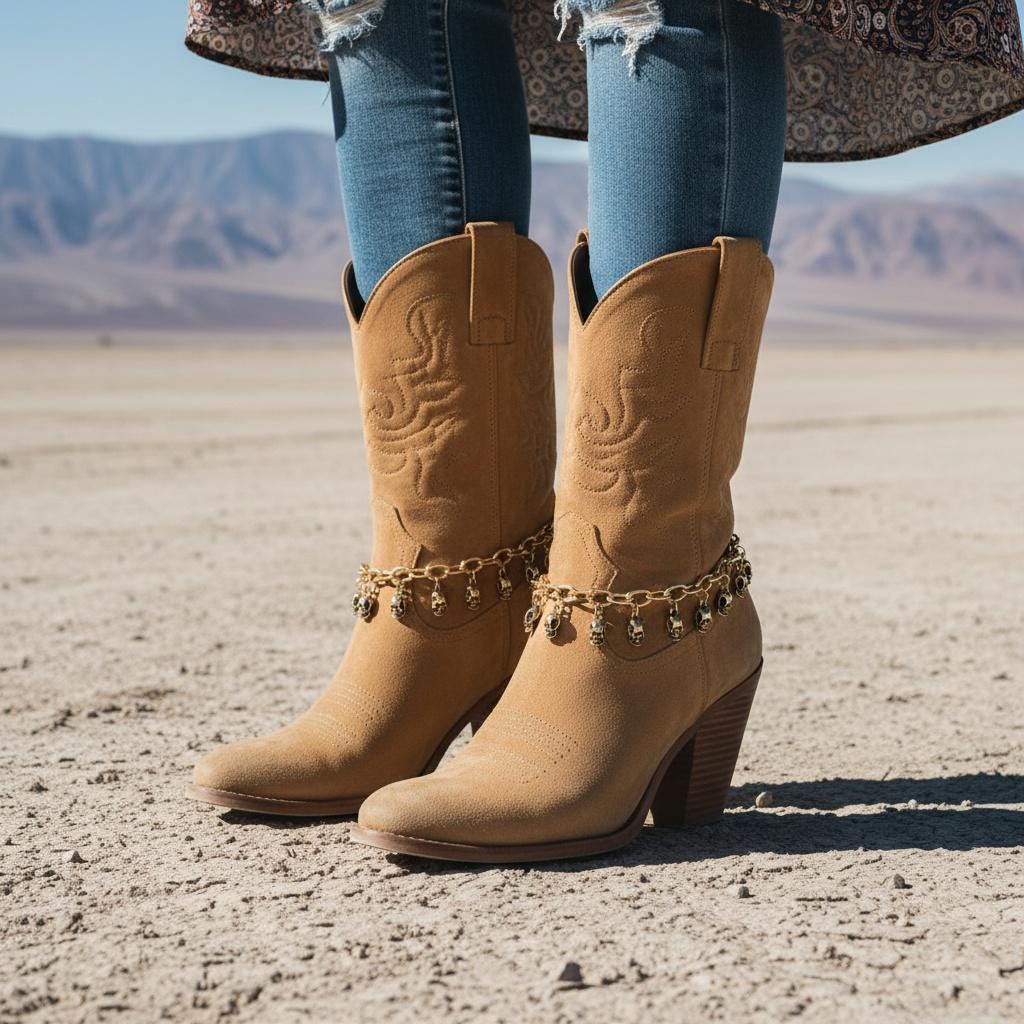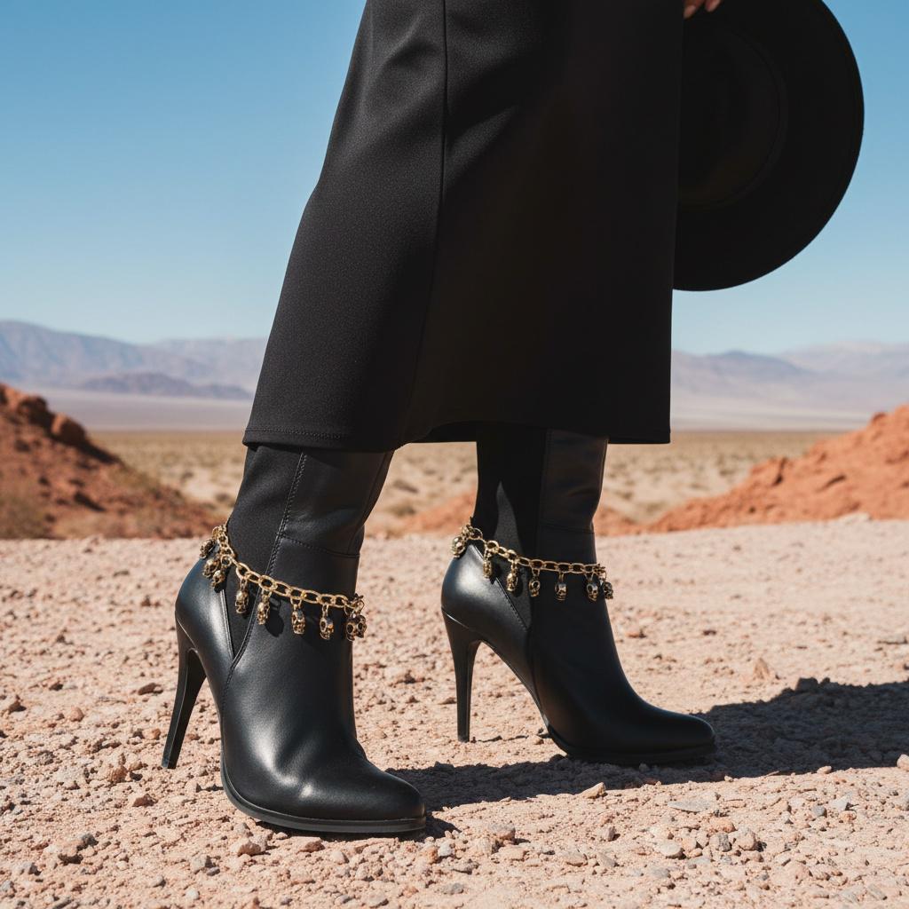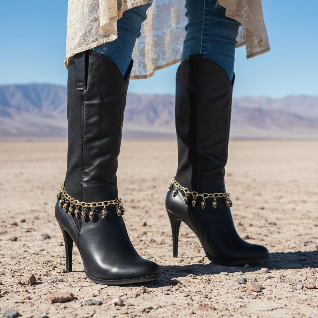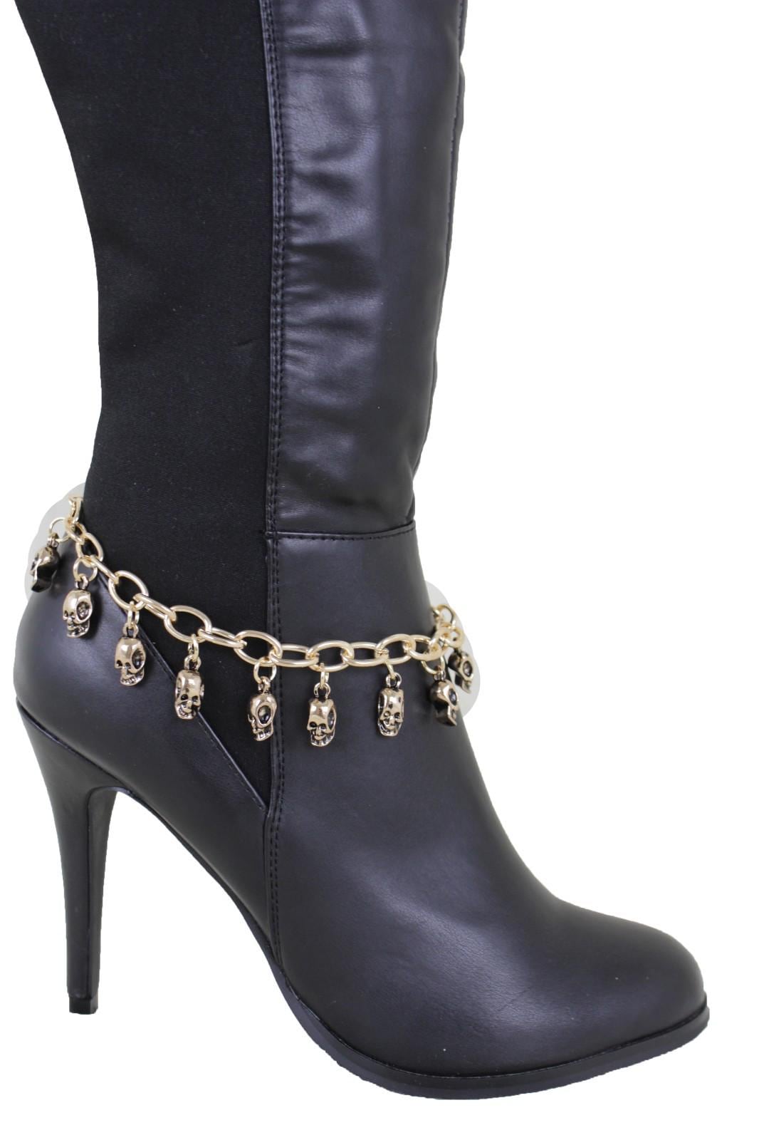 Meet BC205: the boot jewelry that adds just enough attitude to make your outfit feel planned. This is a matching pair of gold-tone boot chain bracelets with multiple mini skull dangles that swing when you walk. The look is equal parts western and edgy, with contrast detailing in the skulls that gives depth and a slightly vintage finish. It’s the kind of accessory that turns basic boots into “where did you get those?” boots.