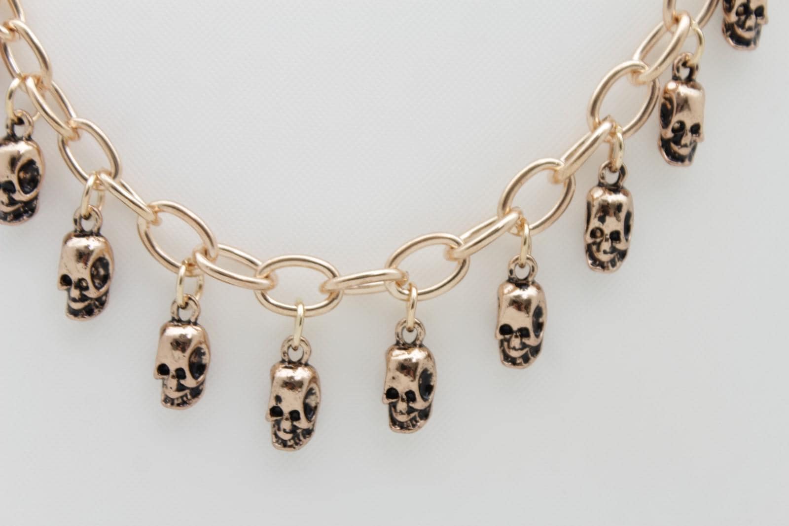 finish/color: gold-tone chain with mini skull dangles (dark recessed detail)