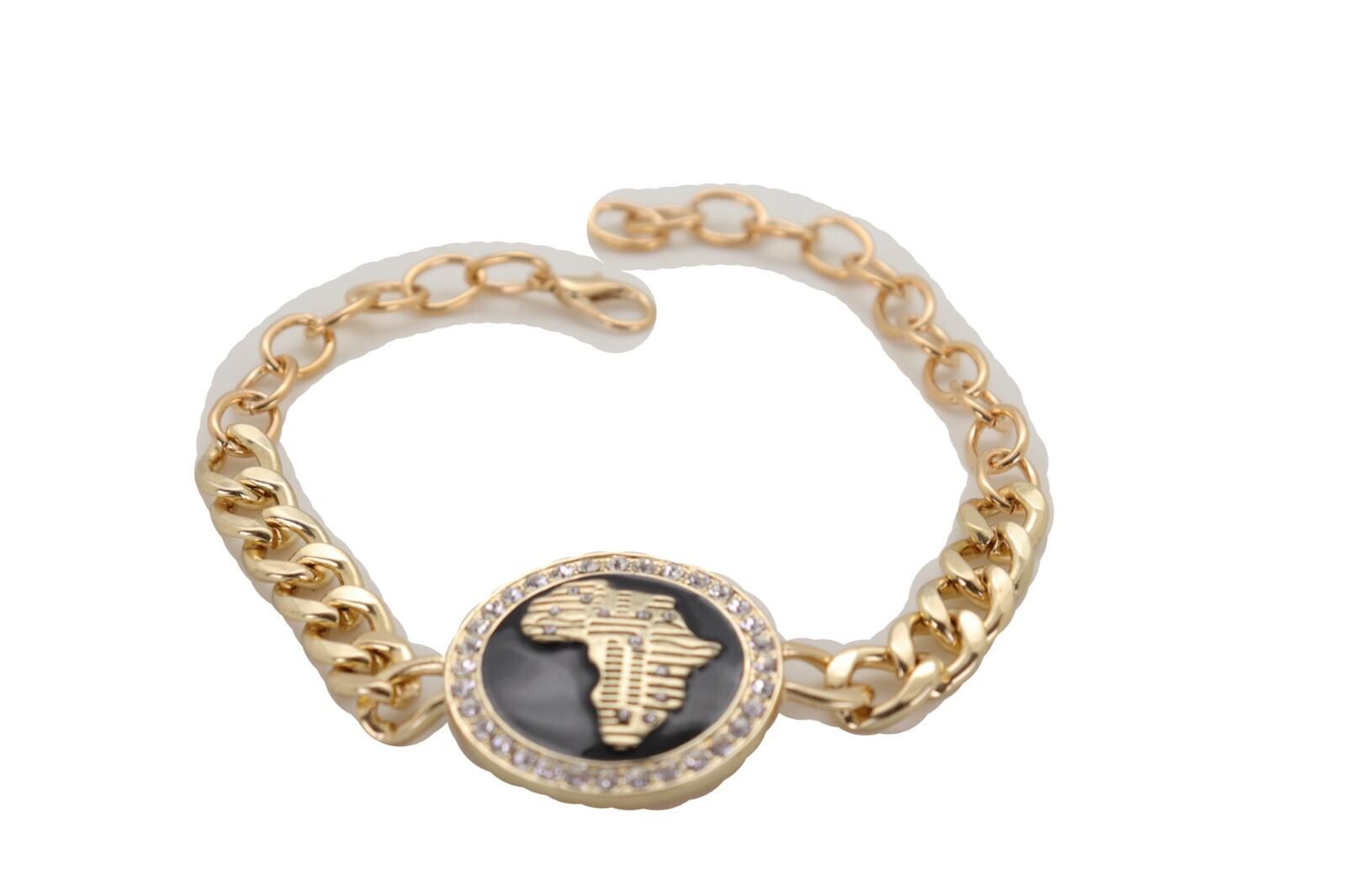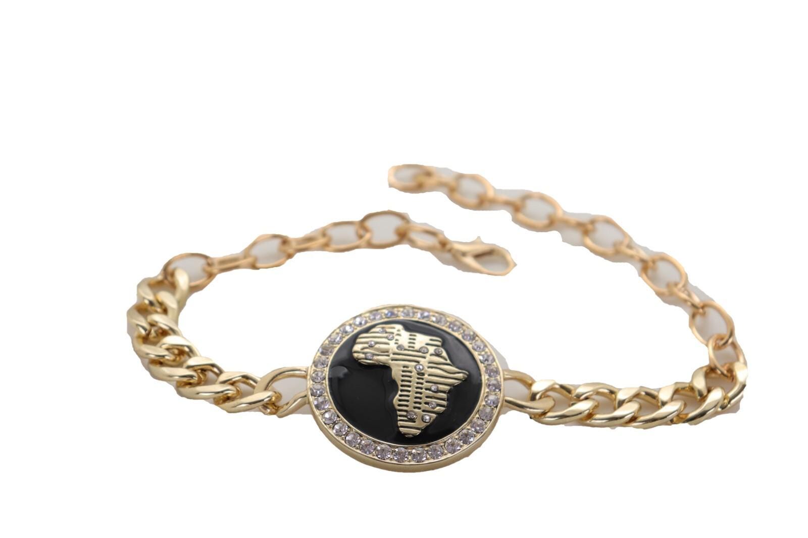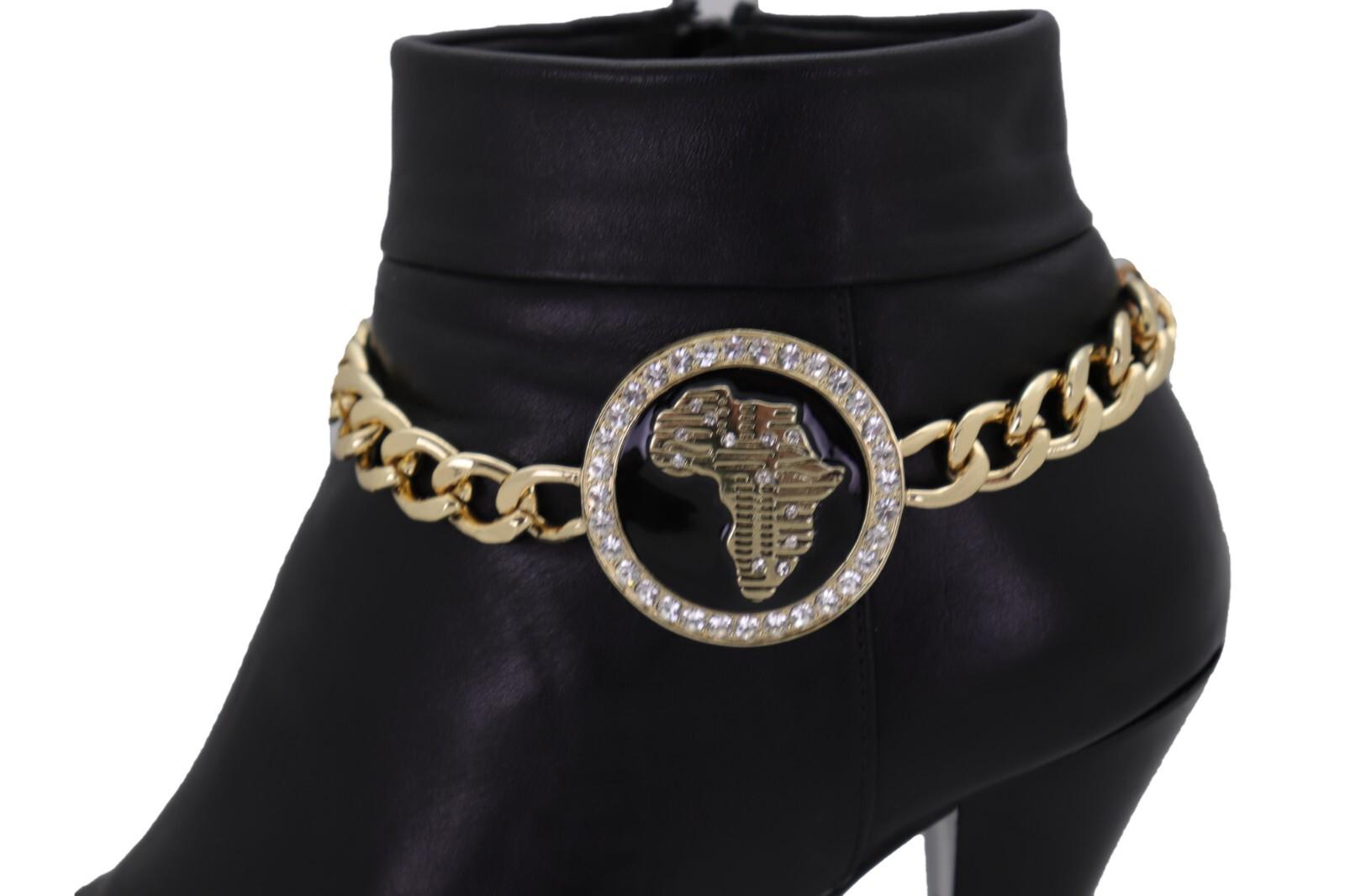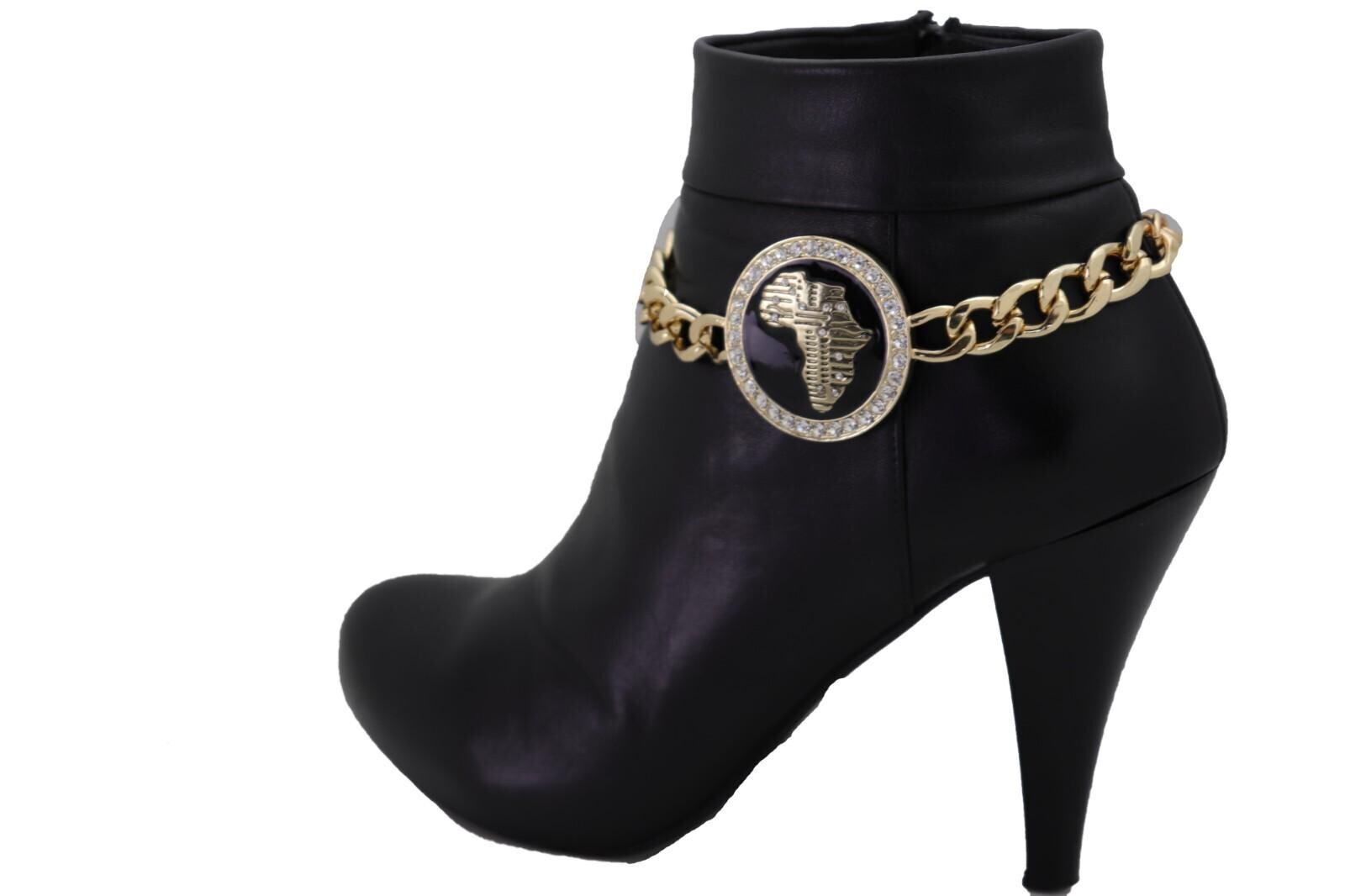 This BC208 handmade boot chain bracelet pair is a bold gold-tone boot accessory set designed to add a polished western-glam finish to your favorite boots. Each piece features a round medallion charm with an Africa continent silhouette, framed with clear rhinestones and black accent detail for a high-contrast look that stands out beautifully on black, brown, tan, and colorful boots.