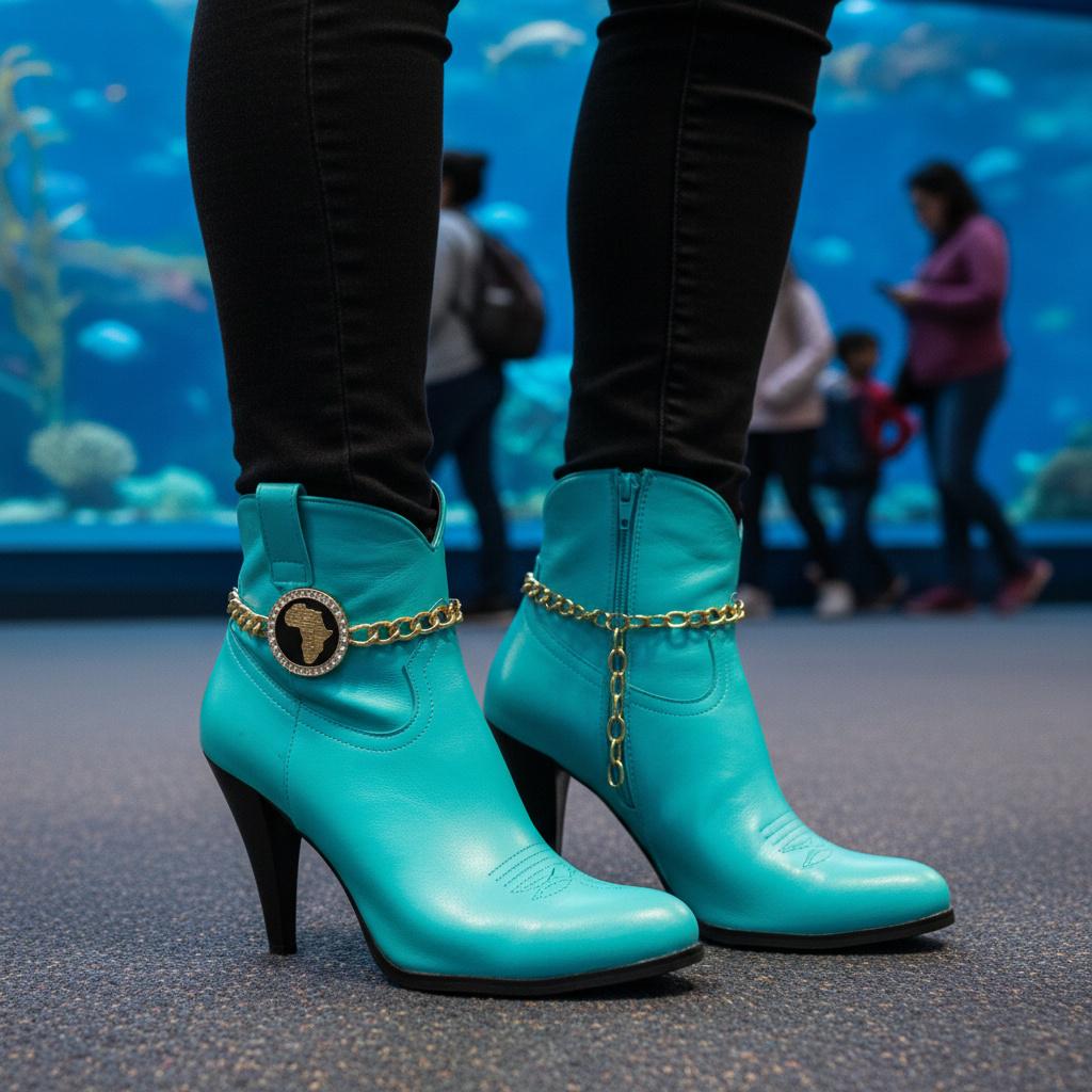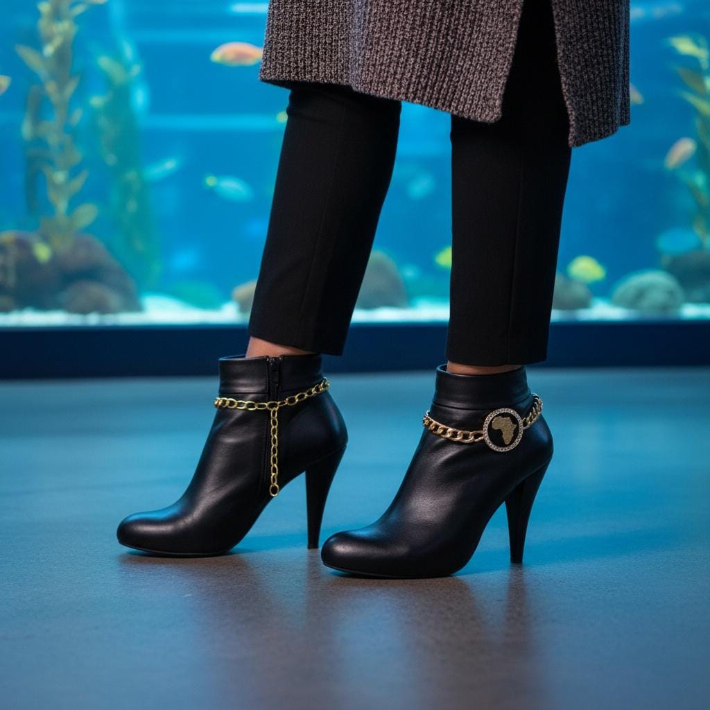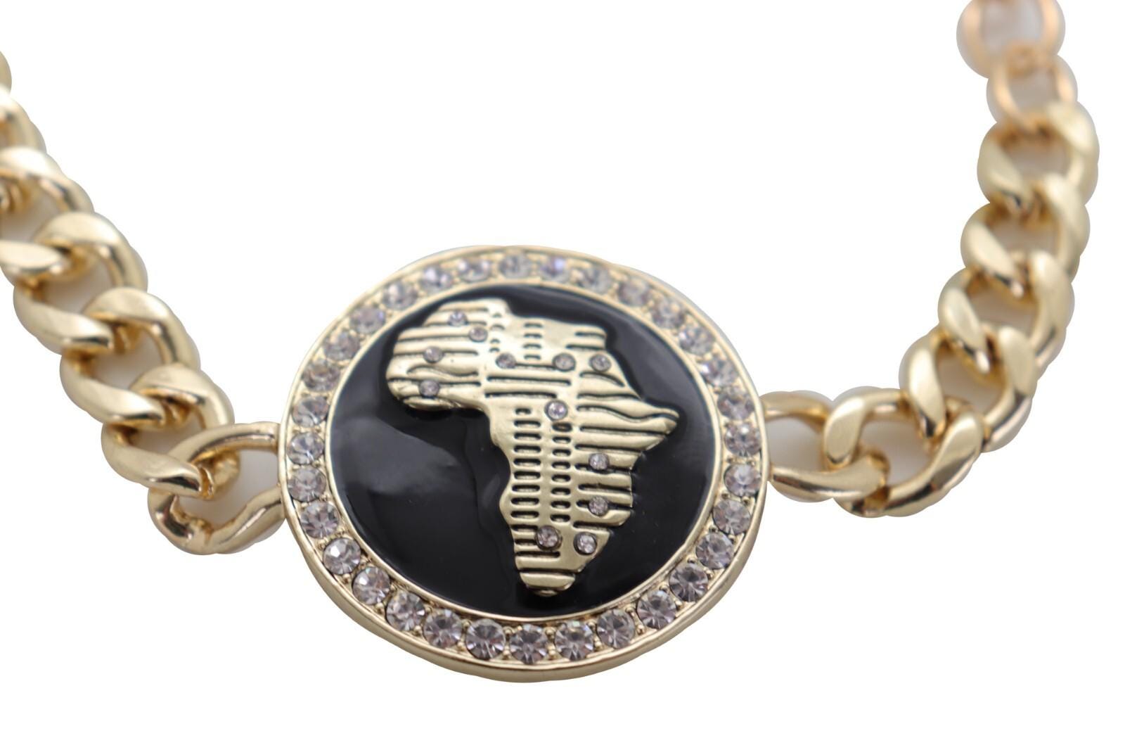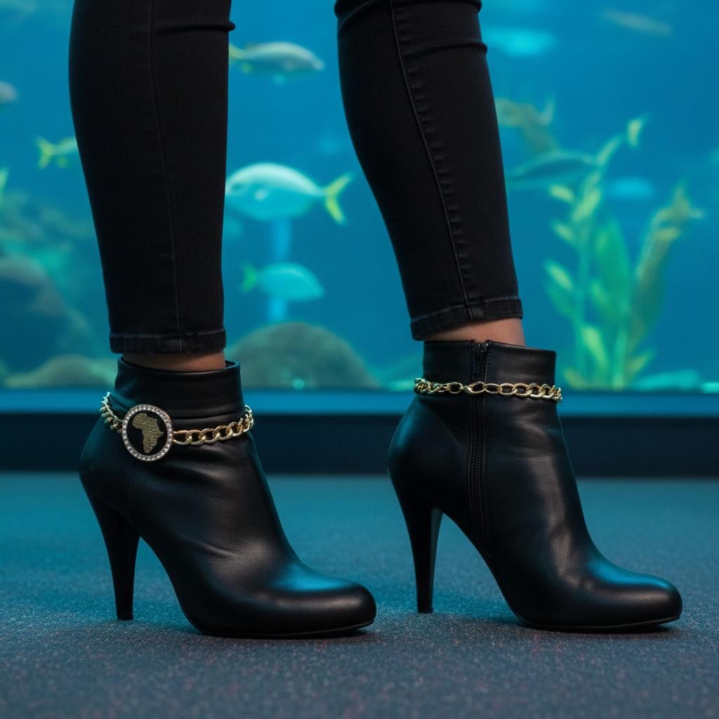 This BC208 handmade boot chain bracelet pair is a bold gold-tone boot accessory set designed to add a polished western-glam finish to your favorite boots. Each piece features a round medallion charm with an Africa continent silhouette, framed with clear rhinestones and black accent detail for a high-contrast look that stands out beautifully on black, brown, tan, and colorful boots.