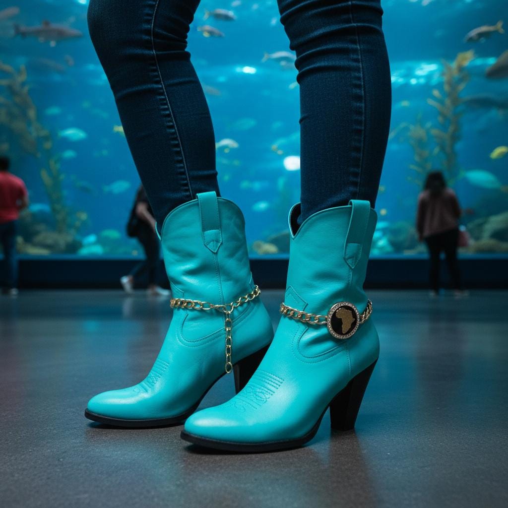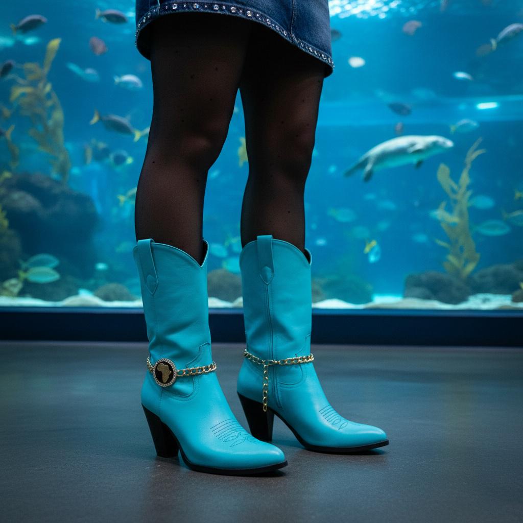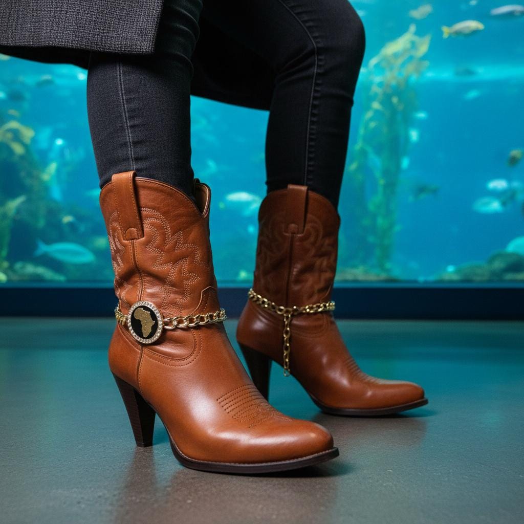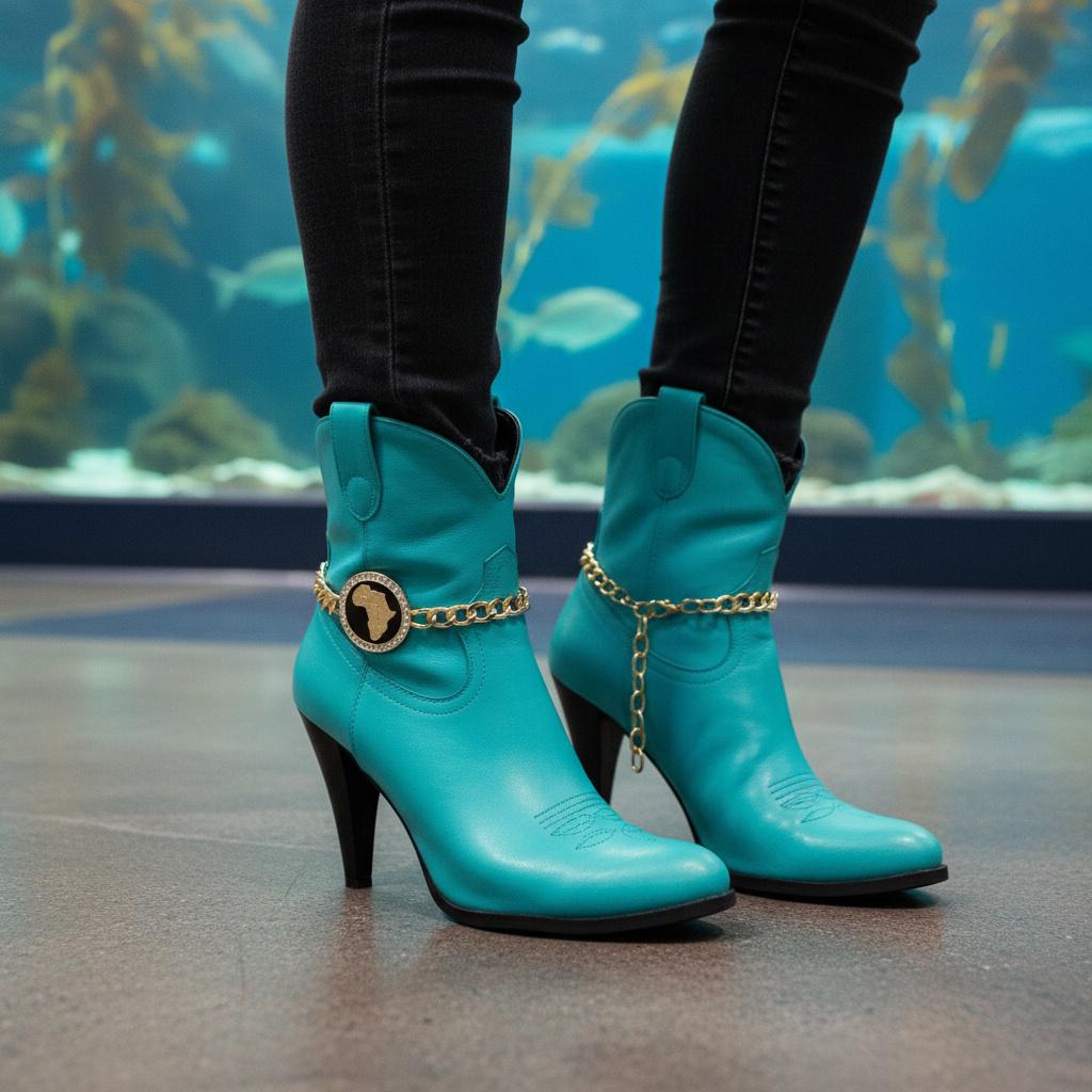 This BC208 handmade boot chain bracelet pair is a bold gold-tone boot accessory set designed to add a polished western-glam finish to your favorite boots. Each piece features a round medallion charm with an Africa continent silhouette, framed with clear rhinestones and black accent detail for a high-contrast look that stands out beautifully on black, brown, tan, and colorful boots.