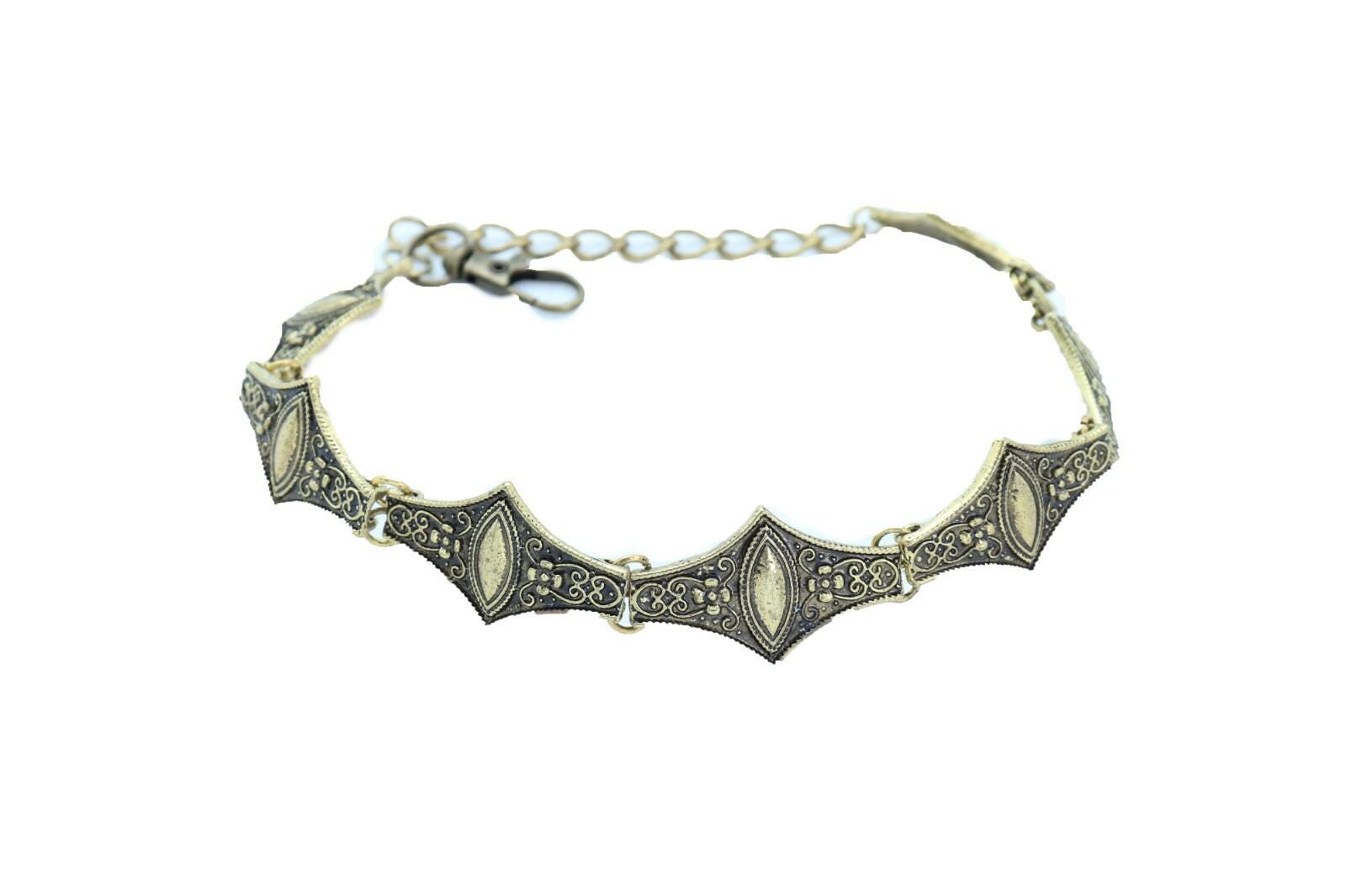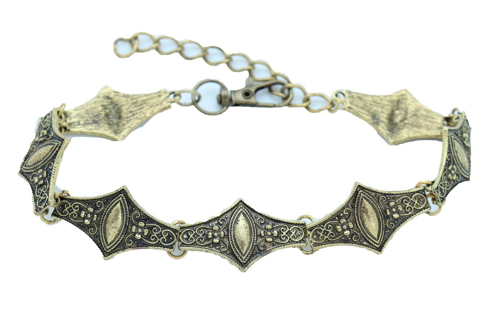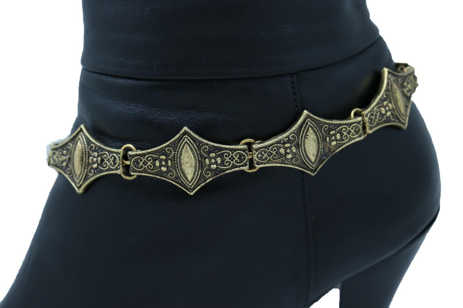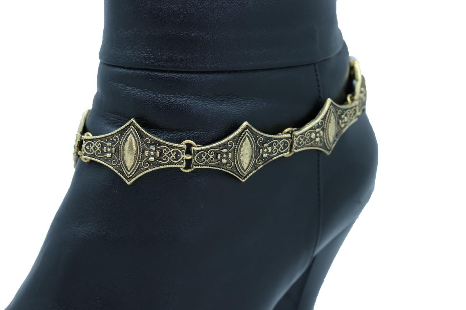 BC209 is a handmade antique gold-tone boot chain bracelet pair designed with ornate filigree-style linked panels and a marquise “eye” motif that gives the whole piece a vintage, rustic, old-world finish. The antiqued detailing adds depth so the pattern stands out beautifully against black boots, brown boots, tan boots, and classic western styles.